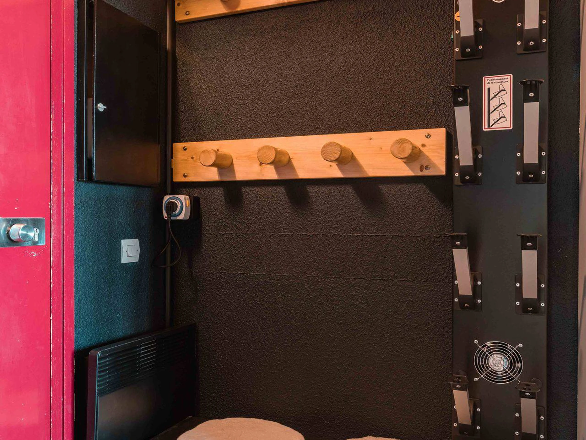 Im angrenzenden Schlafzimmer befindet sich ein Fernseher. Im Eingangsbereich steht ein Schuhtrockner bereit.