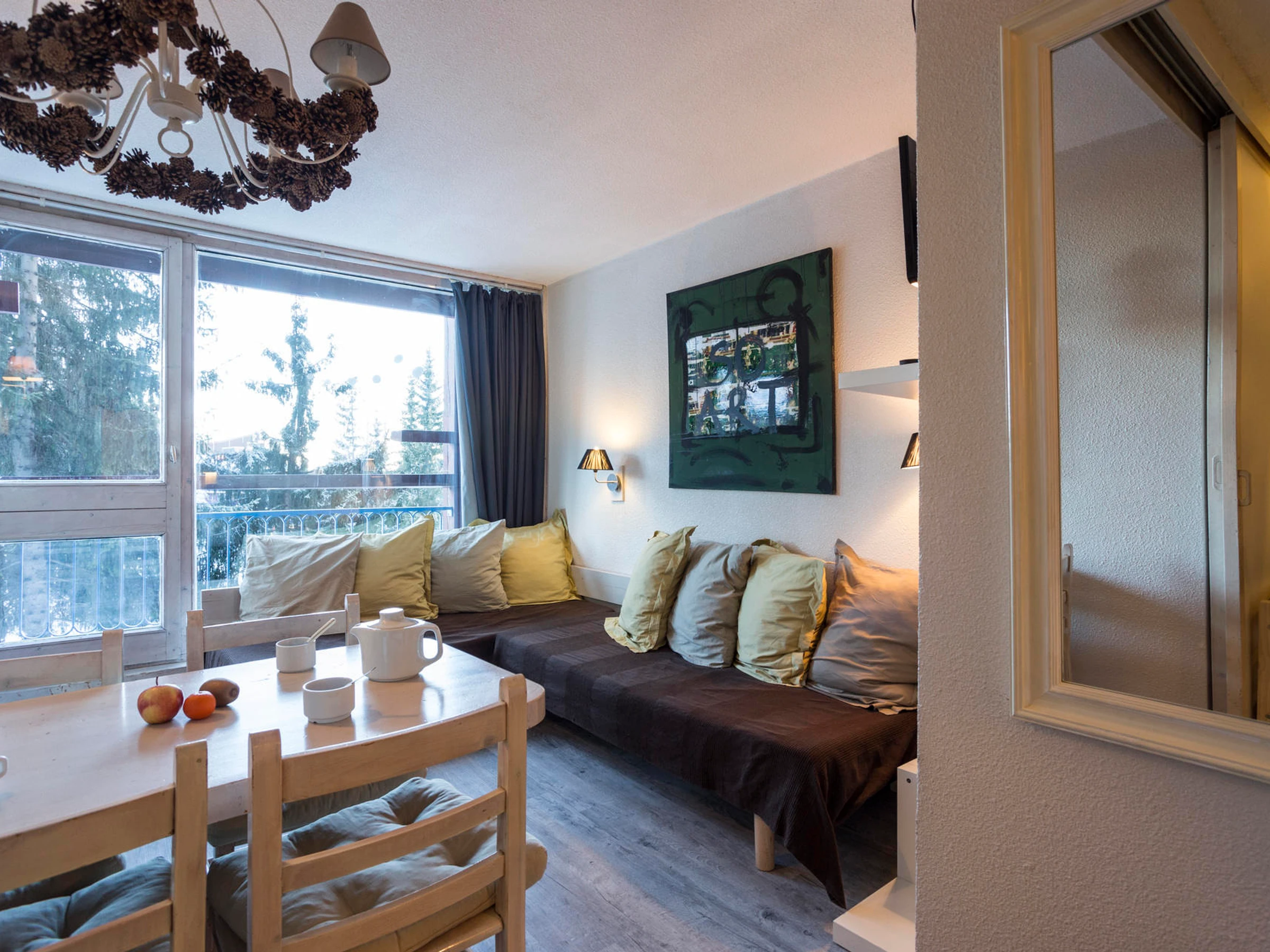 25 m² großes Studio-Apartment für 4 Personen, Südwestlage, im 6. Stock der Residenz Belles Challes du Charvet, direkt an den Pisten und Geschäften. Mit Balkon.