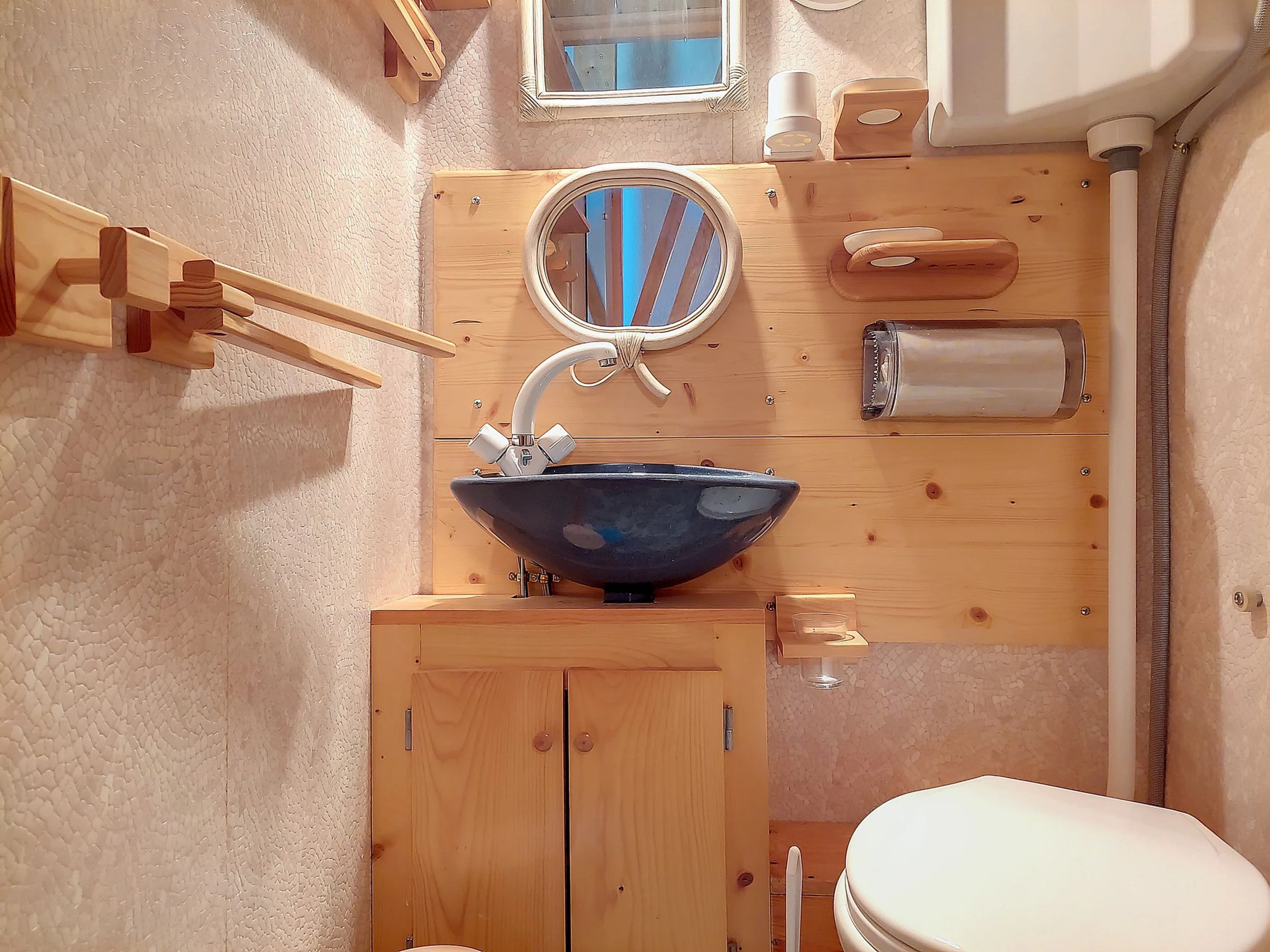 Ein Badezimmer mit Badewanne und WC befindet sich im Erdgeschoss. Ein separates WC befindet sich im ersten Stock und eine Waschmaschine auf der Galerie.