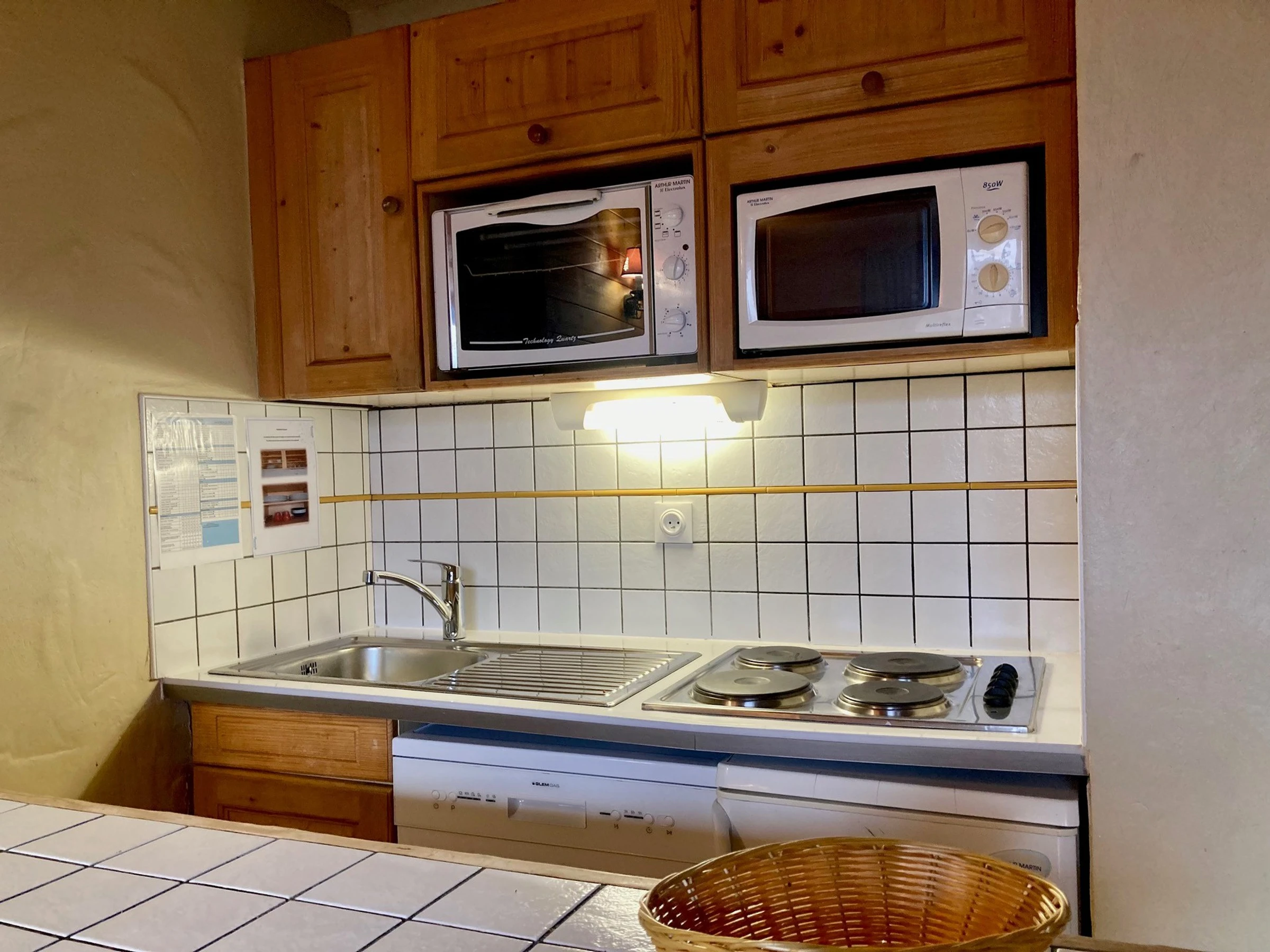 Küchenbereich: 4 Kochplatten, Kühlschrank, Backofen, Mikrowelle, Geschirrspüler, Toaster, Wasserkocher und Filterkaffeemaschine.