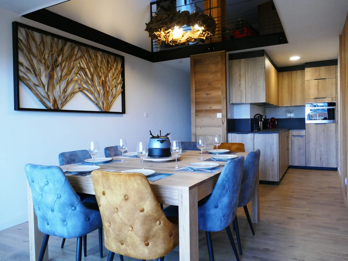 - 1 voll ausgestattete Küche (Dolce Gusto, Raclette-Grill, Backofen usw.), offen zum Essbereich, der dank eines großen Tisches Platz für alle Gäste bietet