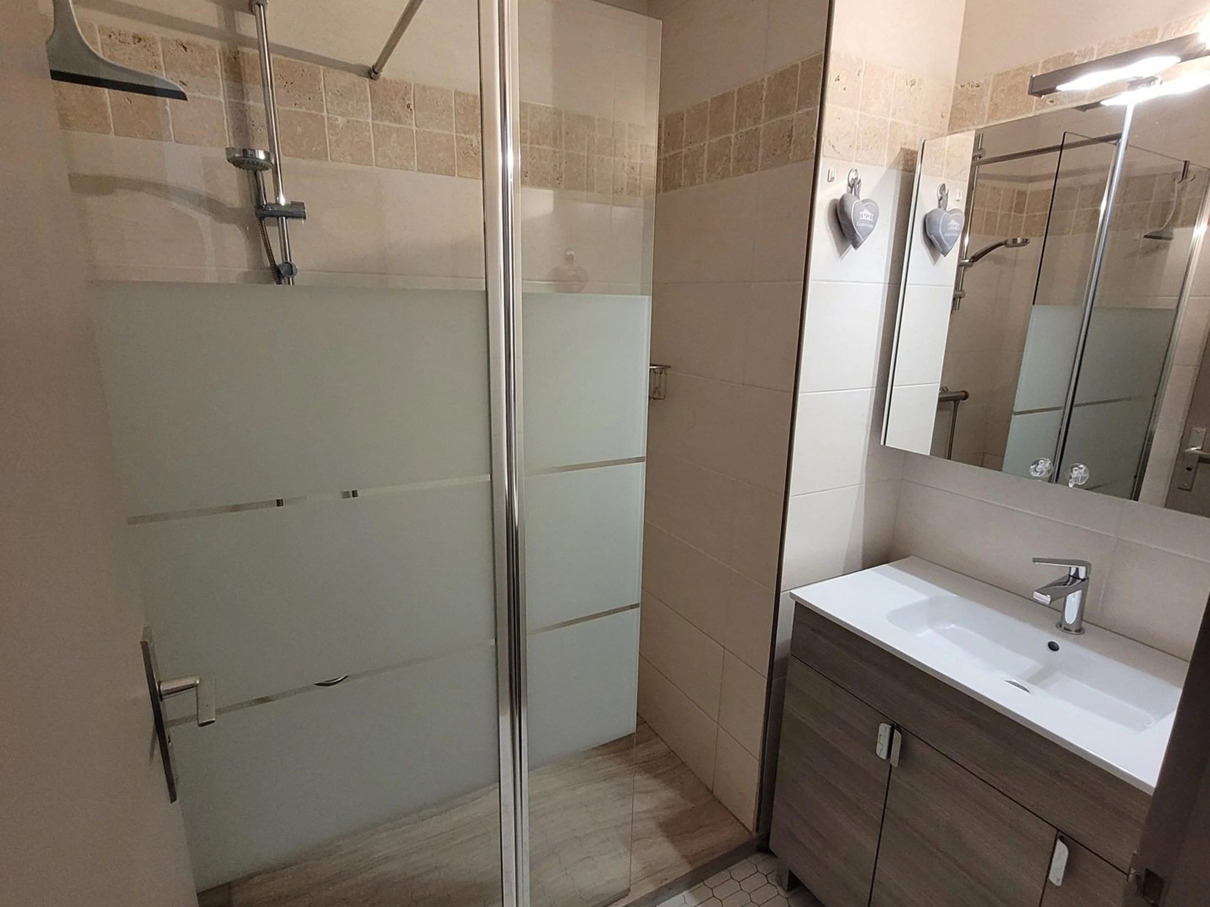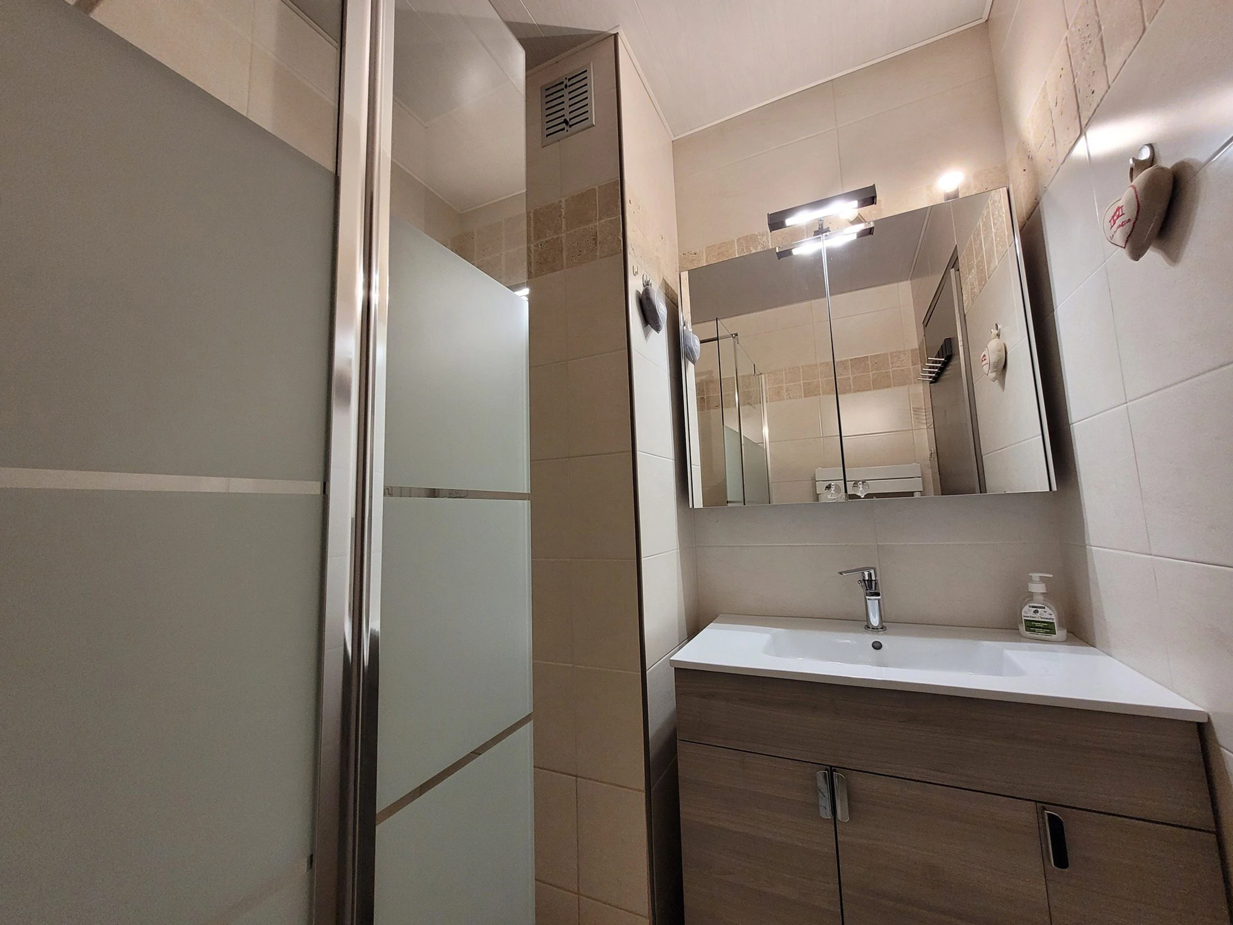- Badezimmer mit Dusche, Waschbecken und Handtuchhalter