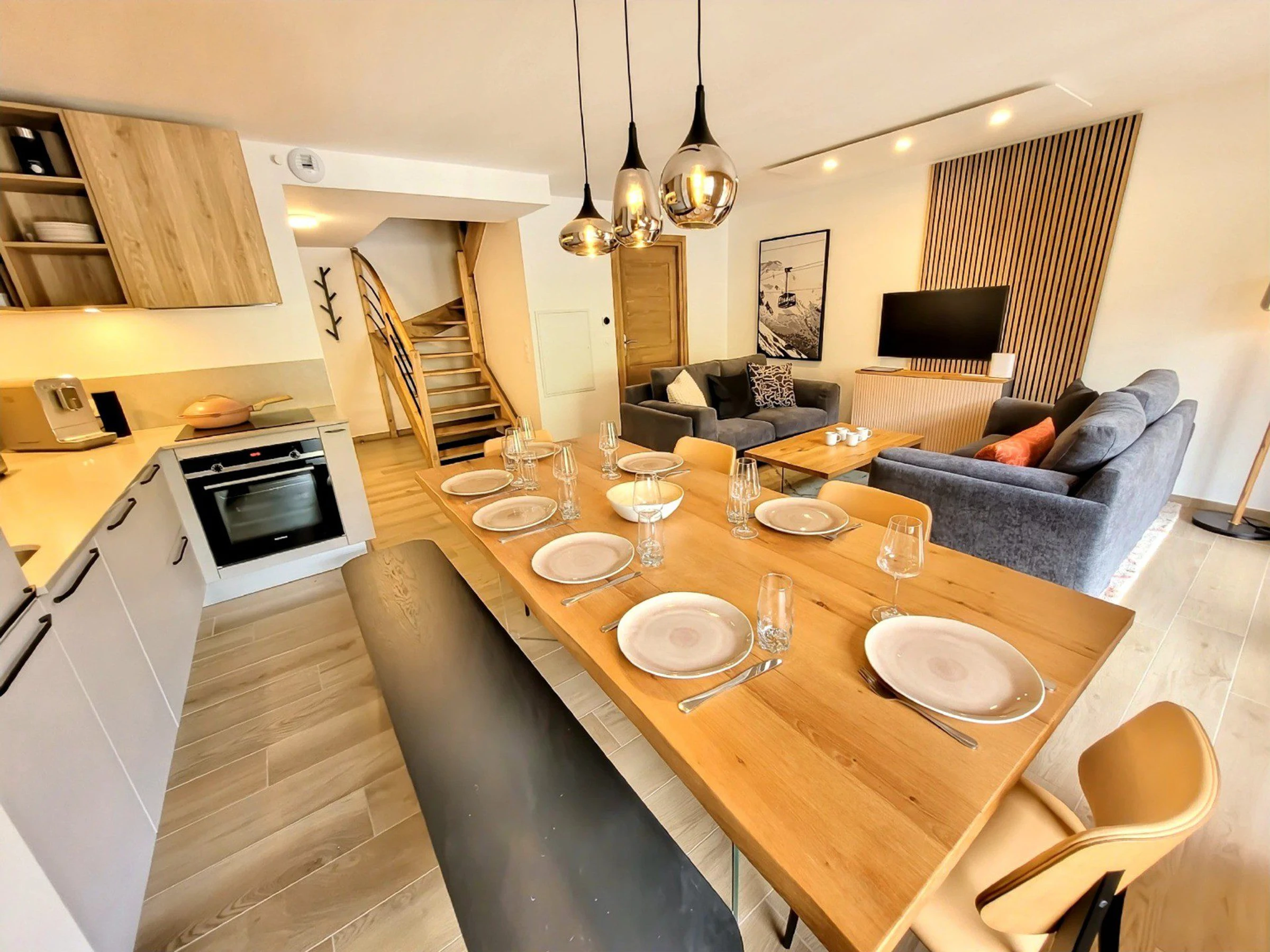 Voll ausgestattete Küche mit Mikrowelle, Einbaubackofen, Induktionskochfeld, Dunstabzugshaube, Geschirrspüler, Kühl-/Gefrierkombination, Wasserkocher, Toaster, SMEG-Kaffeemaschine, Raclette-Grill und Wäscheständer. WLAN, Smart-TV, Waschmaschine