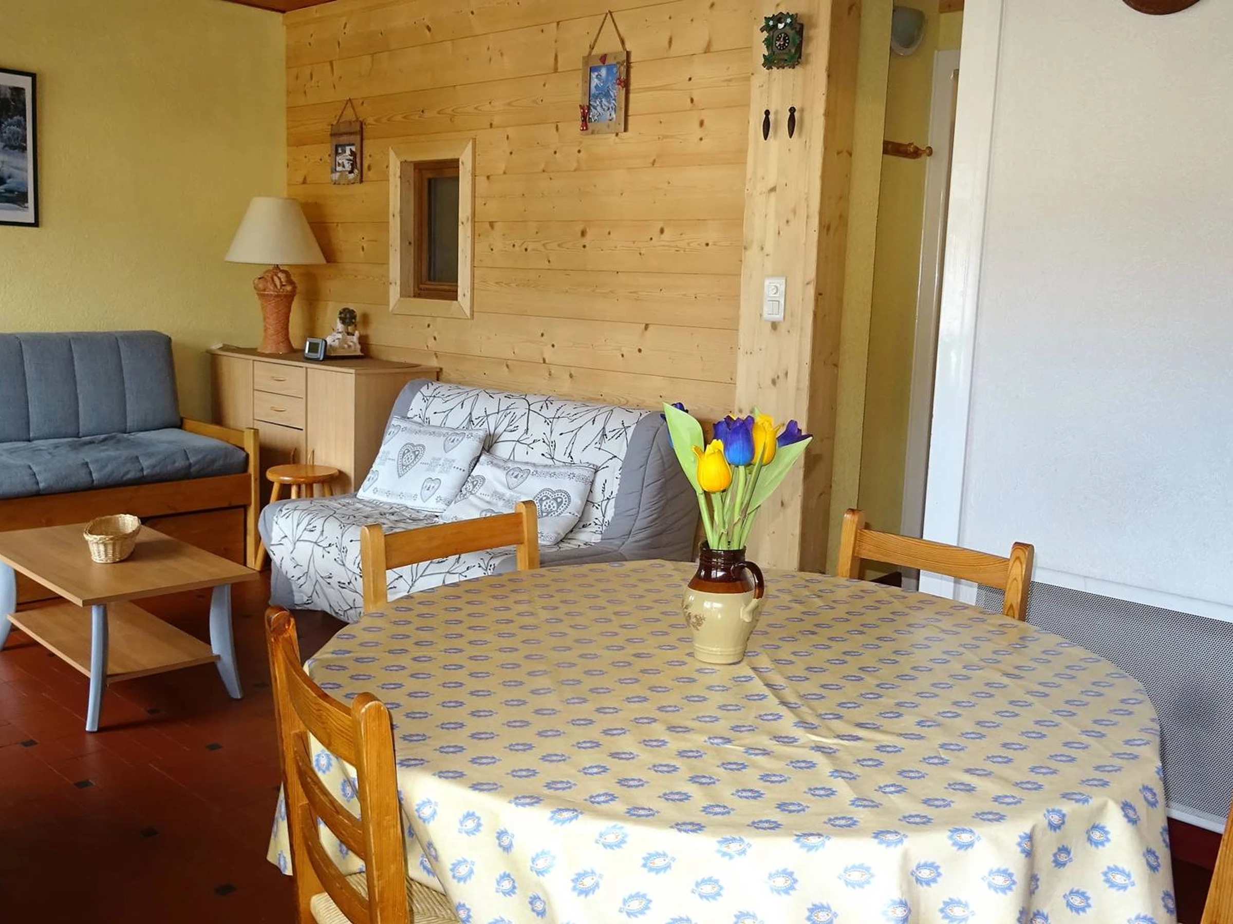 Beschreibung: Eingangshalle – Ein Schlafzimmer mit zwei Etagenbetten (90 cm) und Stauraum – Ein Schlafzimmer mit einem Doppelbett (140 cm) + Schränken – Wohn-/Esszimmer mit einem Einzelschlafsofa (80 cm) + einem Einzelausziehbett (80 cm) (das auf die gleiche Höhe hochgeklappt werden kann, um ein Doppelbett (160 cm) zu schaffen), Zugang zum Balkon mit Blick auf das Dorf – Ausgestattete Küchenzeile (4 Elektrokochfelder + Backofen, Kühlschrank, Schränke mit Kochgeschirr, Mikrowelle, Geschirrspüler) – Badezimmer (Badewanne, Waschbecken) – Separates WC mit Waschbecken – Elektroheizung. Skiraum im Keller der Residenz. Rauchfrei.