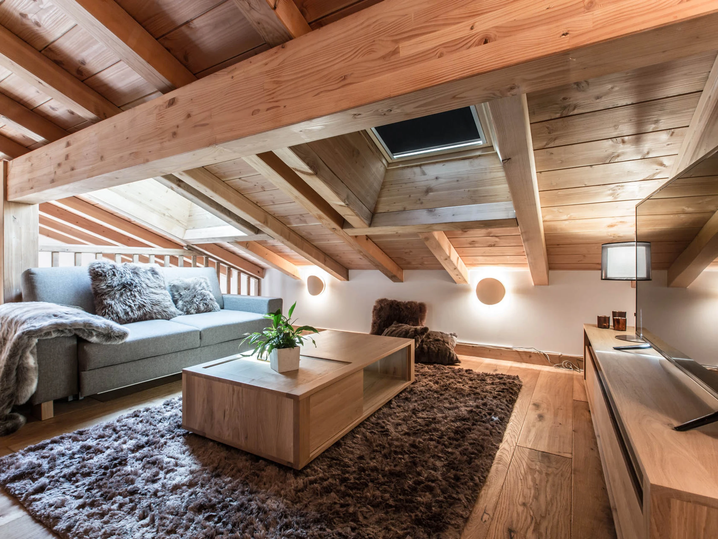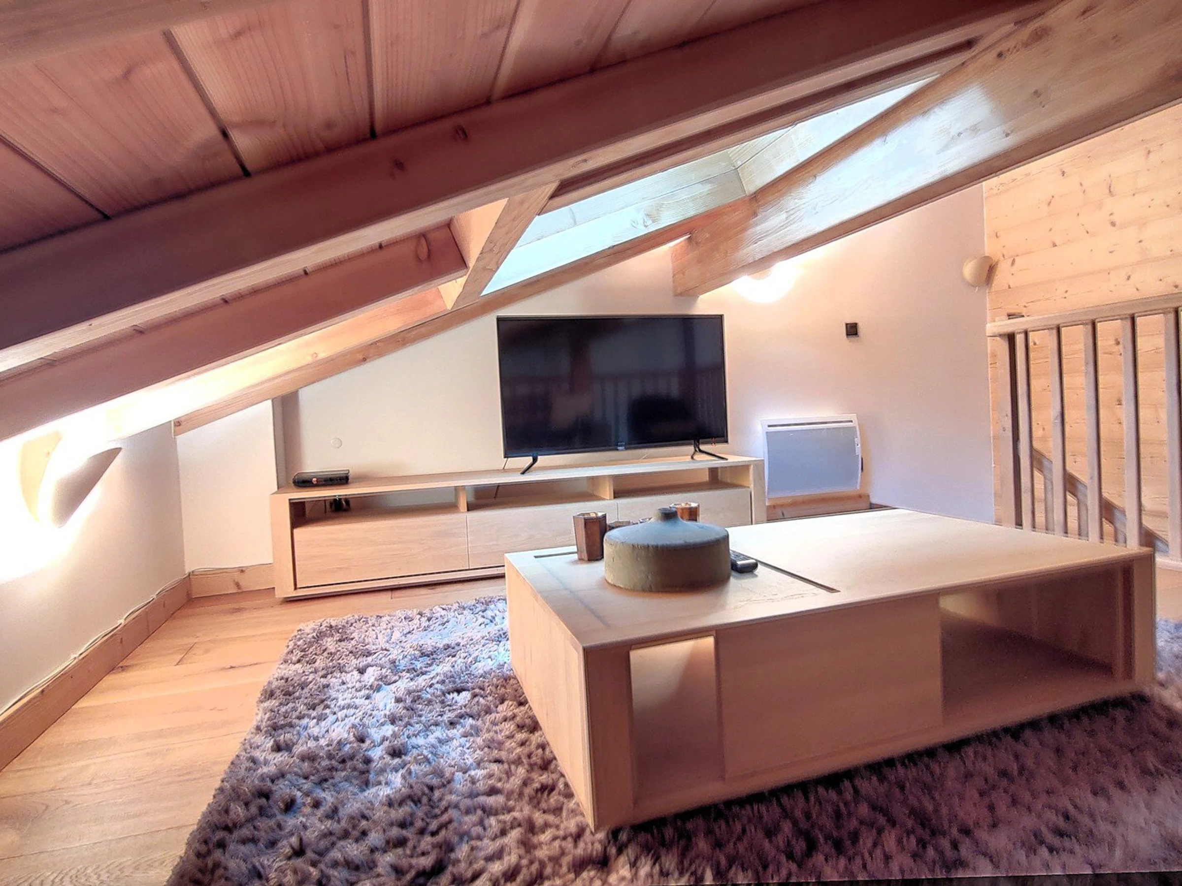 - ein Zwischengeschoss im Dachgesims (weniger als 1,8 m hoch) mit Sofa und Fernseher (französische Kanäle und TNT)