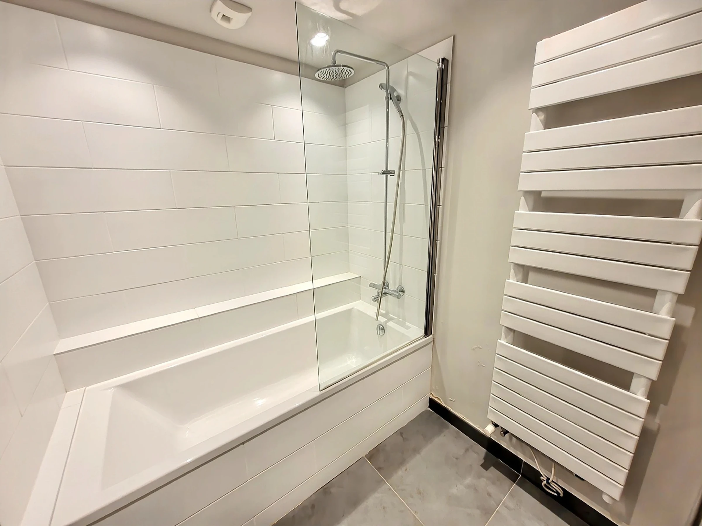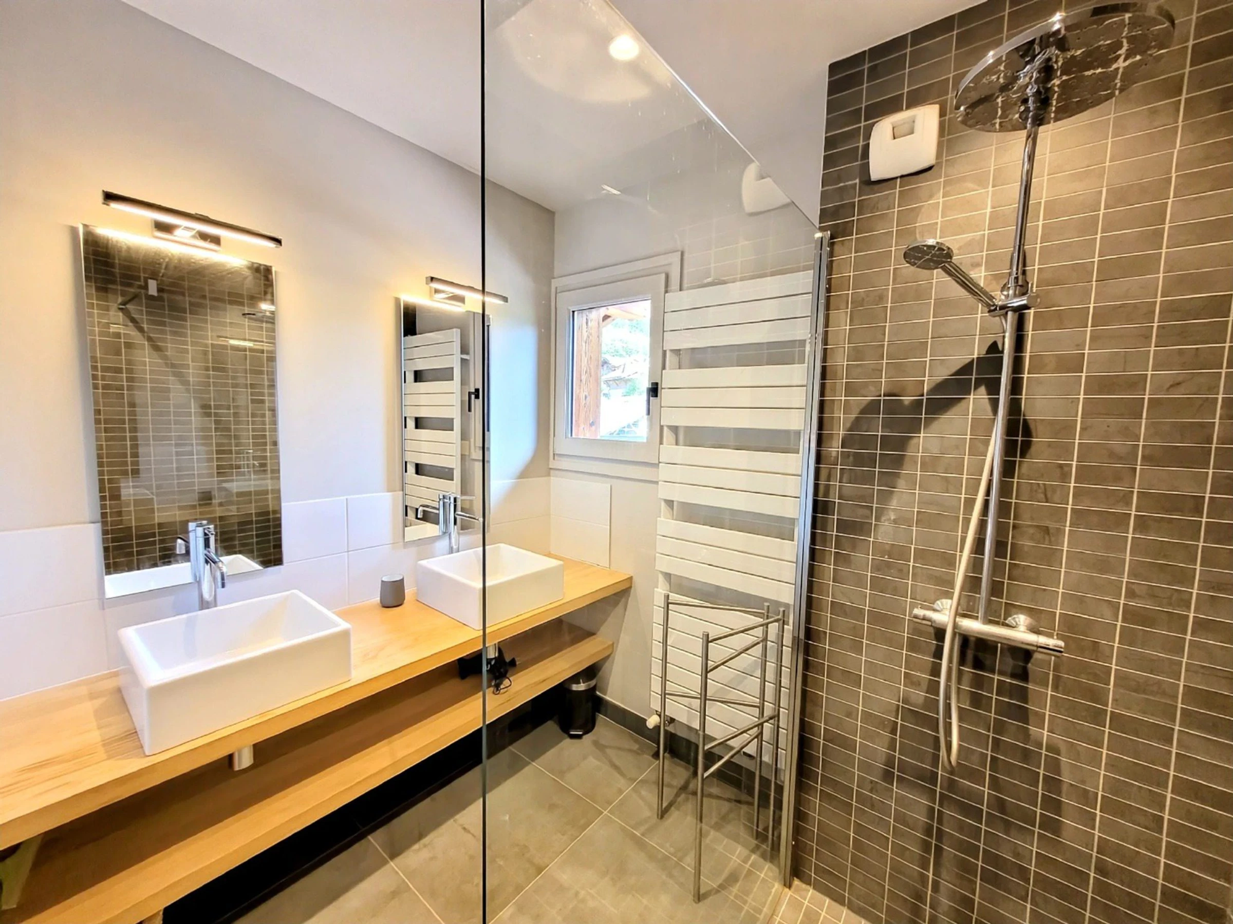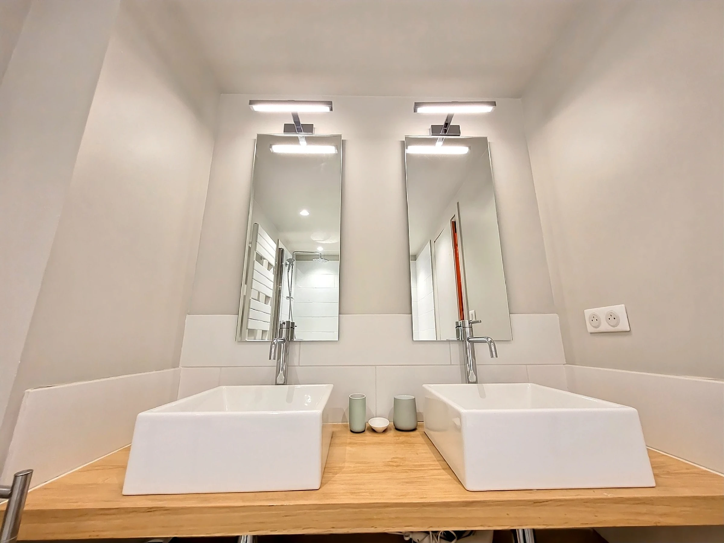 - Duschbad mit Doppelwaschbecken und Handtuchhalter