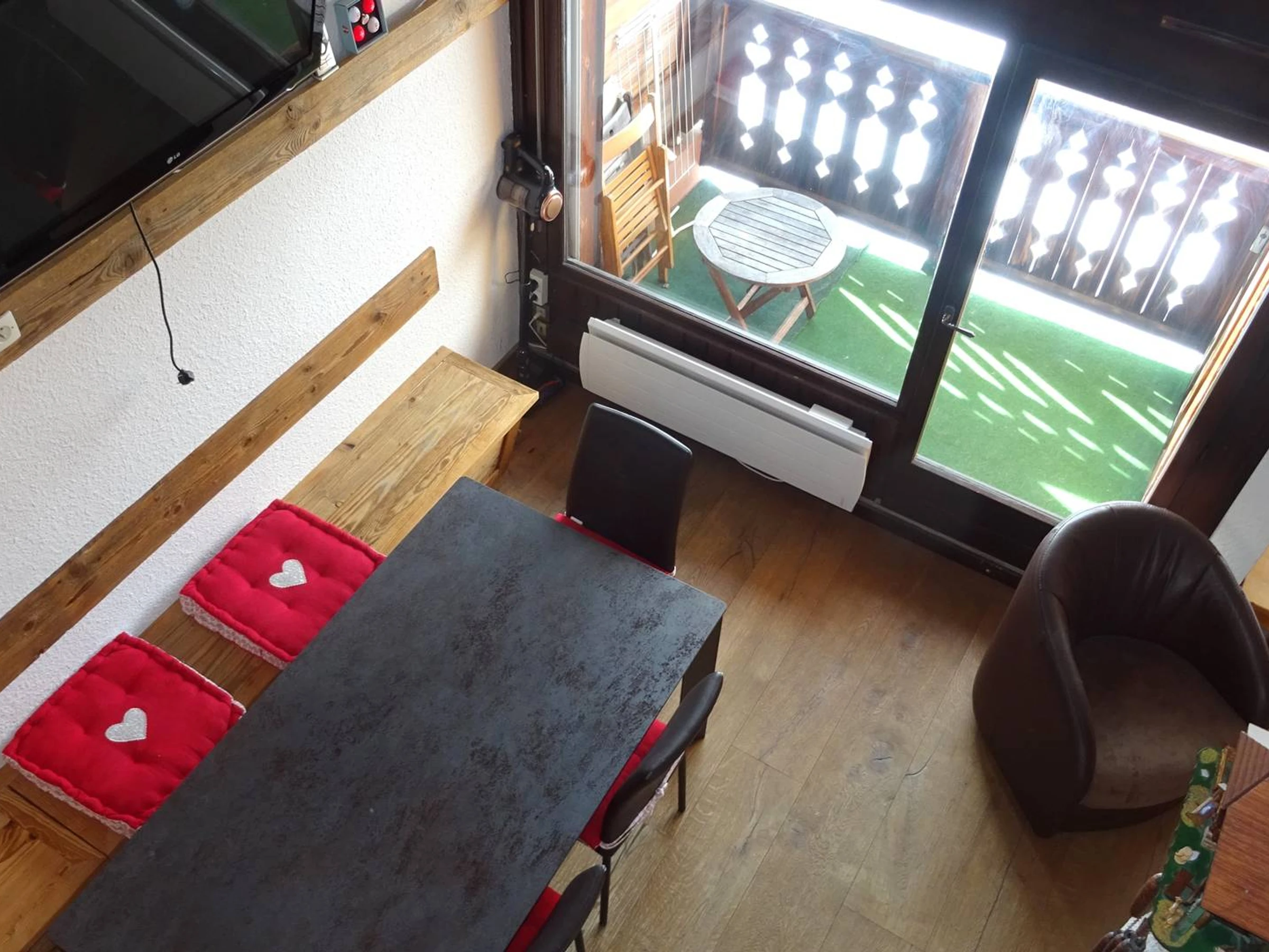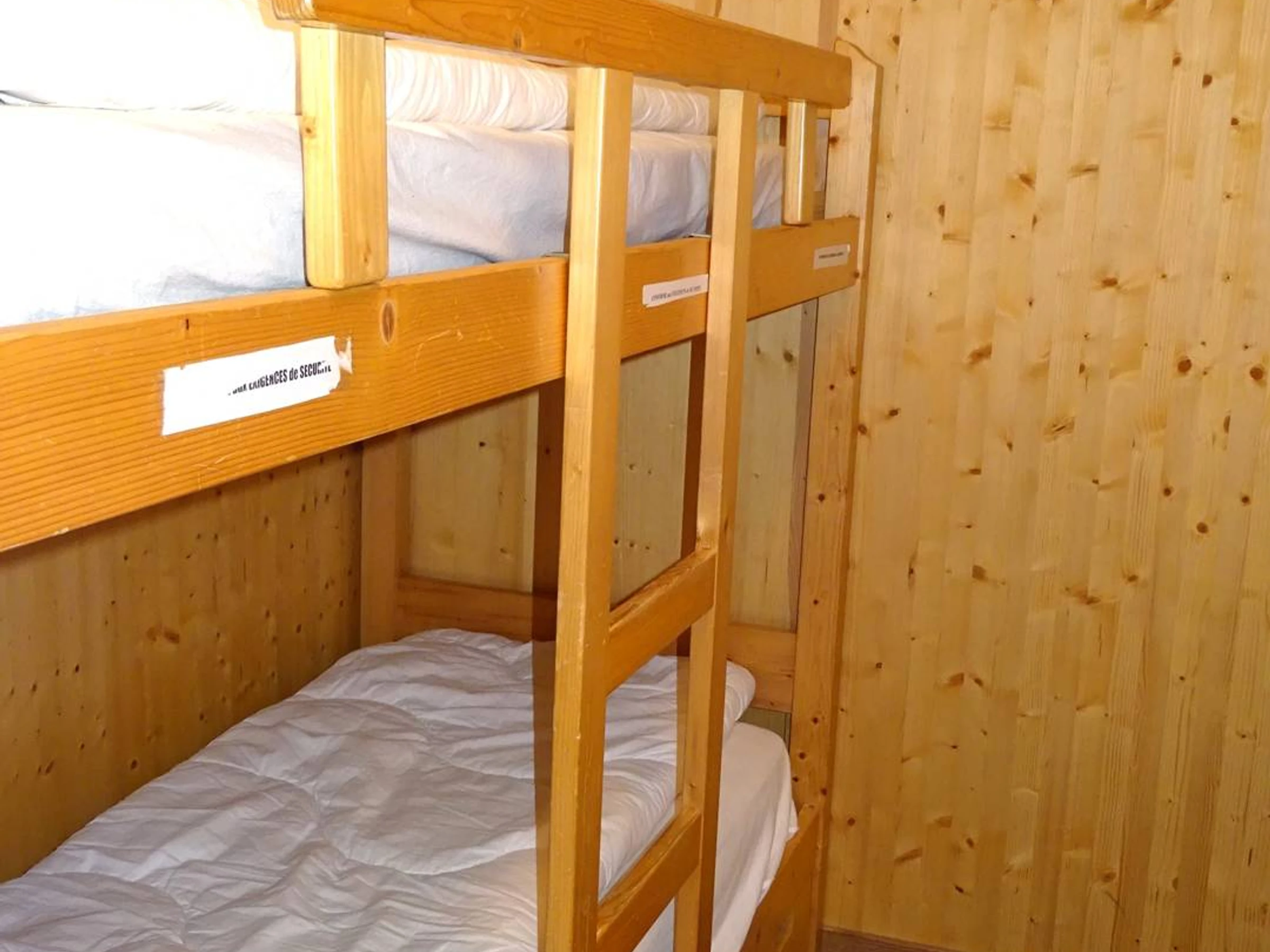 Beschreibung: Offener Eingang zum Küchenbereich und Esszimmer – neuer, voll ausgestatteter Küchenbereich (4 Cerankochfelder + Backofen + Geschirrspüler + großer Kühlschrank + Gefrierfach – Dunstabzugshaube – Toaster + Wasserkocher + Mikrowelle + 1 Nespresso-Kaffeemaschine (Kapseln nicht im Lieferumfang enthalten) – Ausgestattetes Esszimmer + Zugang zum Balkon – Wohnbereich mit Sofas und 1 Couchtisch, 1 Fernseher, Blick auf das Dorf – 1 Kabinenschlafzimmer mit 2 Einzelstockbetten (90) – 1 separates WC – 1 Badezimmer (Badewanne, Waschbecken, Handtuchtrockner) – Vom Wohnzimmer aus Zugang zum ersten Stock (Höhe teilweise unter 1,80 m mit sichtbaren Balken): 1 Zwischengeschoss mit Fernsehbereich und 1 Rapido-Sofa für 2 Personen – 1 Schlafzimmer mit 1 Doppelbett (140) + Kleiderschrank – 1 Schlafzimmer mit 2 Einzelbetten + Kommode – 1 Badezimmer (Dusche, Waschbecken, WC, Handtuchwärmer) – Elektroheizung. Rauchen verboten.