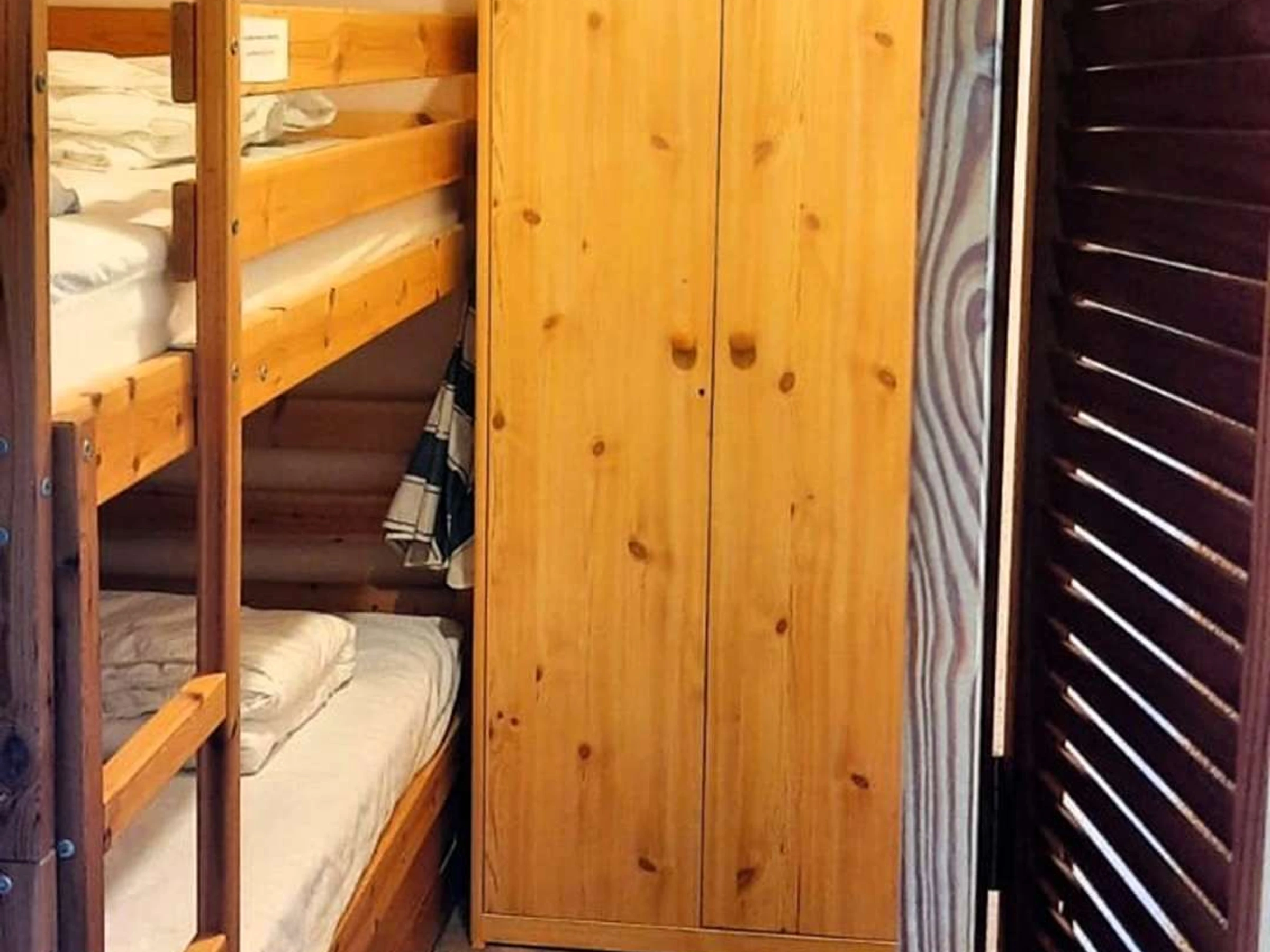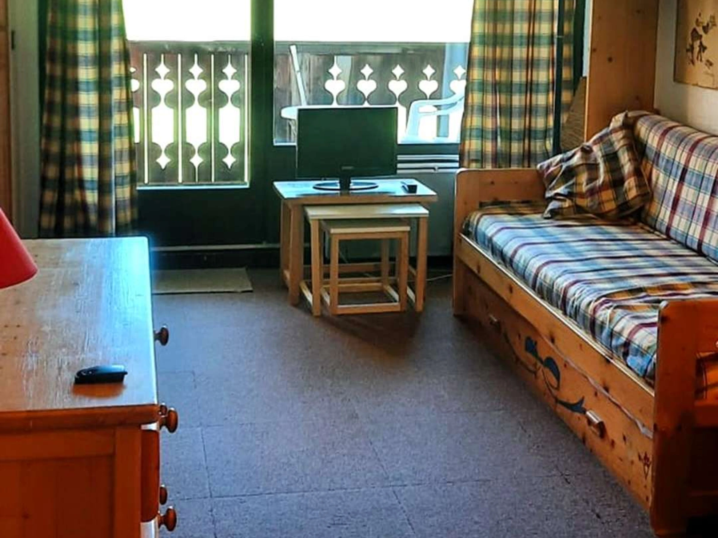 Beschreibung: Eingangsbereich – ausgestattete Küchenzeile (2 Cerankochfelder und Elektrobackofen, Kühlschrank, Waschmaschine, Mikrowelle, Toaster, Wasserkocher, Kaffeemaschine, Vorratsschränke mit Kochgeschirr) – Wohn-/Esszimmer mit Einzelschlafcouch (80 cm) + TV + Zugang zum Ostbalkon – 1 Schlafzimmer mit Doppelbett (140 cm) + Kommode – 1 durch eine Schiebetür abgeschlossenes Kabinenschlafzimmer mit zwei Einzelstockbetten (80 cm) – Badezimmer (Badewanne, Waschbecken) – separates WC. Elektroheizung. Kein Skiraum – 1 Garagenplatz im Untergeschoss der Residenz mit Fernbedienung.