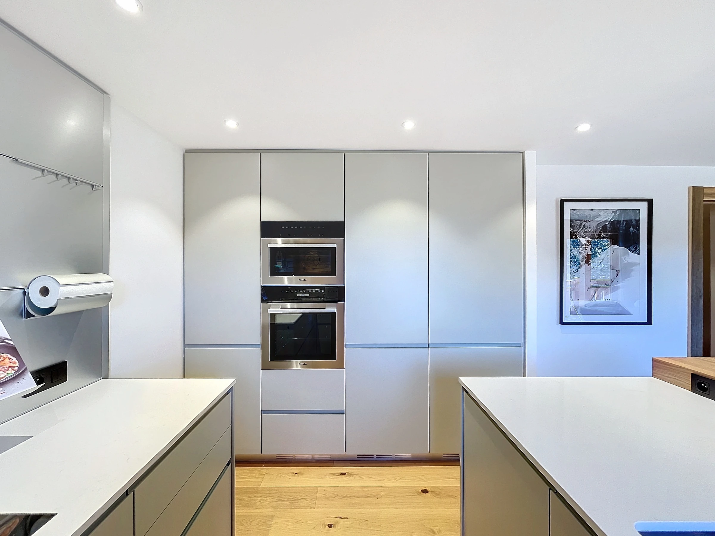 Dieses offene küche, mit induktions-kochfeld, ist ausgestattet in kühlschrank, mikrowelle, backofen, gefrierschrank, spülmaschine, geschirr/besteck, kochutensilien, kaffeemaschine, toaster und wasserkocher.