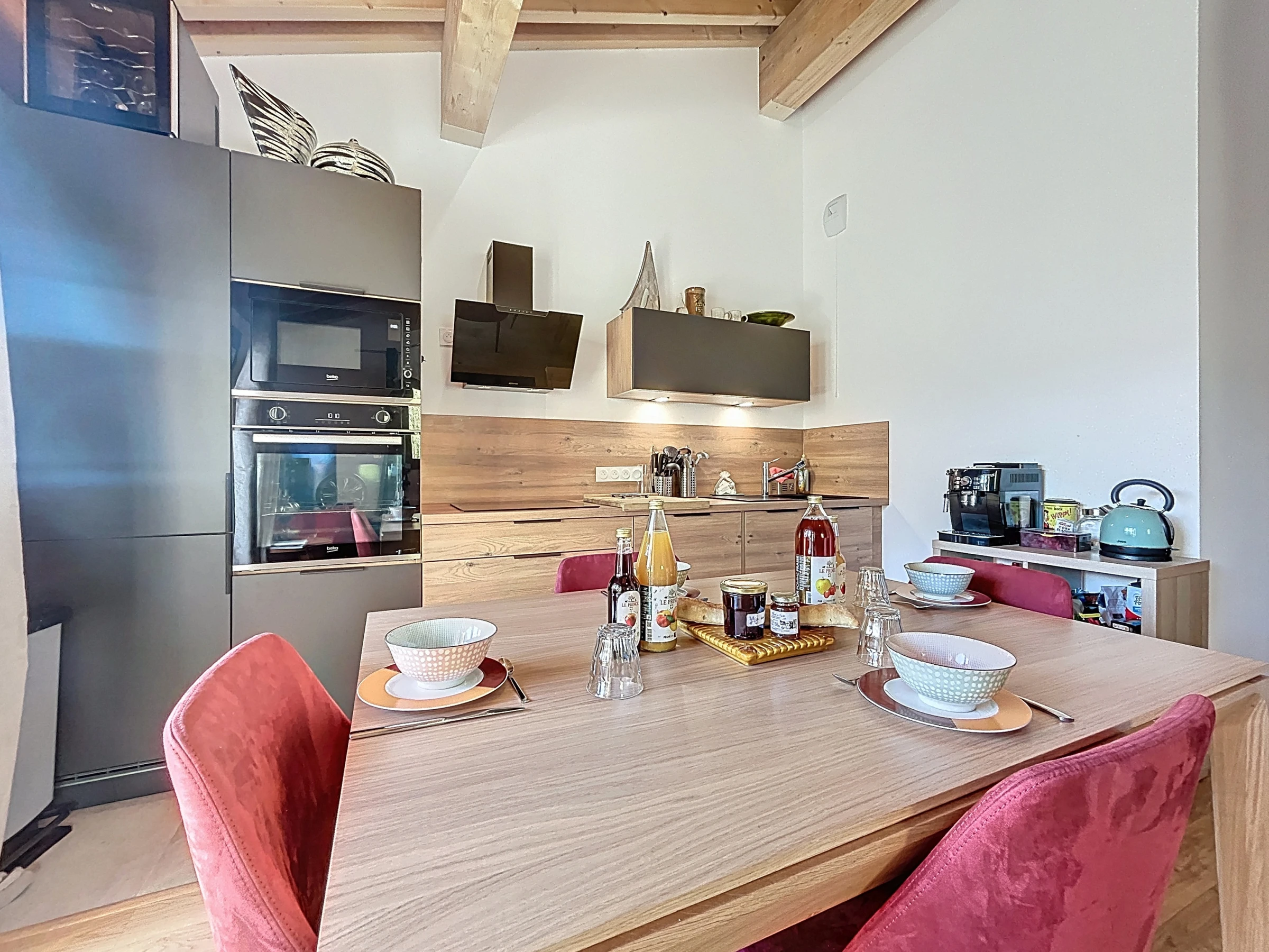 Dieses offene küche, mit induktions-kochfeld, ist ausgestattet in kühlschrank, mikrowelle, backofen, gefrierschrank, spülmaschine, geschirr/besteck, kochutensilien, kaffeemaschine, toaster, wasserkocher und saftpresse.
