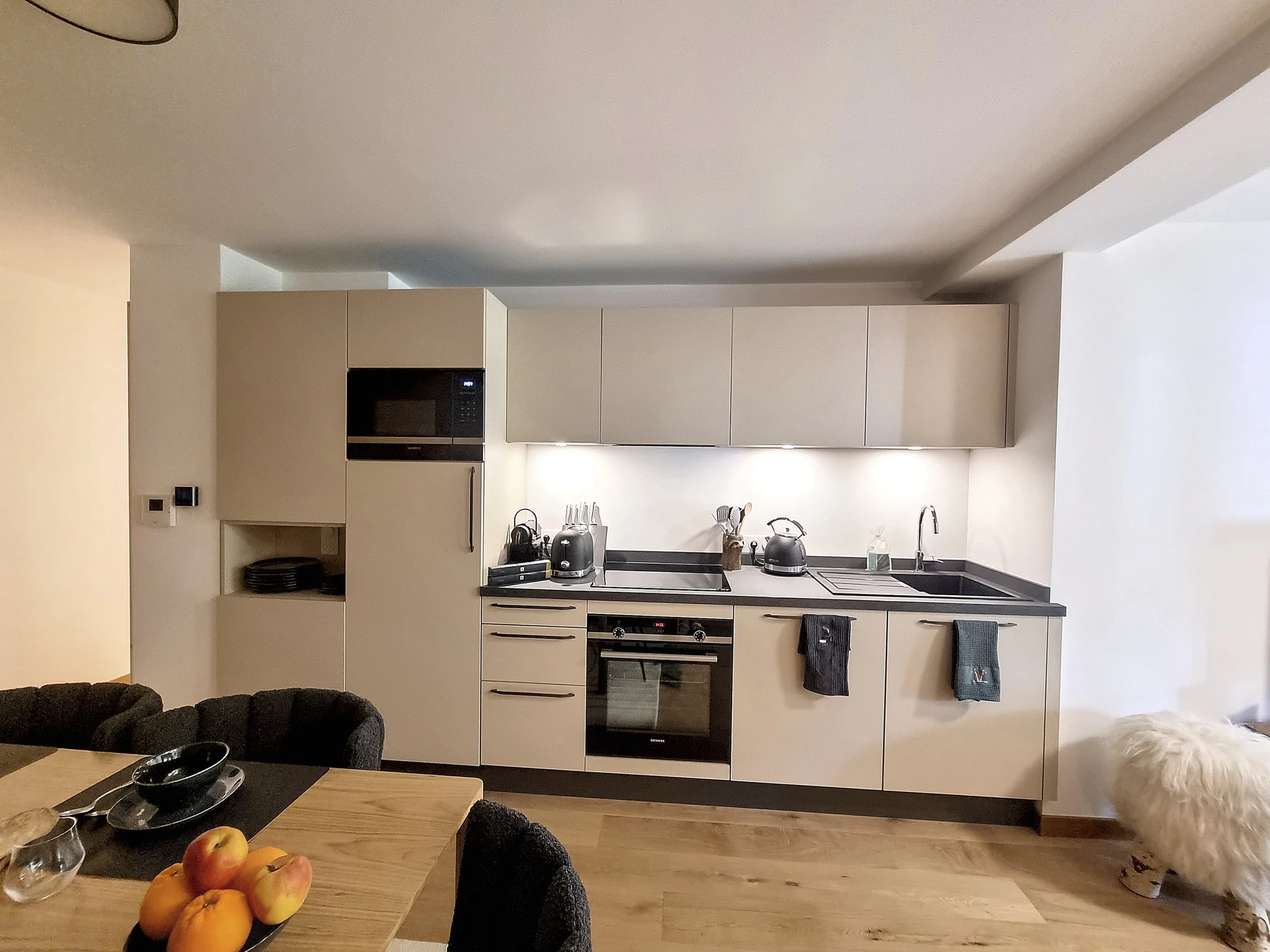 Dieses separate küche, mit induktions-kochfeld, ist ausgestattet in kühlschrank, mikrowelle, backofen, spülmaschine, geschirr/besteck, kochutensilien, kaffeemaschine, toaster und wasserkocher.