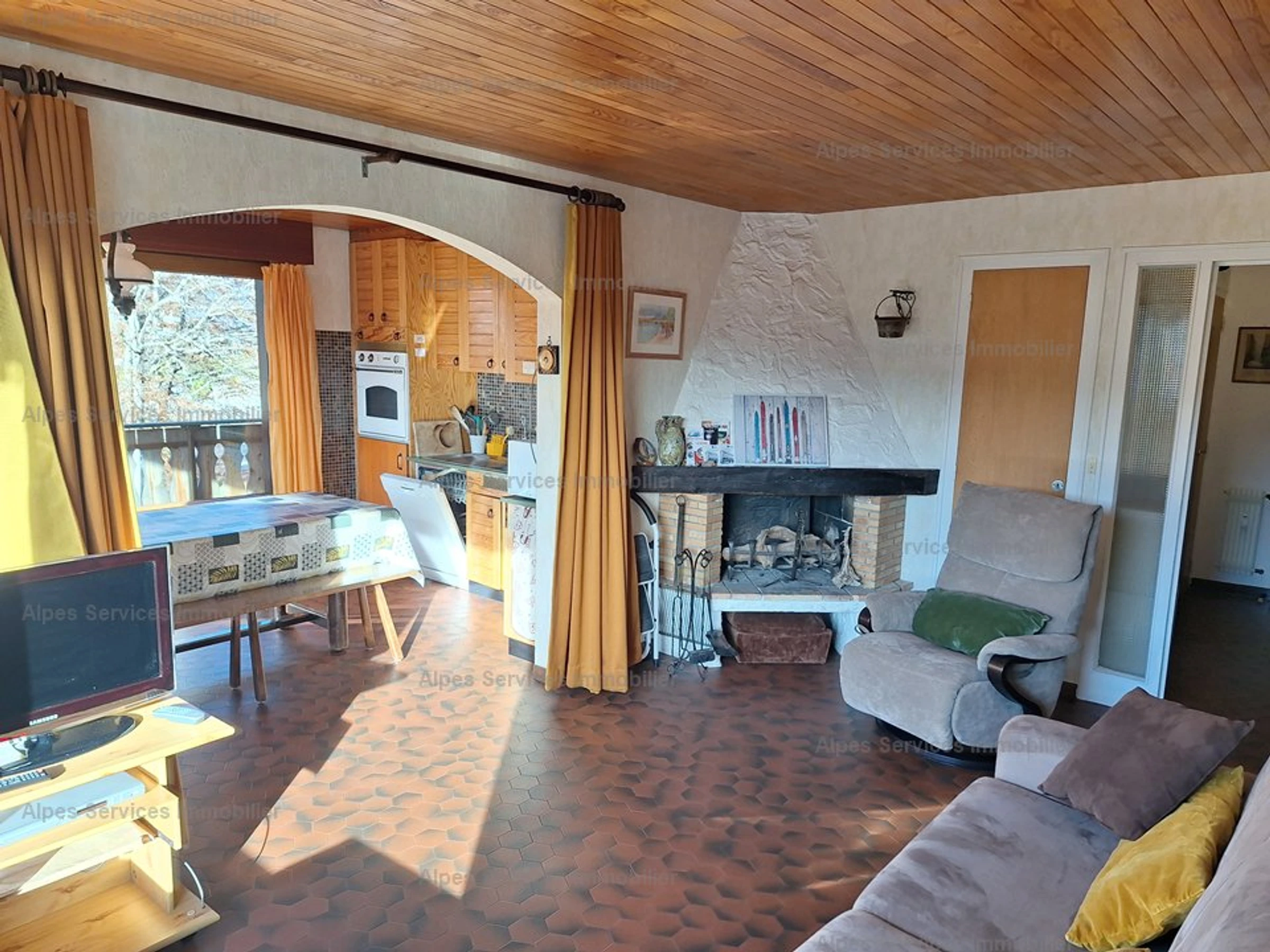 Vom Eingangsbereich gelangt man in das Wohnzimmer mit einem gemütlichen Wohnbereich, einem dekorativen Kamin und einer voll ausgestatteten Wohnküche. Auch dieser Raum verfügt über ein schönes bodentiefes Fenster, das auf einen durchgehenden Balkon mit Rollläden führt.