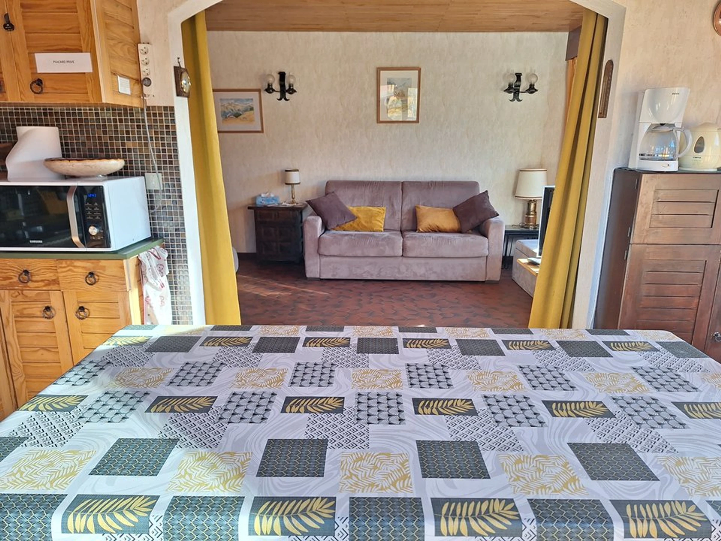 Einem Eingangsbereich, der zum Badezimmer (Badewanne + Waschbecken) mit Waschmaschine und separatem WC führt, sowie dem Schlafzimmer mit zwei Etagenbetten und einem Ausziehbett. Ein bodentiefes Fenster erhellt den Raum und bietet Zugang zum Balkon.
