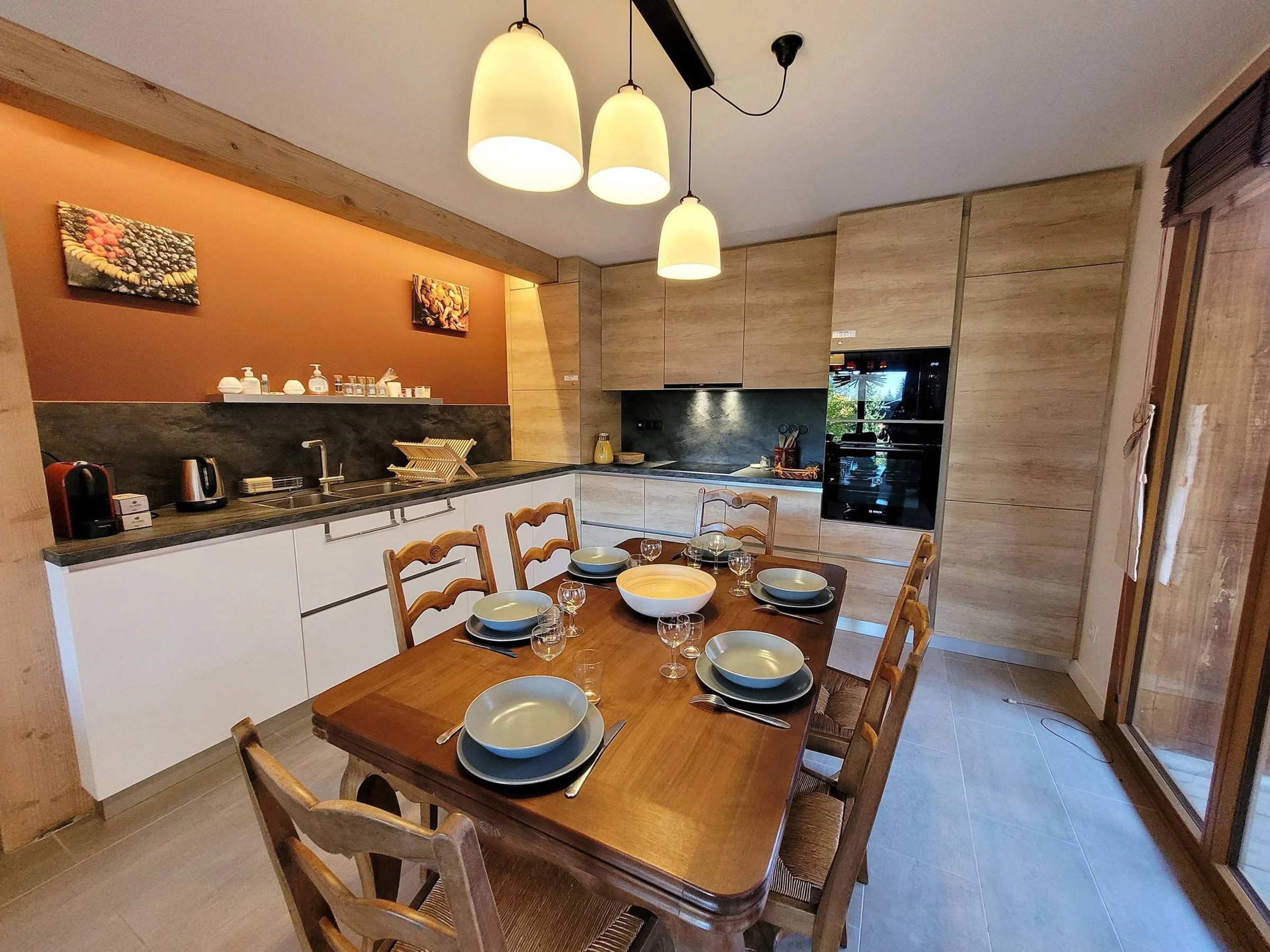 AUSSTATTUNG: Gemeinschafts-Fußbodenheizung, Induktionskochfeld, Backofen, Geschirrspüler, Kühlschrank, Nespresso- und Filterkaffeemaschine, Toaster, Wasserkocher, Raclette-/Crêpe-Maschine, Plancha, Küchenmaschine, Waschtrockner, TV, WLAN, Gartenmöbel