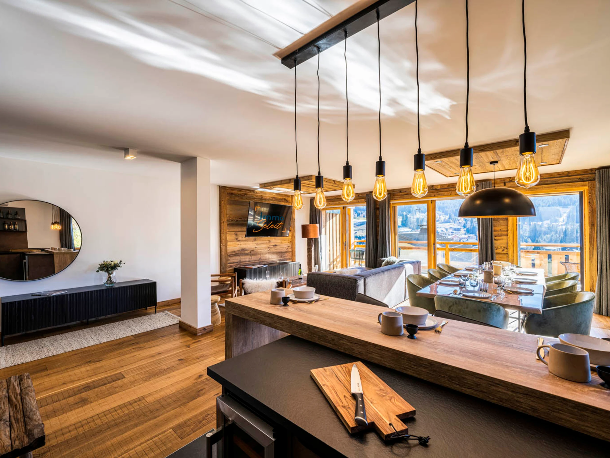 - Wohnzimmer mit voll ausgestatteter offener Küche und Zugang zur Südwestterrasse