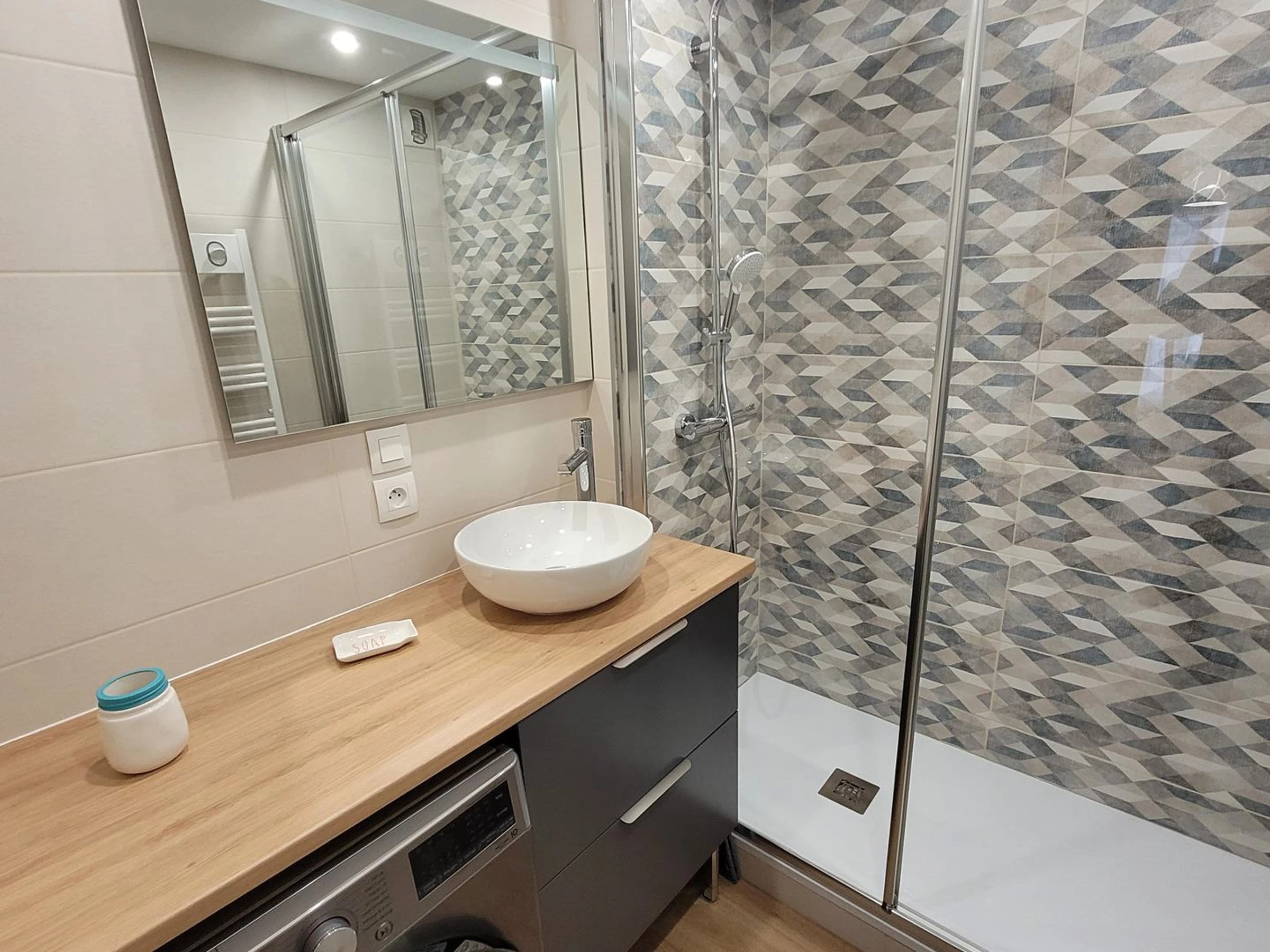 - Badezimmer mit Dusche, Handtuchhalter, Waschbecken und Waschmaschine