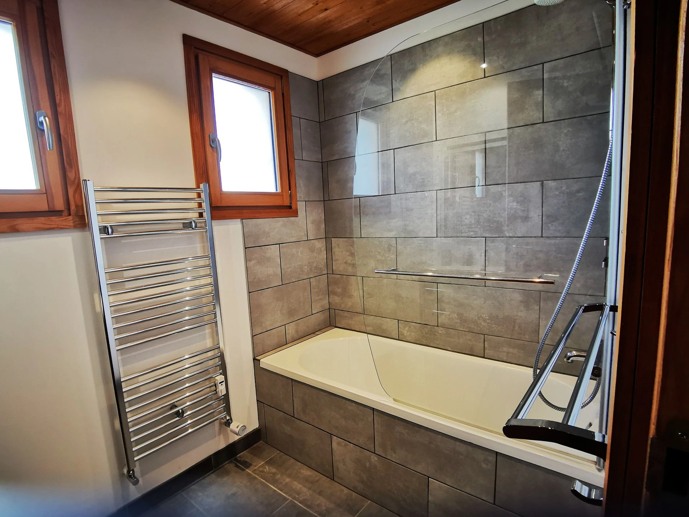 - Badezimmer mit Badewanne und Duschabtrennung, Waschtisch und Handtuchhalter.
