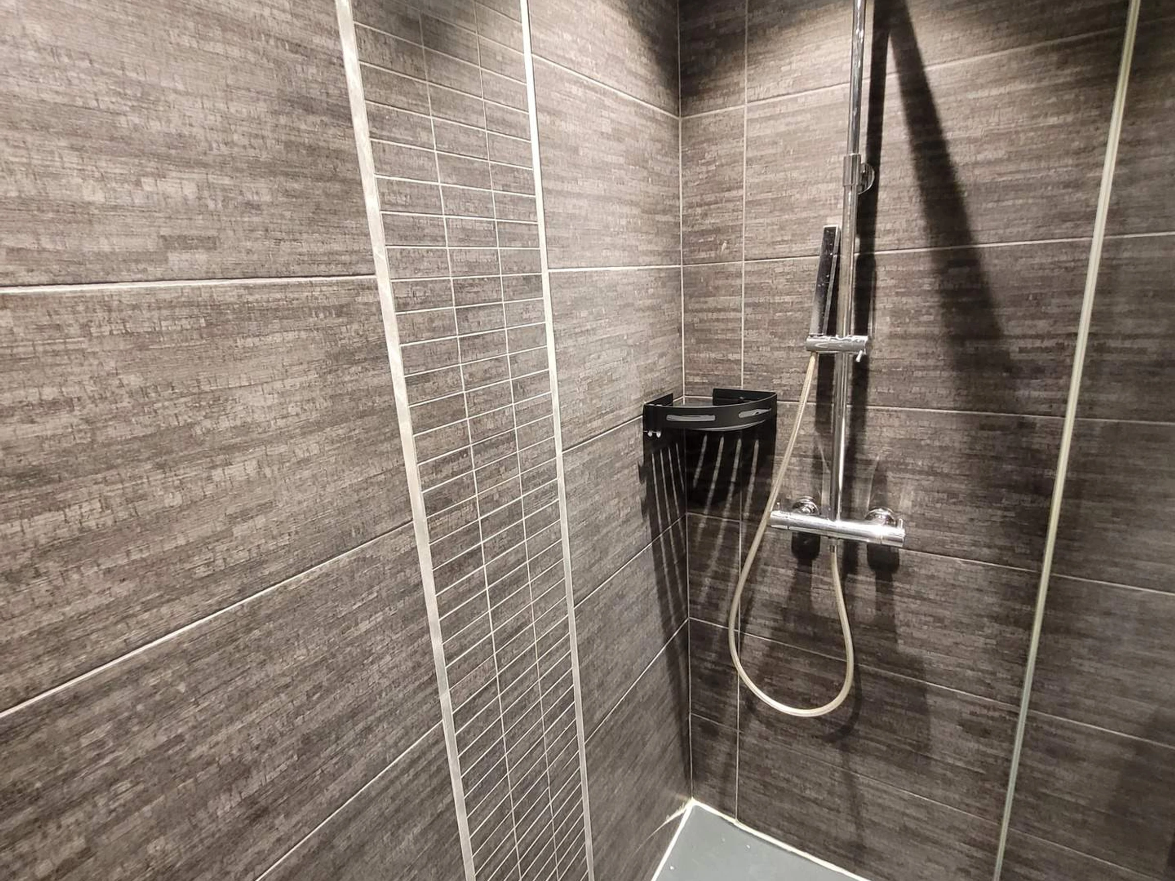 - Badezimmer mit ebenerdiger Dusche und Waschbecken