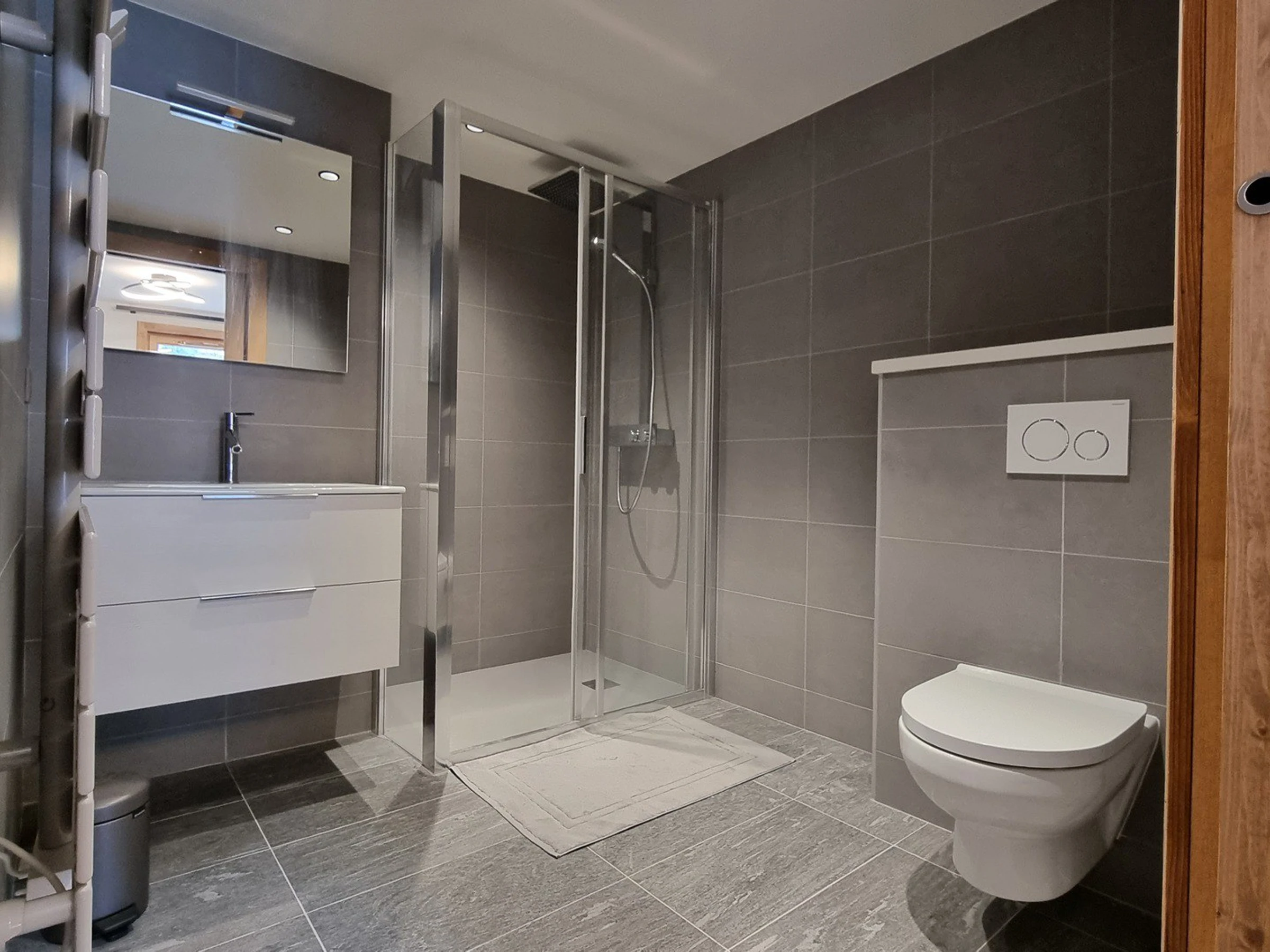 - Schlafzimmer mit Doppelbett (160 cm x 200 cm) und eigenem Bad mit Dusche, Waschbecken, WC und beheiztem Handtuchhalter Abstellraum und Fernseher