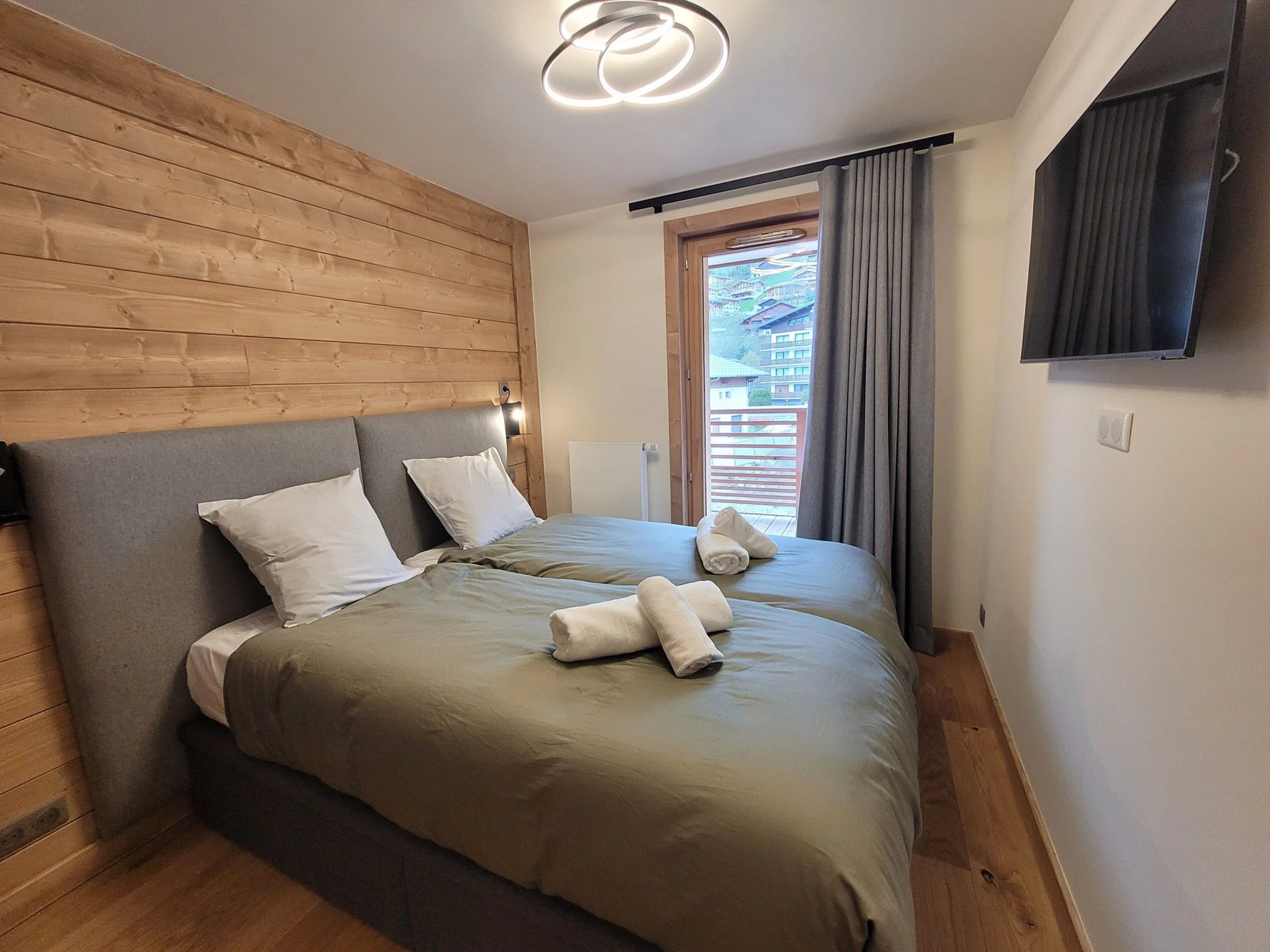 - Ein Doppelzimmer mit zwei Einzelbetten (80 cm x 190 cm), die zu einem Doppelbett (160 cm x 190 cm) zusammengestellt werden können, Abstellraum, Fernseher und Zugang zum Balkon.