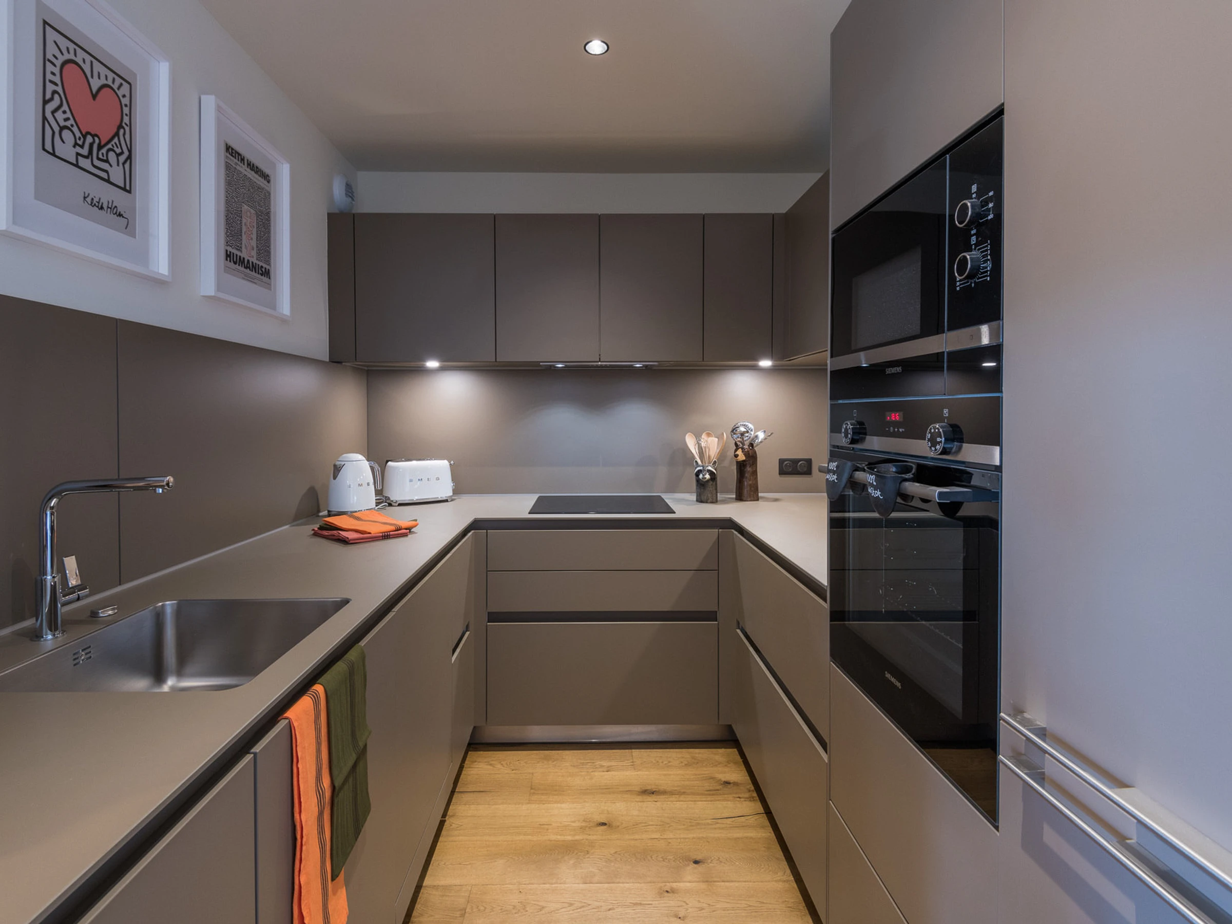 AUSSTATTUNG: Voll ausgestattete Bulthaup-Küche mit Einbaubackofen, Induktionskochfeld, Mikrowelle, Geschirrspüler, Kühl-/Gefrierkombination, Waschtrockner, Wasserkocher, Toaster, Nespresso-Maschine, Terrassentisch und Stühlen.