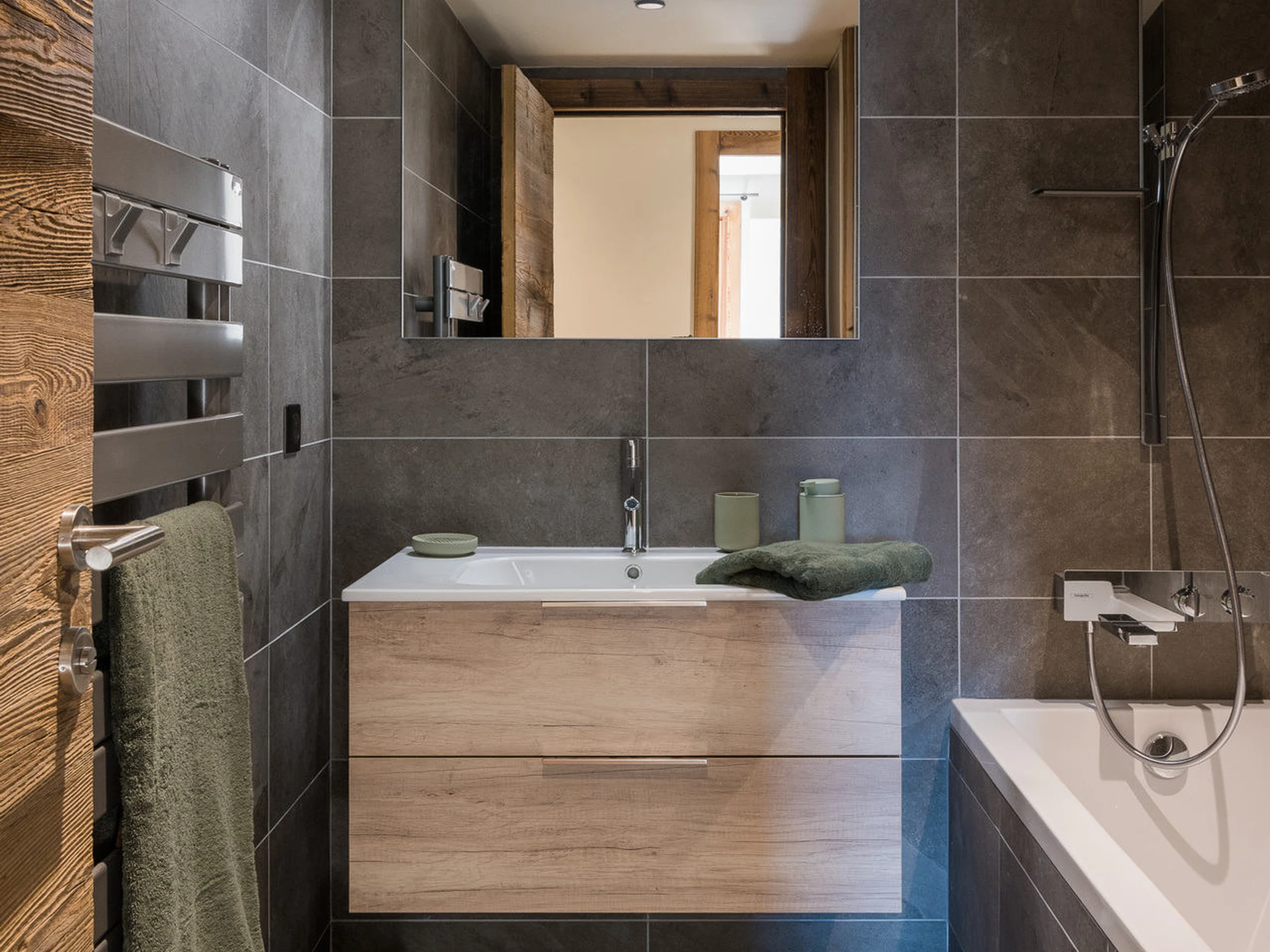 Separates Badezimmer mit Badewanne und Dusche, Waschbecken und Handtuchhalter.