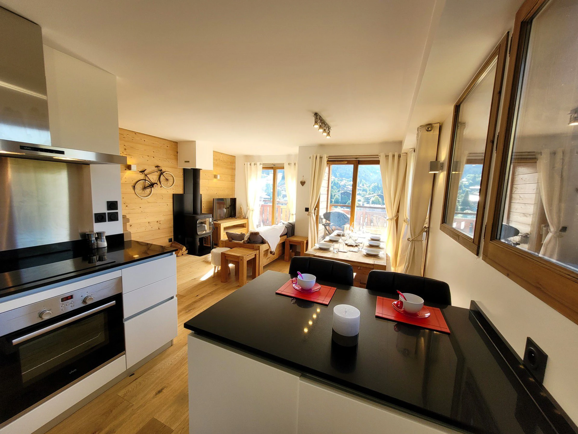 - Wohnbereich mit voll ausgestatteter Küche, Essbereich mit Aussicht, Sofa, TV und Kaminofen. - Balkon mit Sesseln
