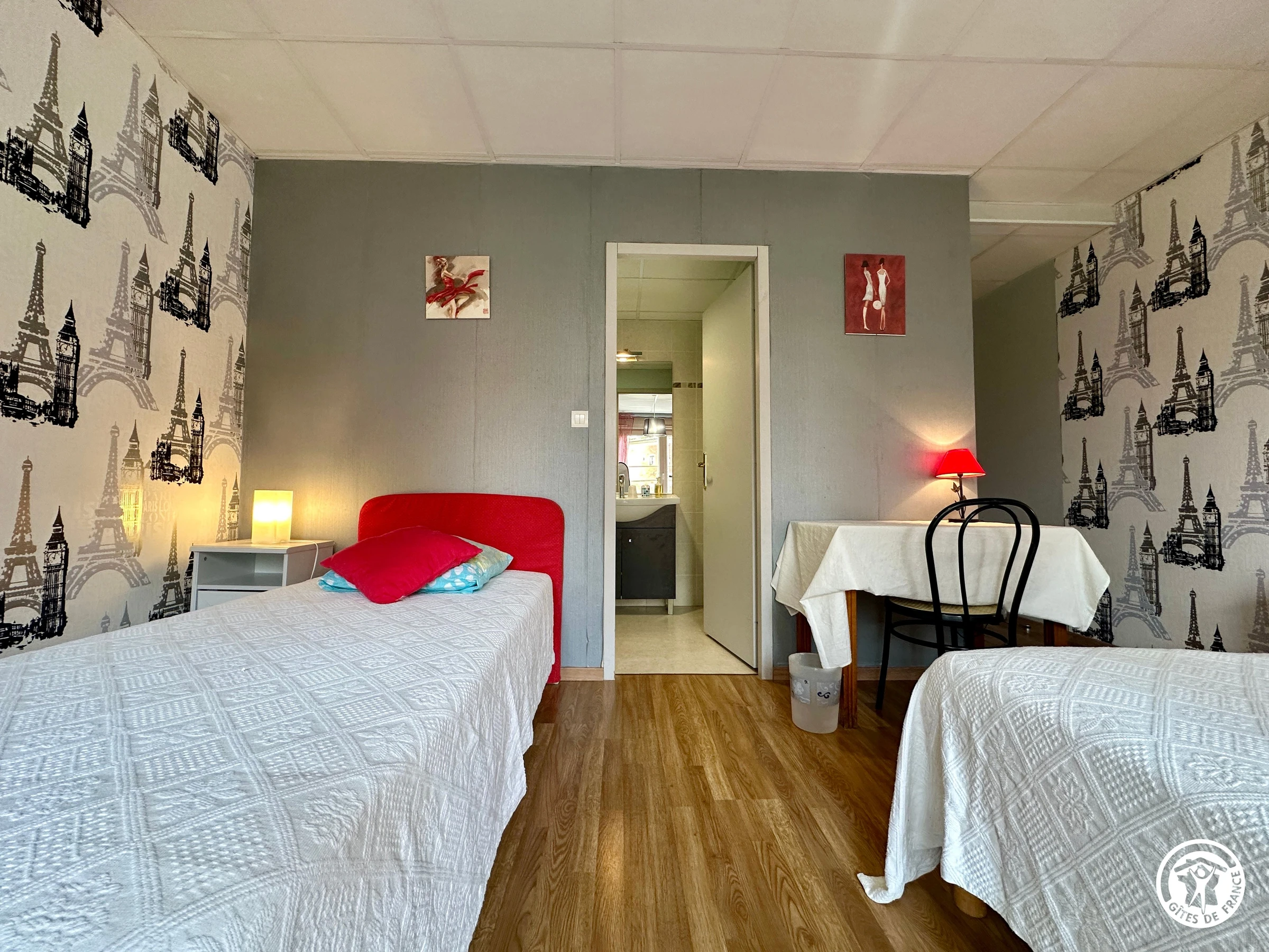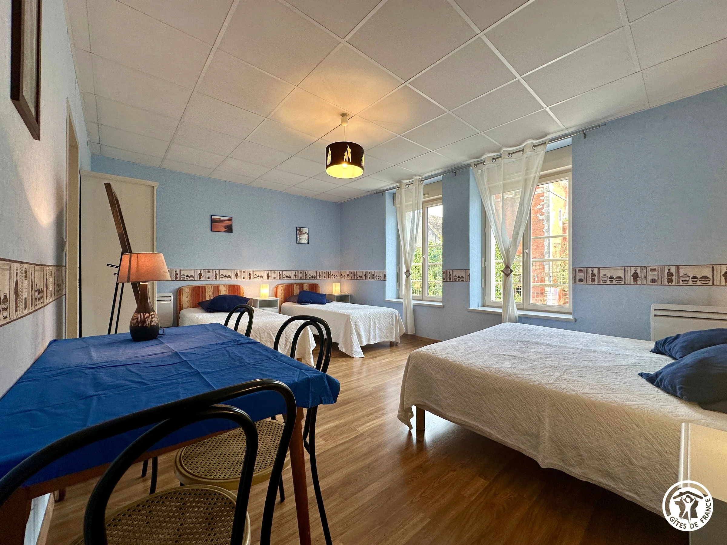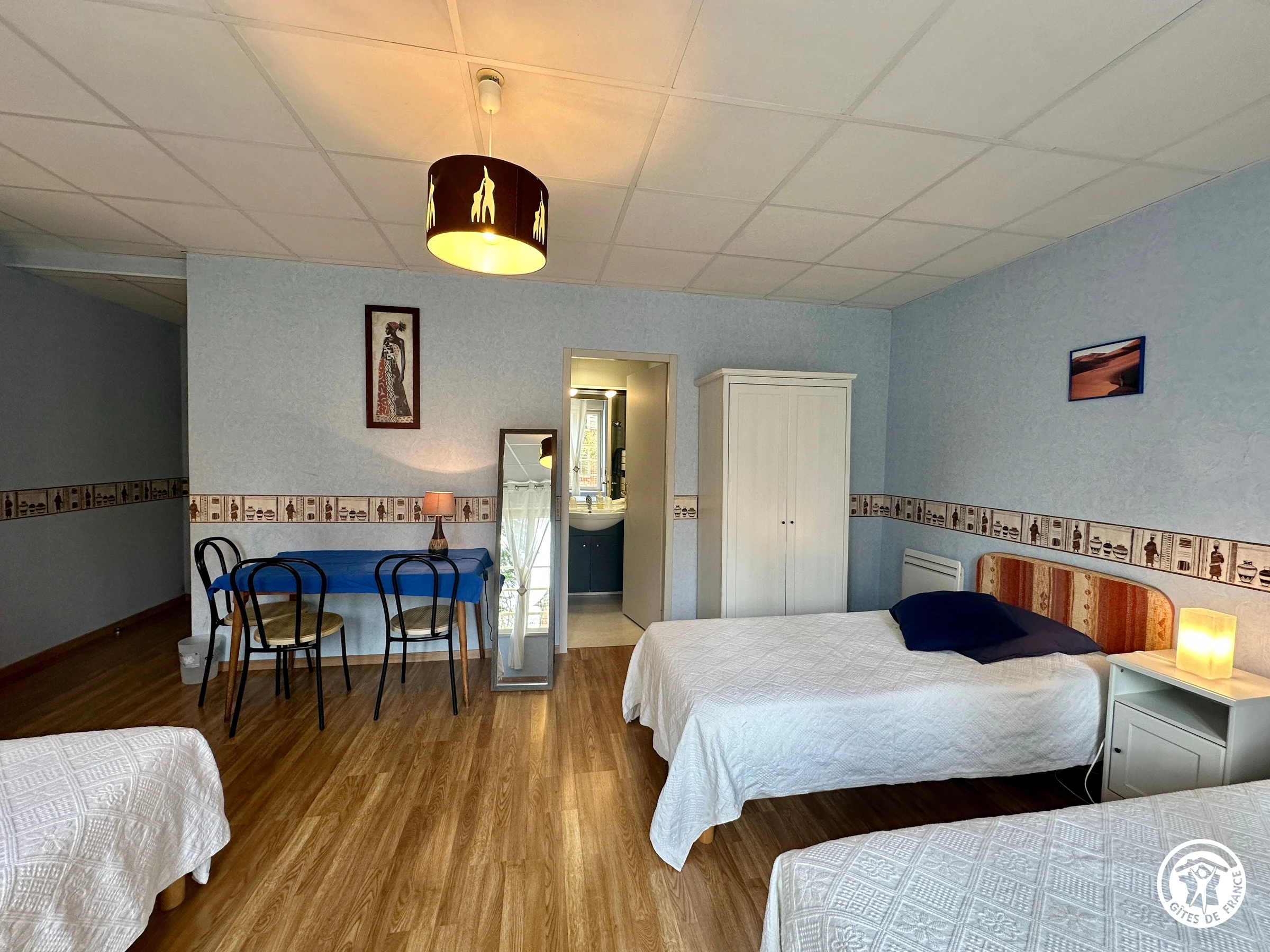 Das Zimmer im ersten Stock ist ideal für 4 Personen. Es verfügt über ein Doppelbett (160 cm) und ein Einzelbett (90 cm x 200 cm). Ein eigenes Duschbad und ein separates WC sind ebenfalls vorhanden.