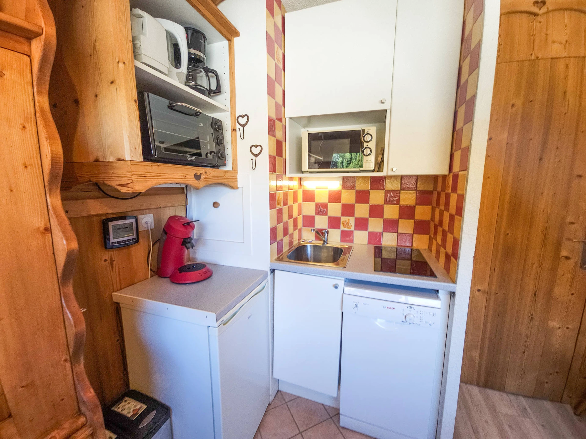 Küche: 2 Induktionskochfelder, Mikrowelle, Kühlschrank, Geschirrspüler, Filterkaffeemaschine und Senseo-Kaffeemaschine, Wasserkocher, Toaster, Raclette-Gerät
