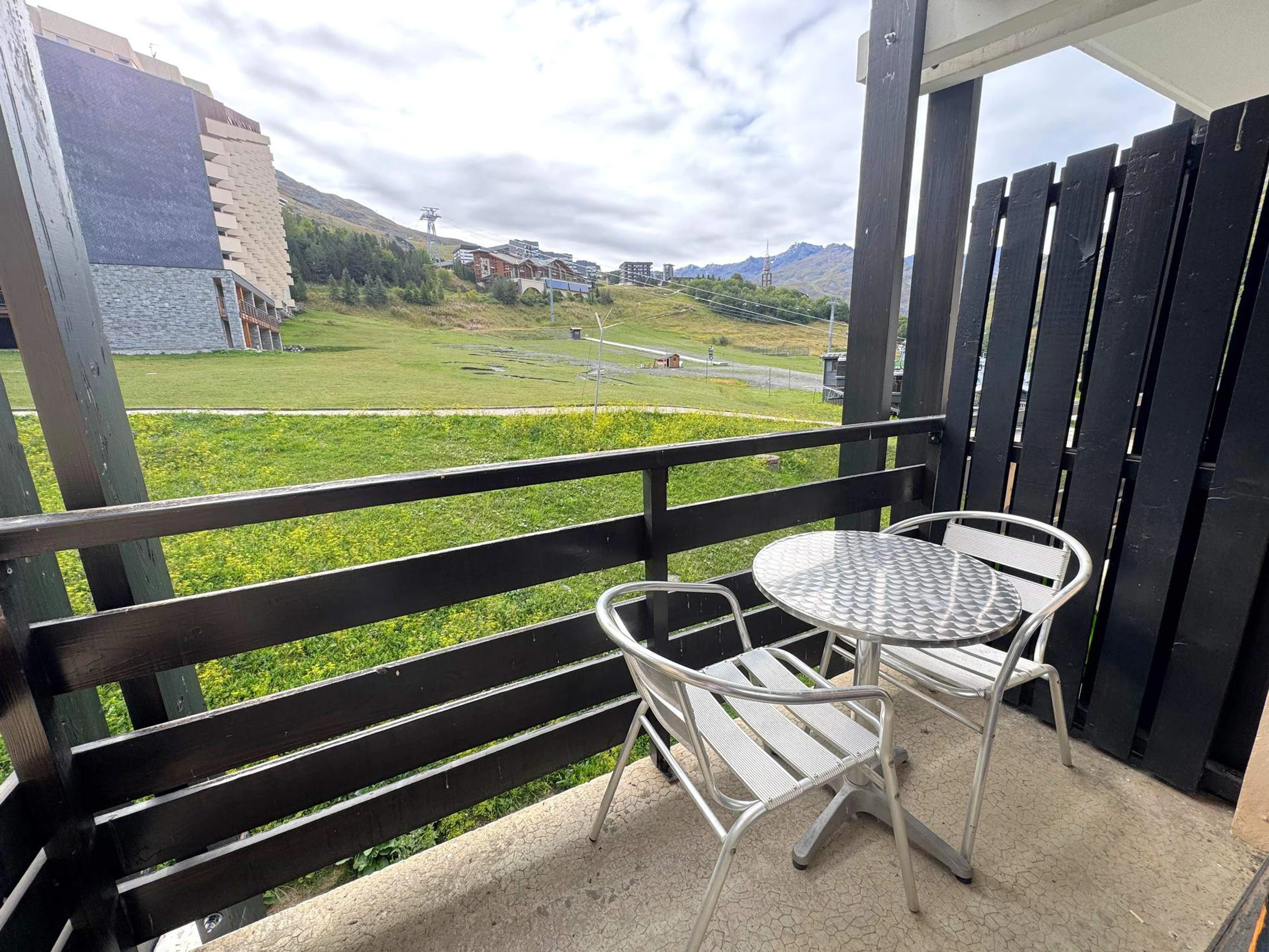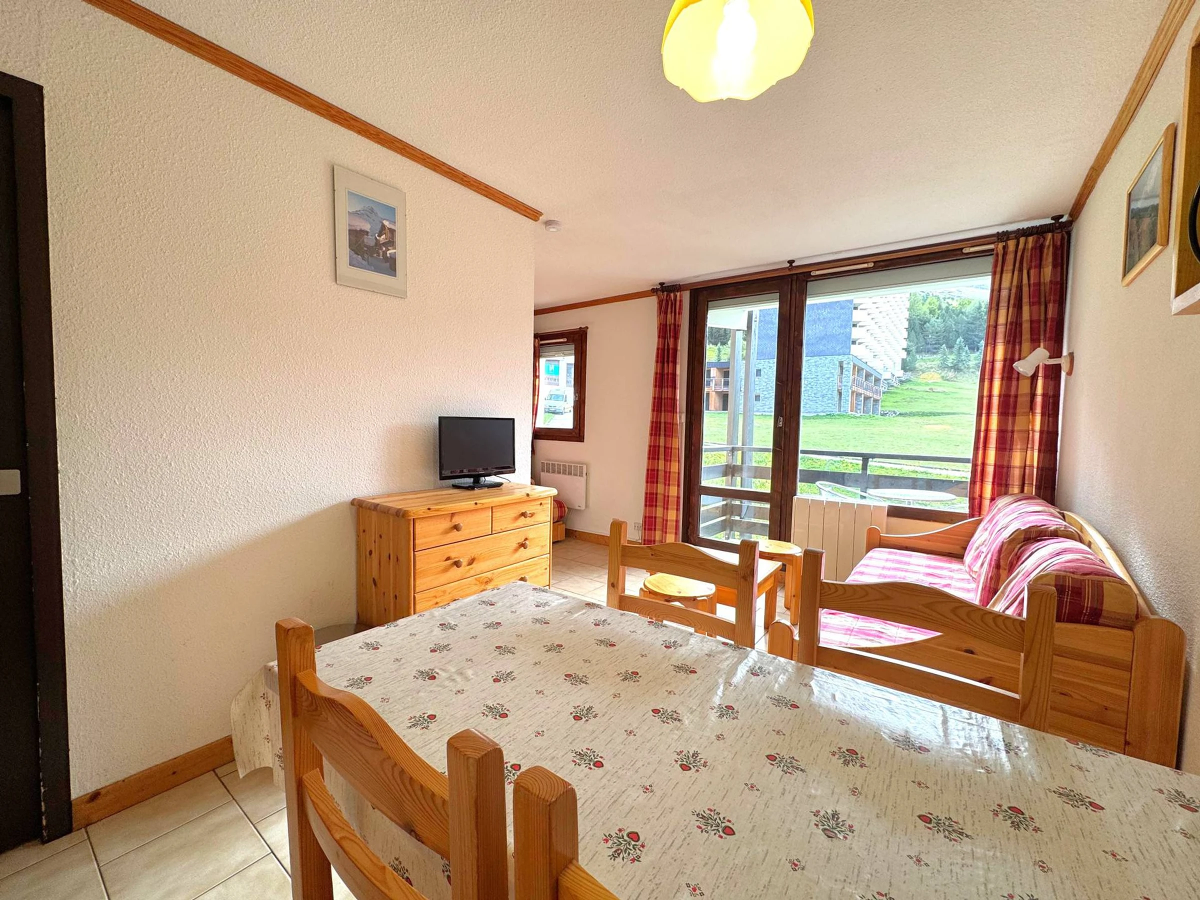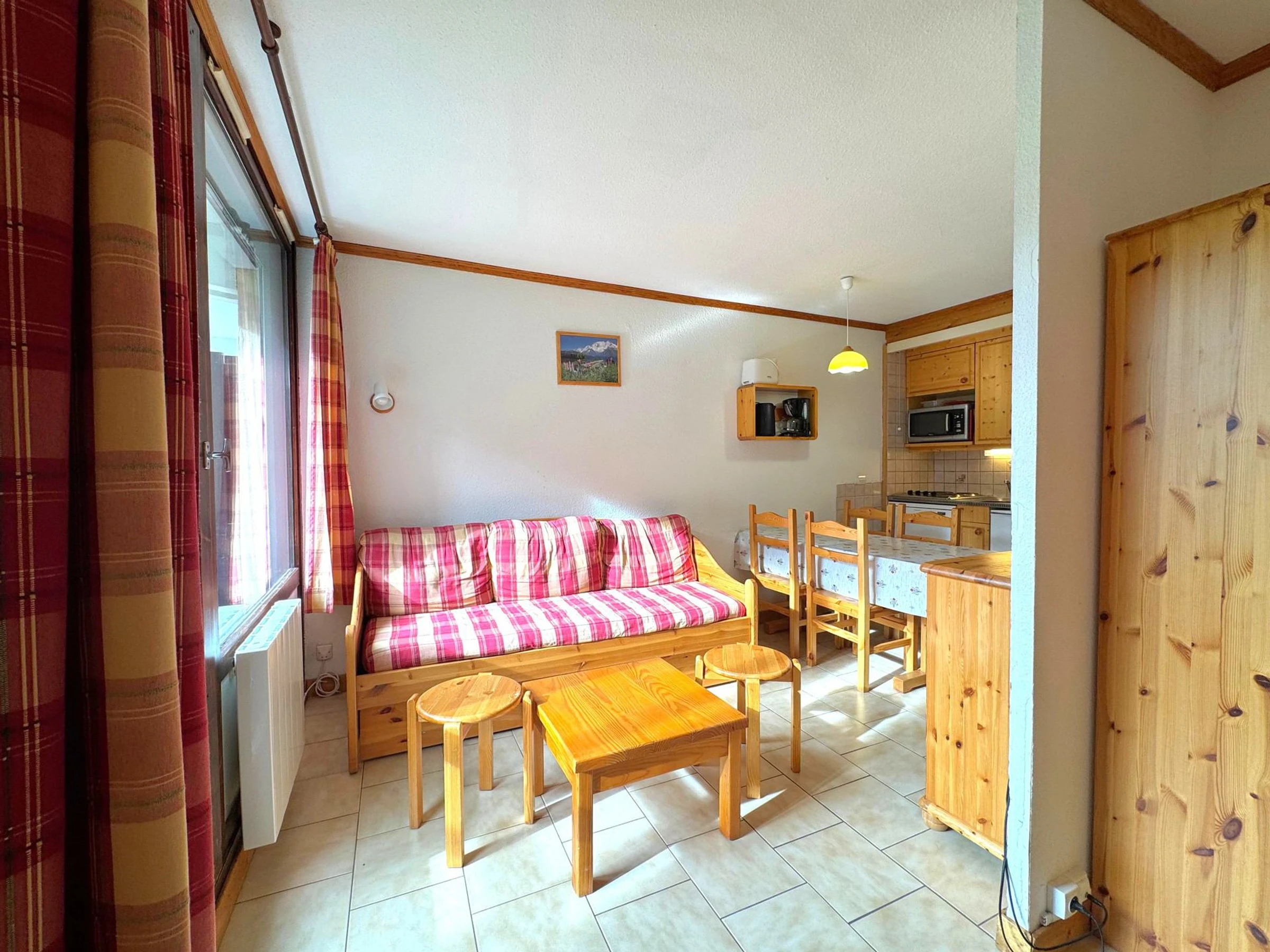 Residence Le Villaret (Nr. 322), Studio mit Schlafkabine für 4 Personen, 26 m², im 3. Stock (per Aufzug erreichbar), Ostbalkon mit Blick auf die Piste. Kostenlose Seilbahn (Betrieb bis 23:00 Uhr) verbindet Sie mit dem Ortszentrum „La Croisette“.
