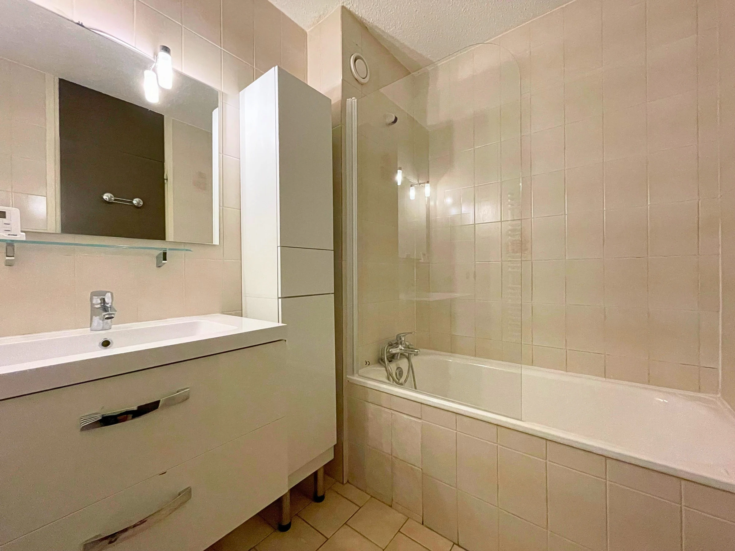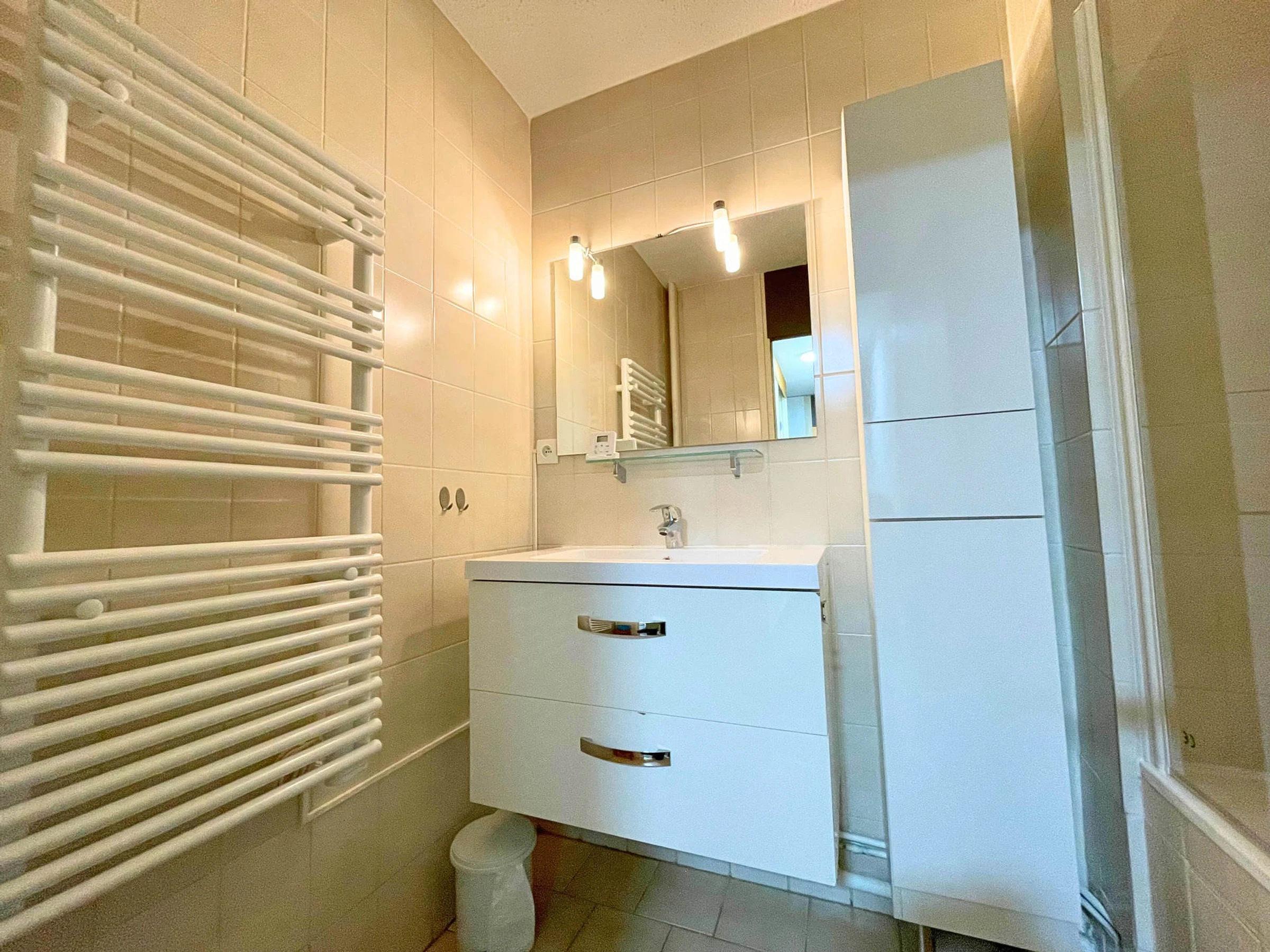 Badezimmer: Waschbecken, Badewanne, elektrischer Handtuchtrockner, Duschabtrennung