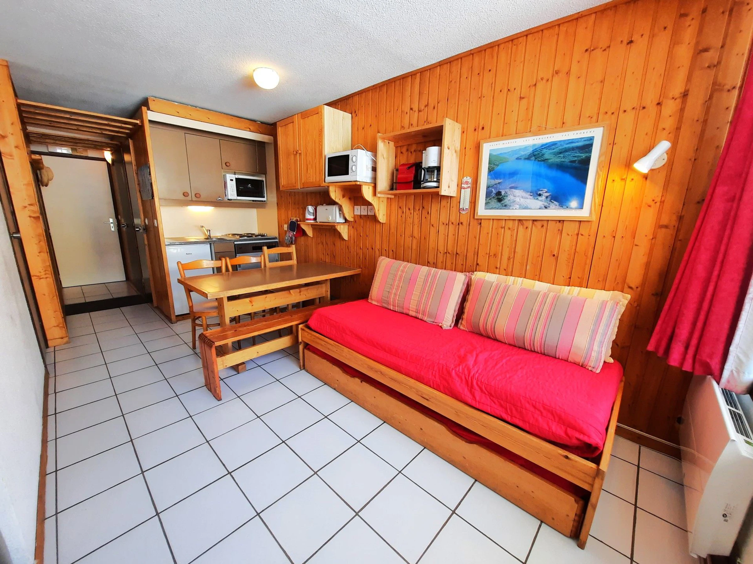 Residence Le Villaret (Nr. 712), Studio mit Schlafkabine für 4 Personen, 27 m², im 6. Stock (erreichbar mit dem Aufzug, nach Zugang zum 7. Stock über eine Treppe), Ostbalkon mit Blick auf die Pisten. Kostenlose Seilbahn (Betrieb bis 23:00 Uhr) verbindet Sie mit dem Ortszentrum „La Croisette“.