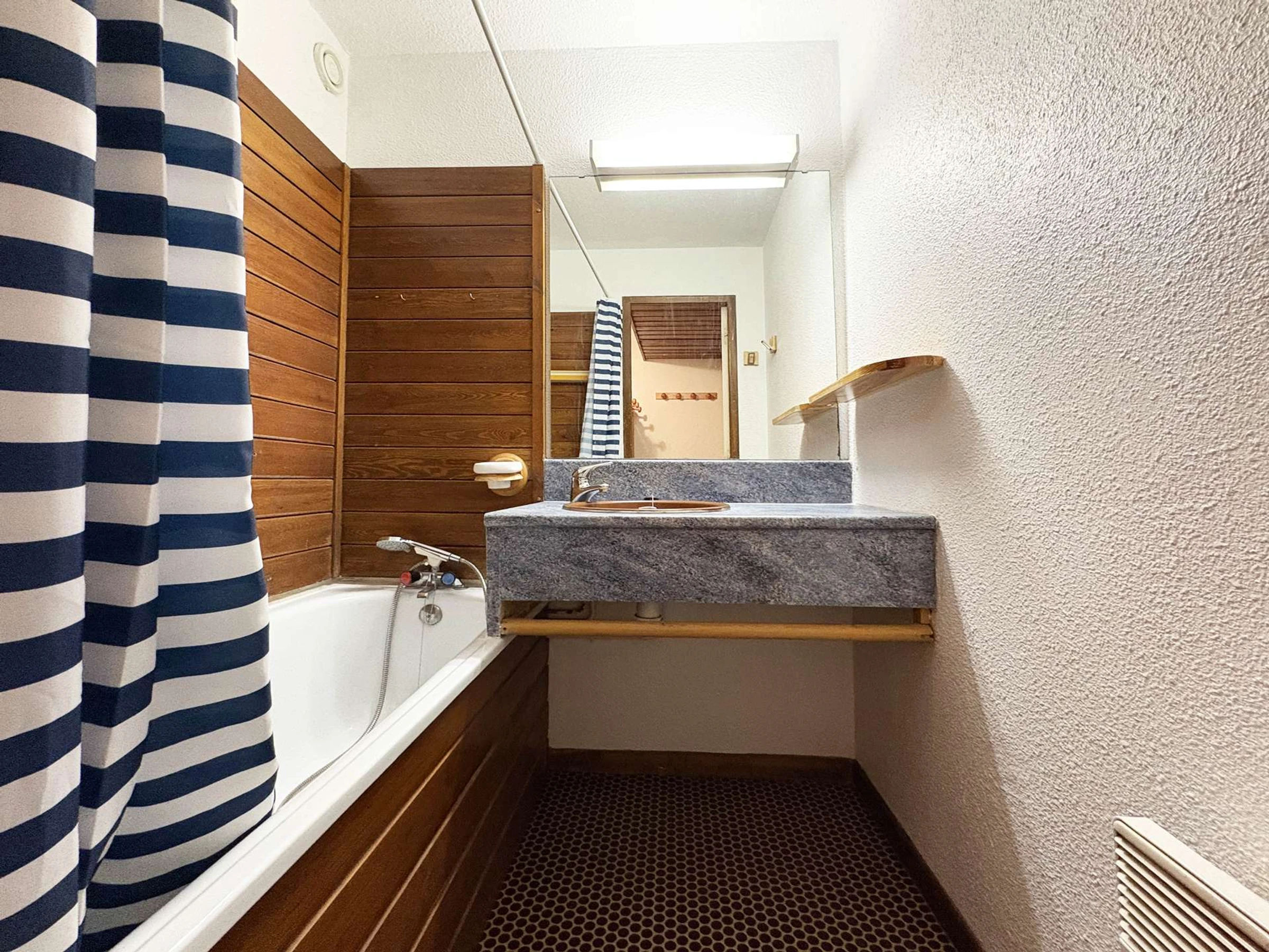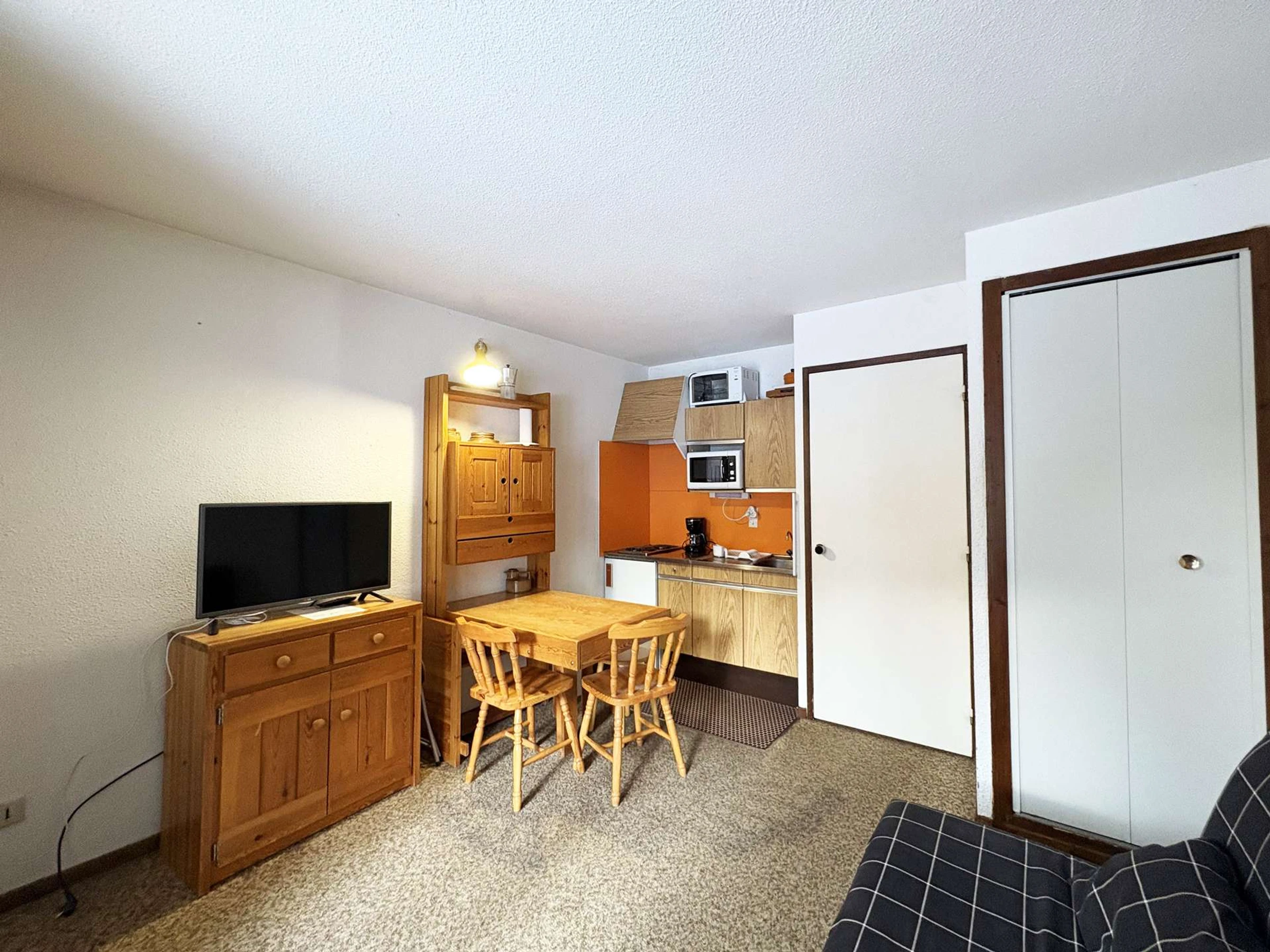 Residenz Le Pouzenc, Stadtteil Prébois, 100 Meter vom Sessellift und den Geschäften von Prélongis entfernt. Zugang zum kostenpflichtigen Gemeinschaftsparkplatz im Freien direkt vor der Residenz. Studio für vier Personen im 1. Stock, bestehend aus einem Eingangsbereich, einer Bergecke mit zwei Etagenbetten, einem Badezimmer und einer separaten Toilette, Schränken, einem Küchenbereich, einem Wohnzimmer mit einer ausziehbaren Zweisitzer-Bank, nach Süden ausgerichtet Balkon. Skibox.