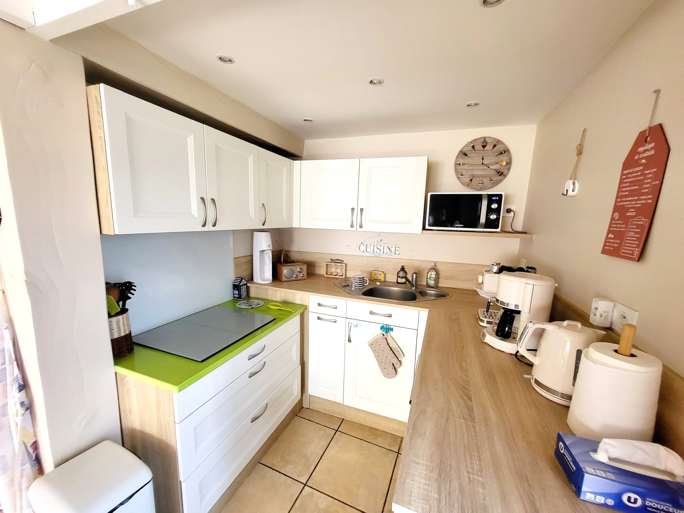 Auf dem Grundstück befindet sich außerdem ein Nebengebäude mit einem Schlafzimmer im Obergeschoss mit einem Doppelbett (140 x 190 cm). Eine Garage, die als Abstellraum genutzt wird, ist ebenfalls vorhanden und eignet sich ideal für die Unterbringung von Fahrrädern oder Surfbrettern.