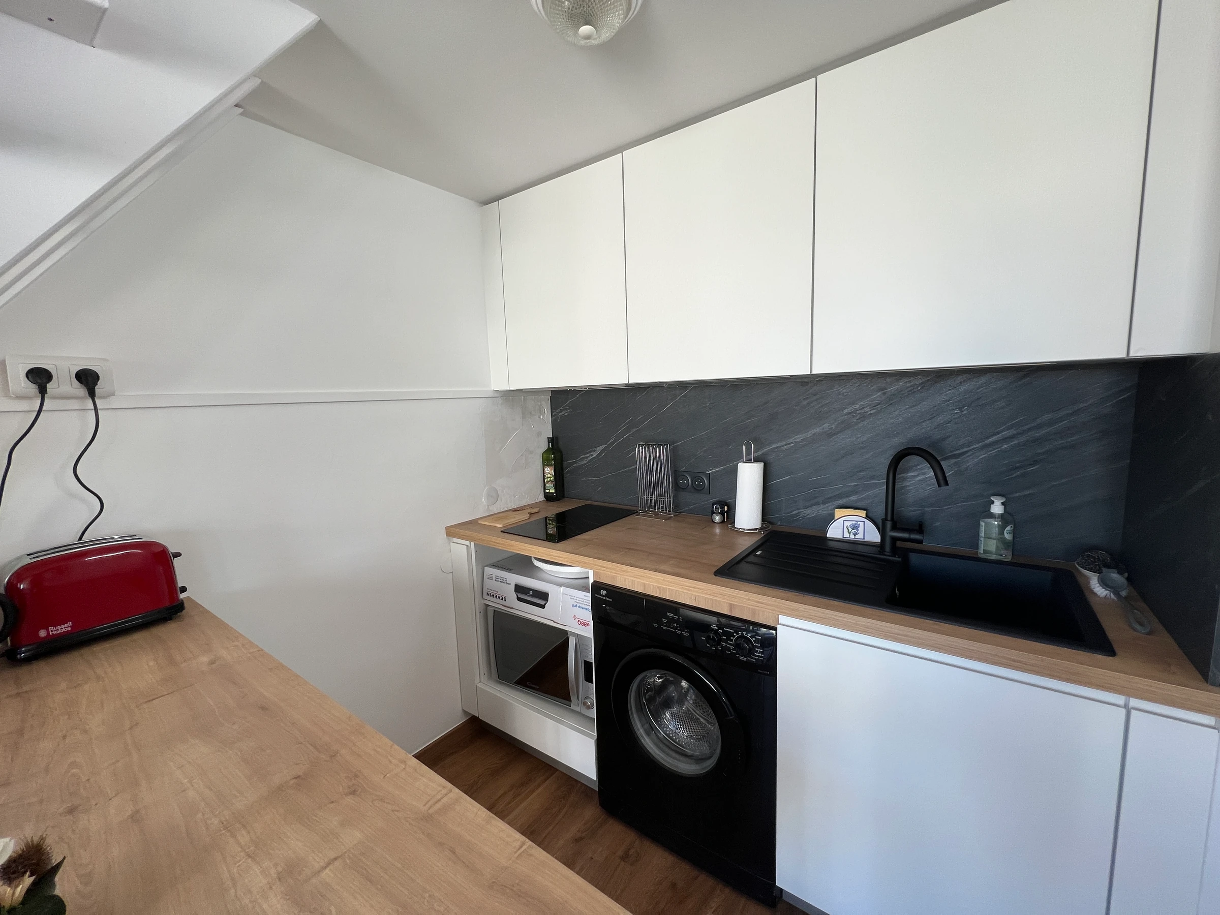 Ein Wohnzimmer mit Einbauküche (Waschmaschine, Nespresso-Kaffeemaschine, Bodrum, Elektroherd, Wasserkocher, Toaster)