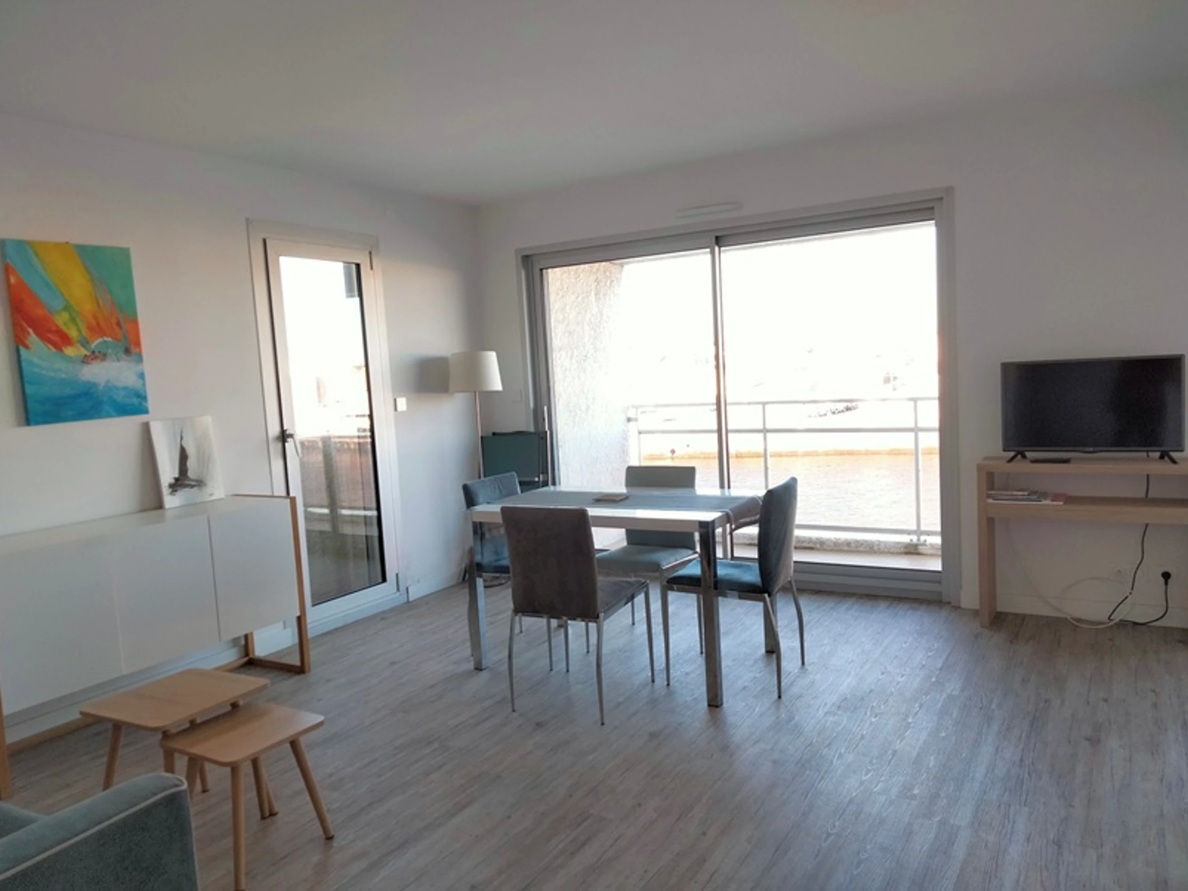 Eingangshalle, Wohnzimmer mit Doppelschlafcouch, TV, Schlafzimmer mit Blick auf den Kanal und 160 cm breitem Bett, Einbauküche (Cerankochfeld, Backofen, Geschirrspüler, Mikrowelle, Kühlschrank), WC, Waschmaschine.