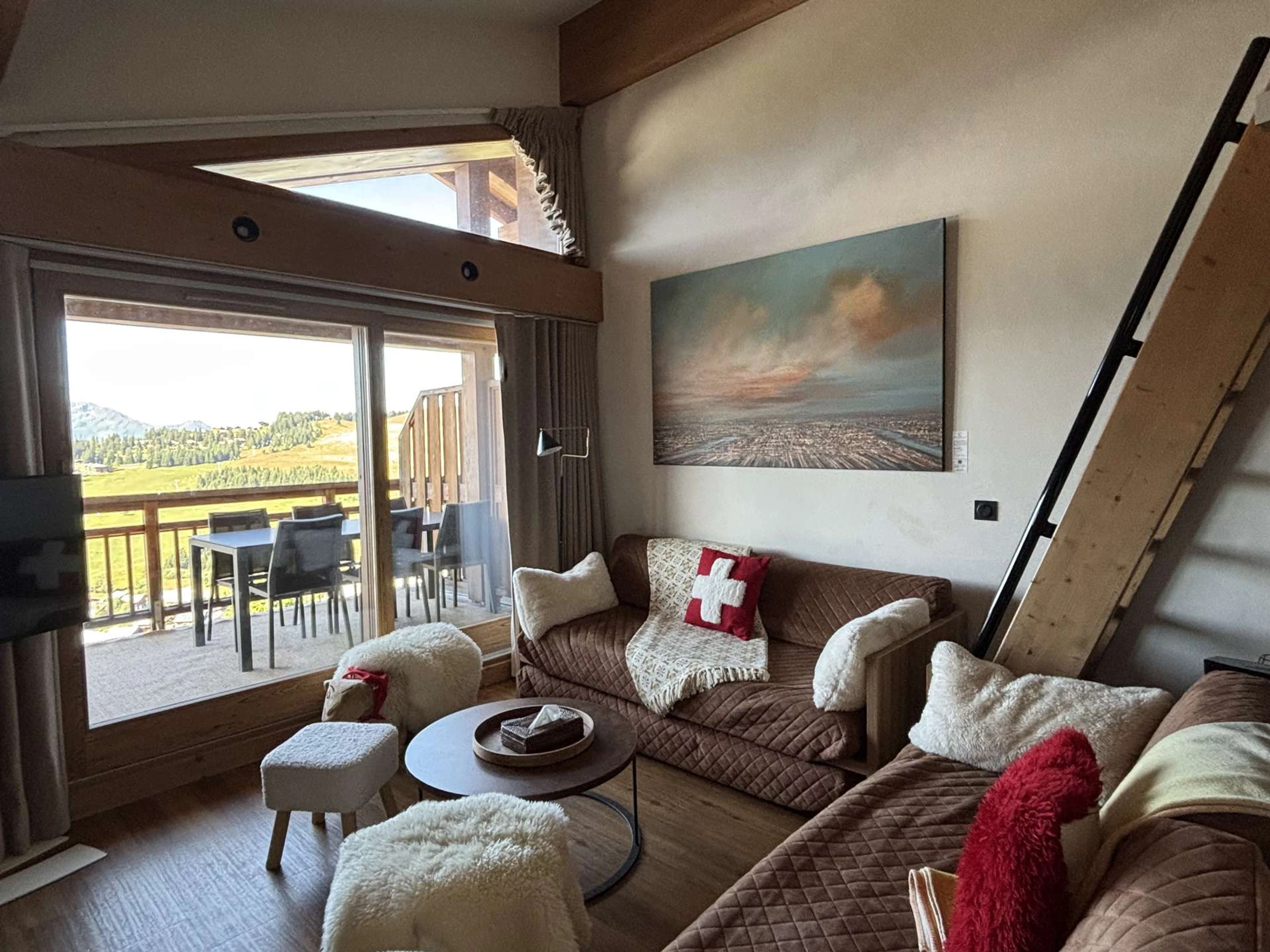 Sie profitieren vom Panoramablick im Dachgeschoss, einem Holzofen (Kaminpaket extra), TV in allen Zimmern und einem Mezzanin.