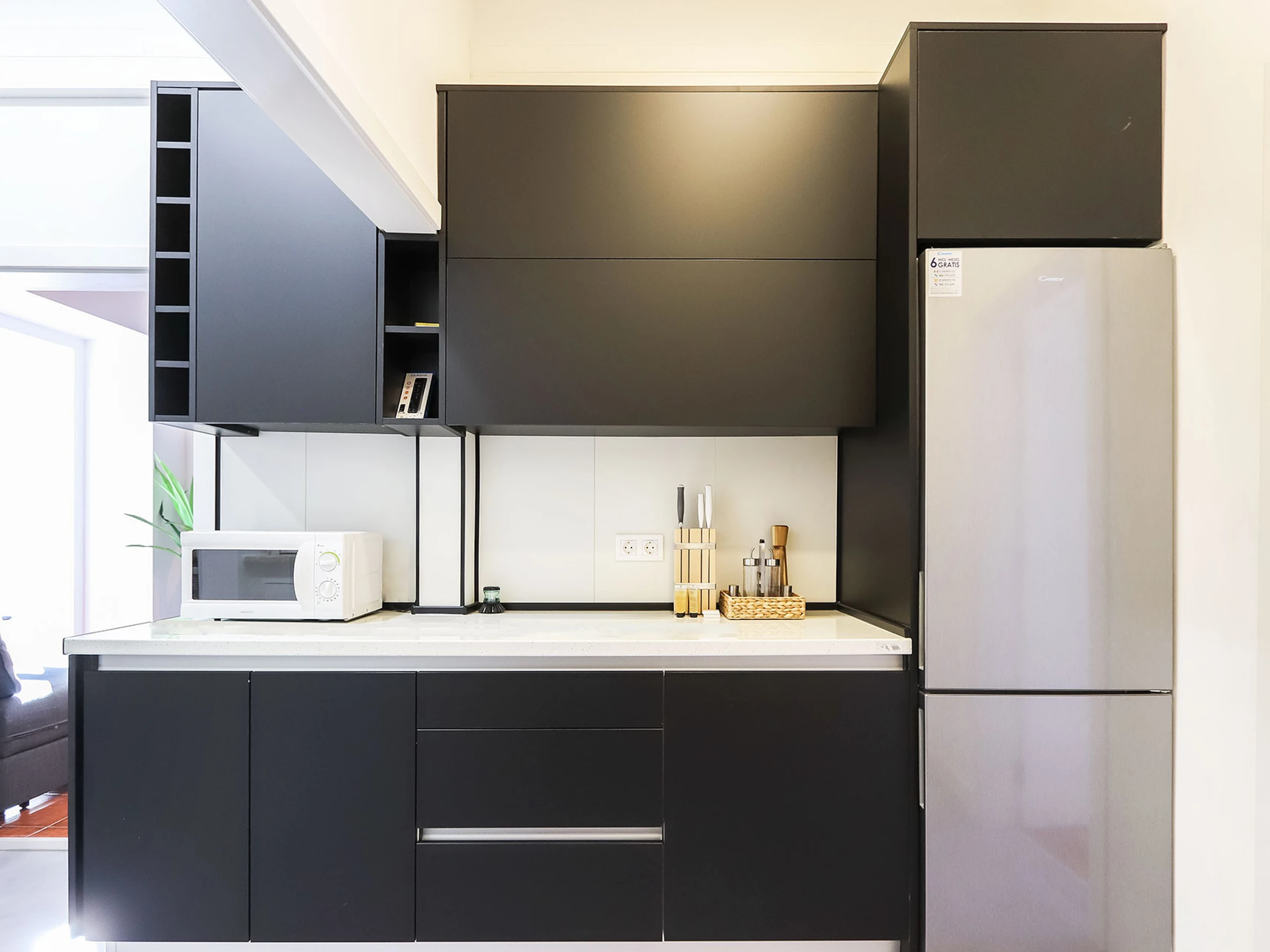 Dieses separate küche, mit induktions-kochfeld, ist ausgestattet in kühlschrank, mikrowelle, backofen, gefrierschrank, spülmaschine, geschirr/besteck, kochutensilien, kaffeemaschine, toaster und wasserkocher.