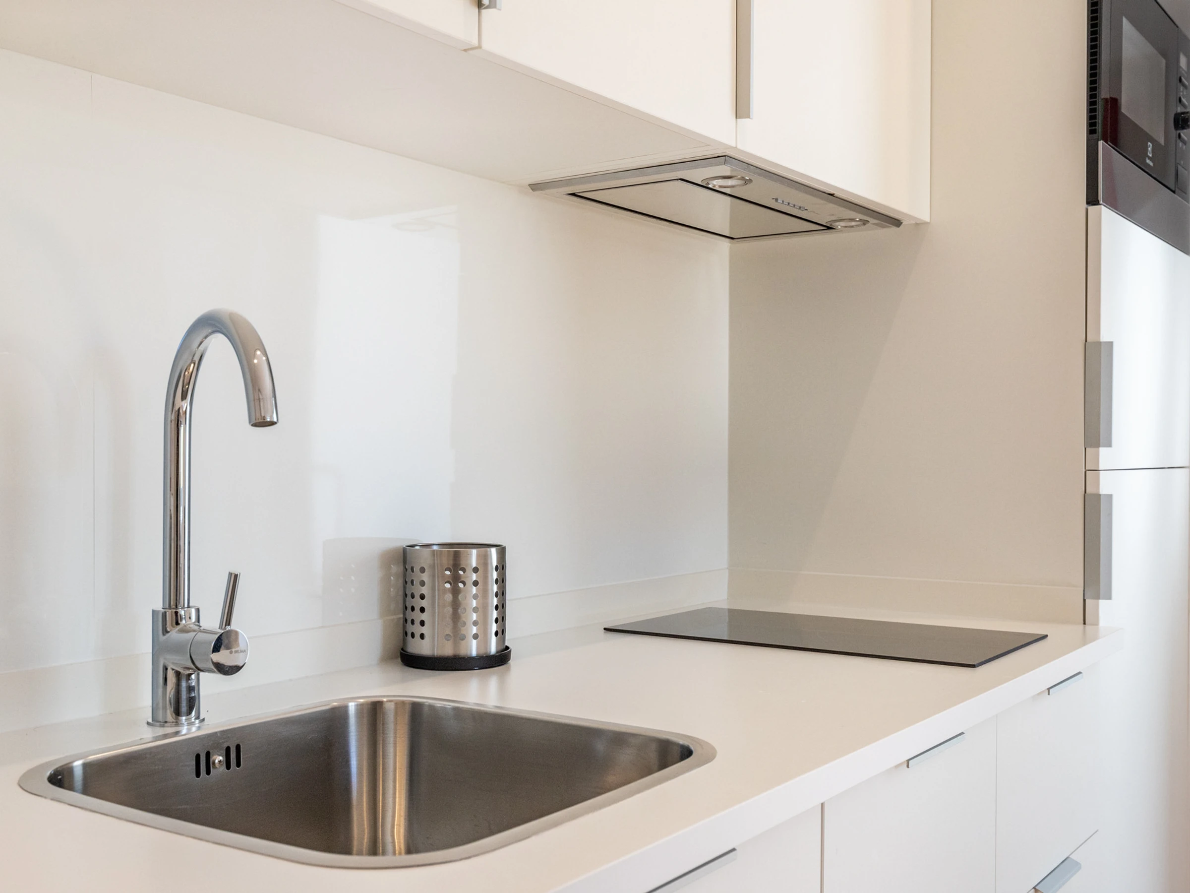 Dieses offene küche, elektrisches kochfeld, ist ausgestattet in kühlschrank, mikrowelle, backofen, gefrierschrank, spülmaschine, geschirr/besteck, kochutensilien, kaffeemaschine, toaster und wasserkocher.