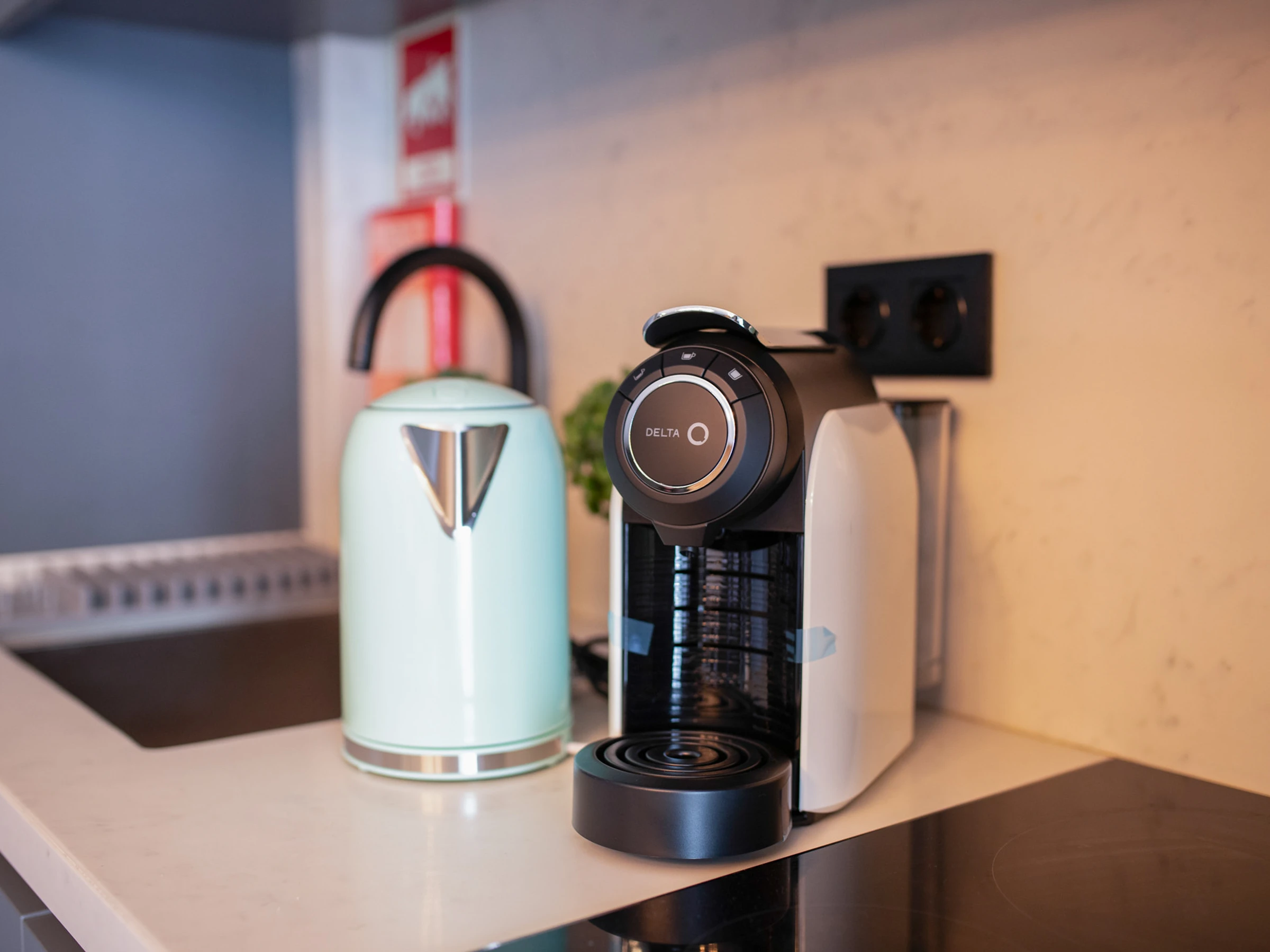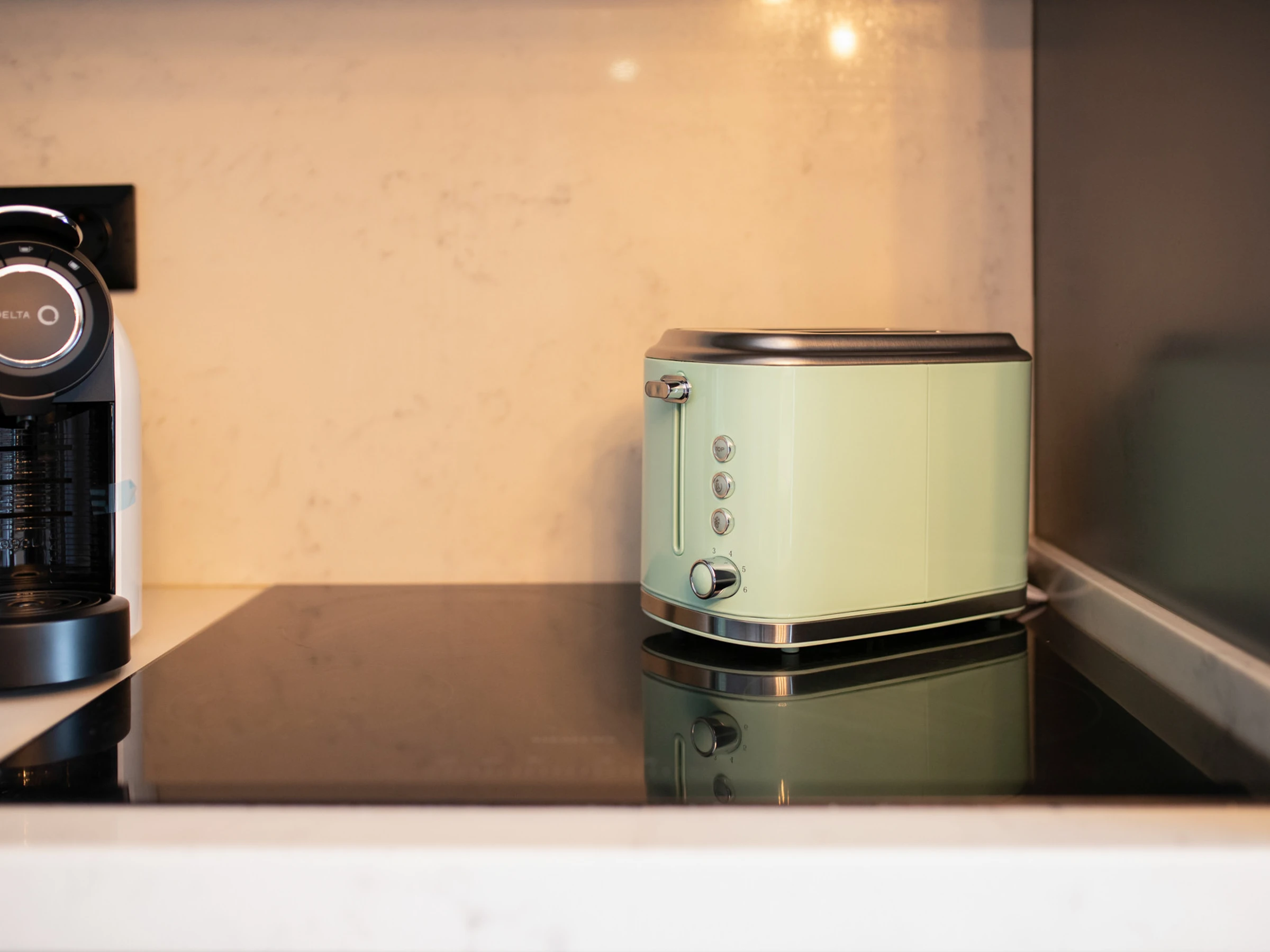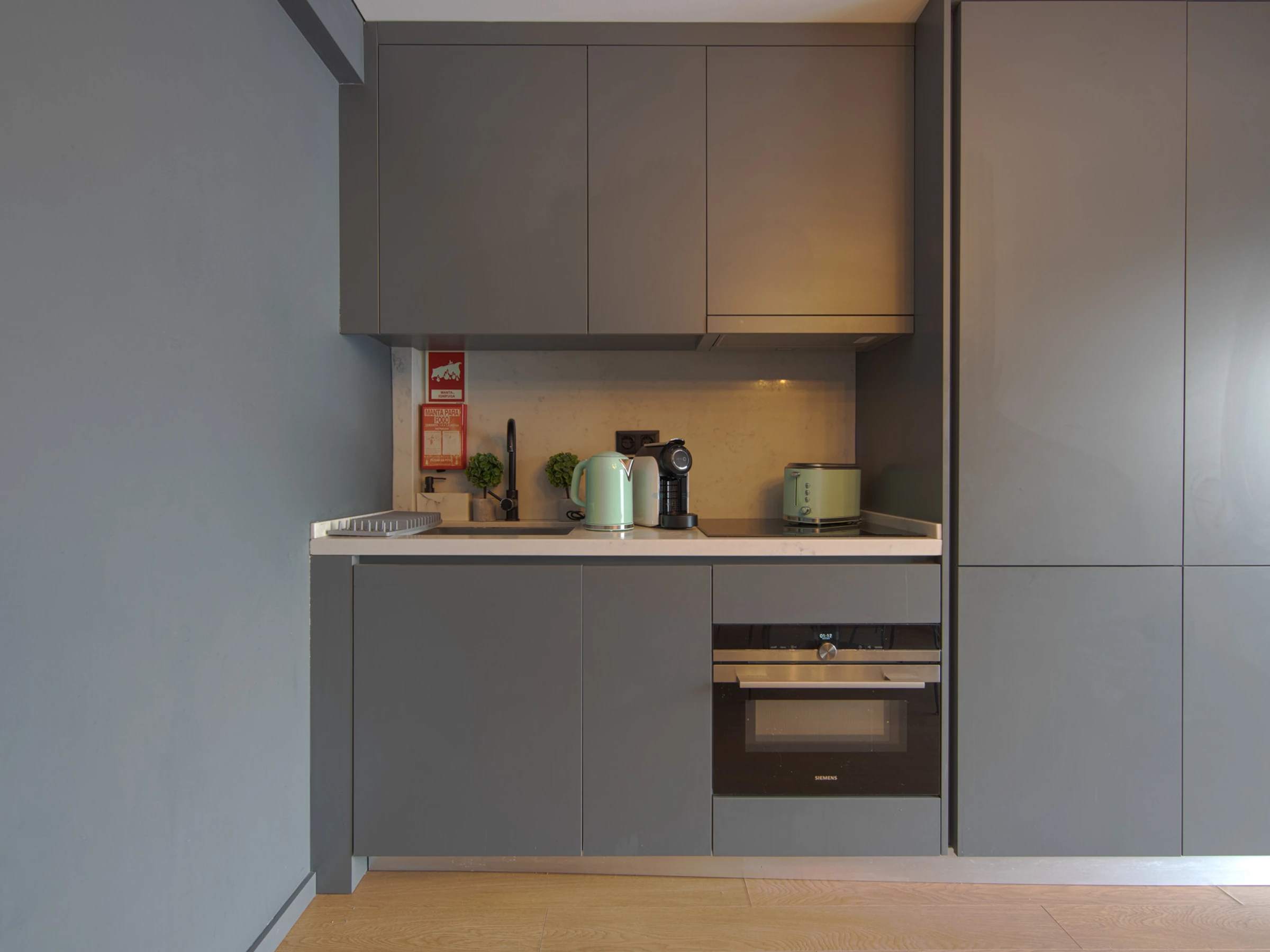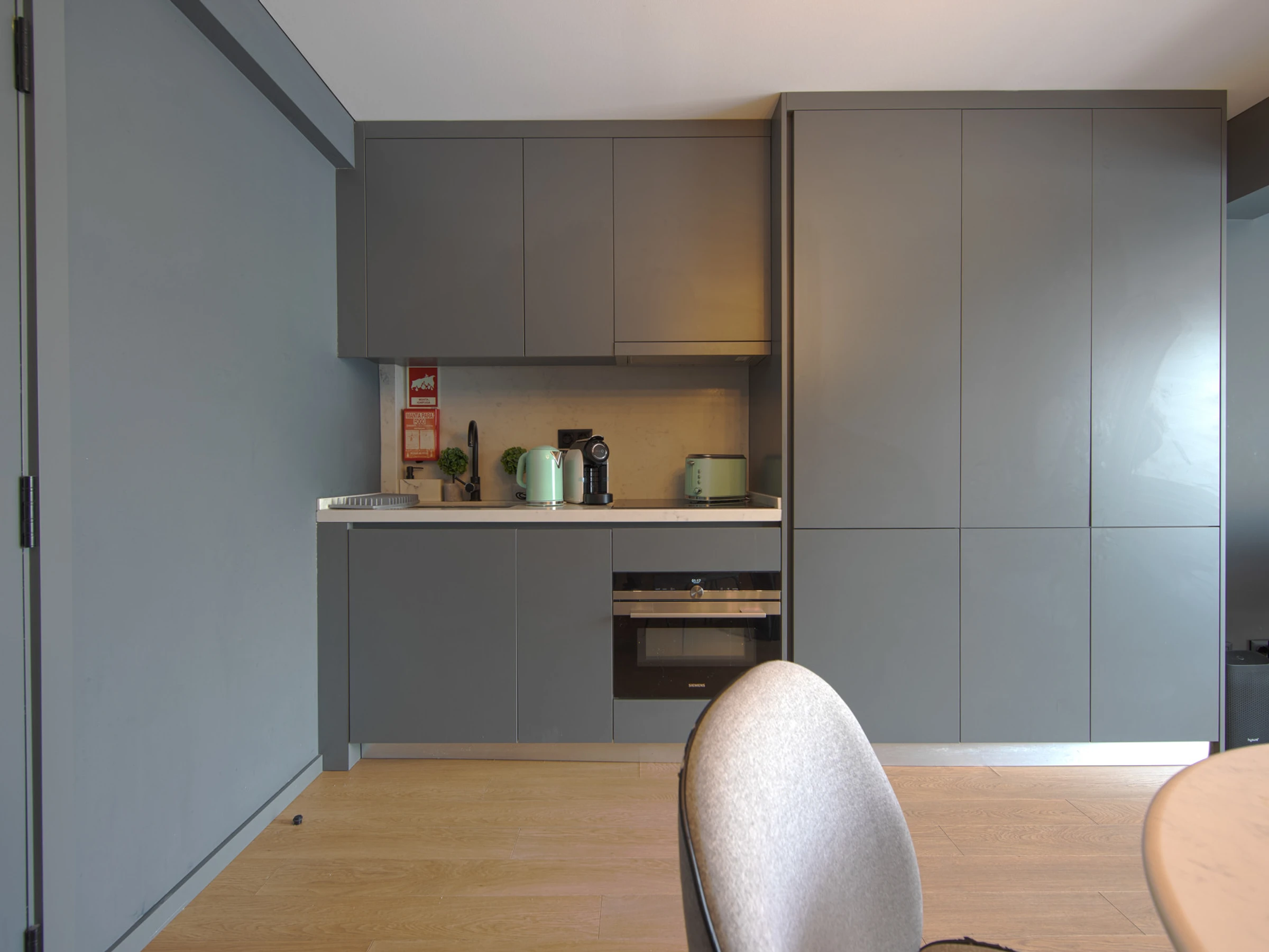 Dieses offene küche, mit induktions-kochfeld, ist ausgestattet in kühlschrank, mikrowelle, backofen, gefrierschrank, spülmaschine, geschirr/besteck, kochutensilien, kaffeemaschine, toaster und wasserkocher.