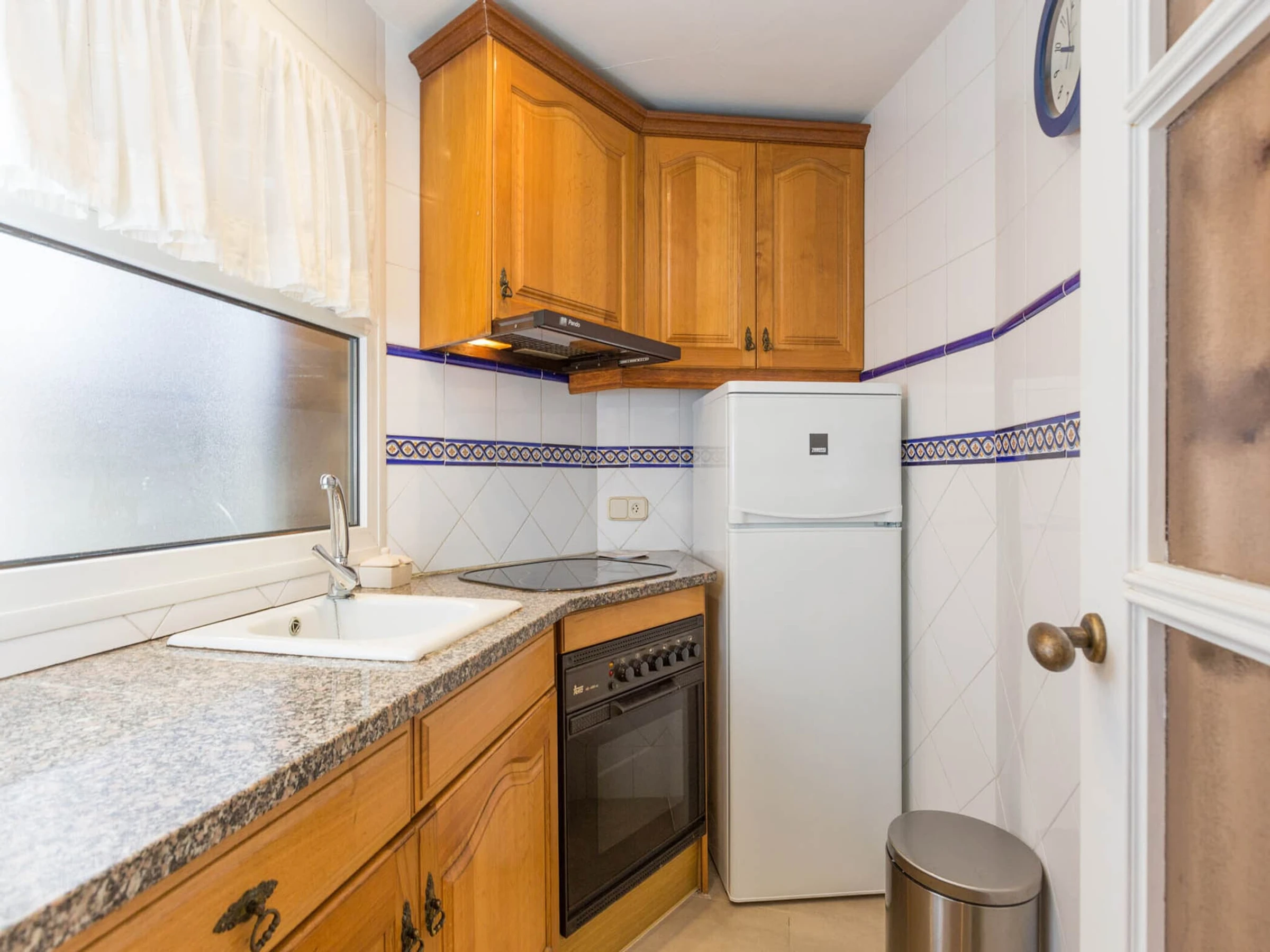 Dieses küche, ist ausgestattet in kühlschrank, backofen, gefrierschrank, kaffeemaschine und toaster.