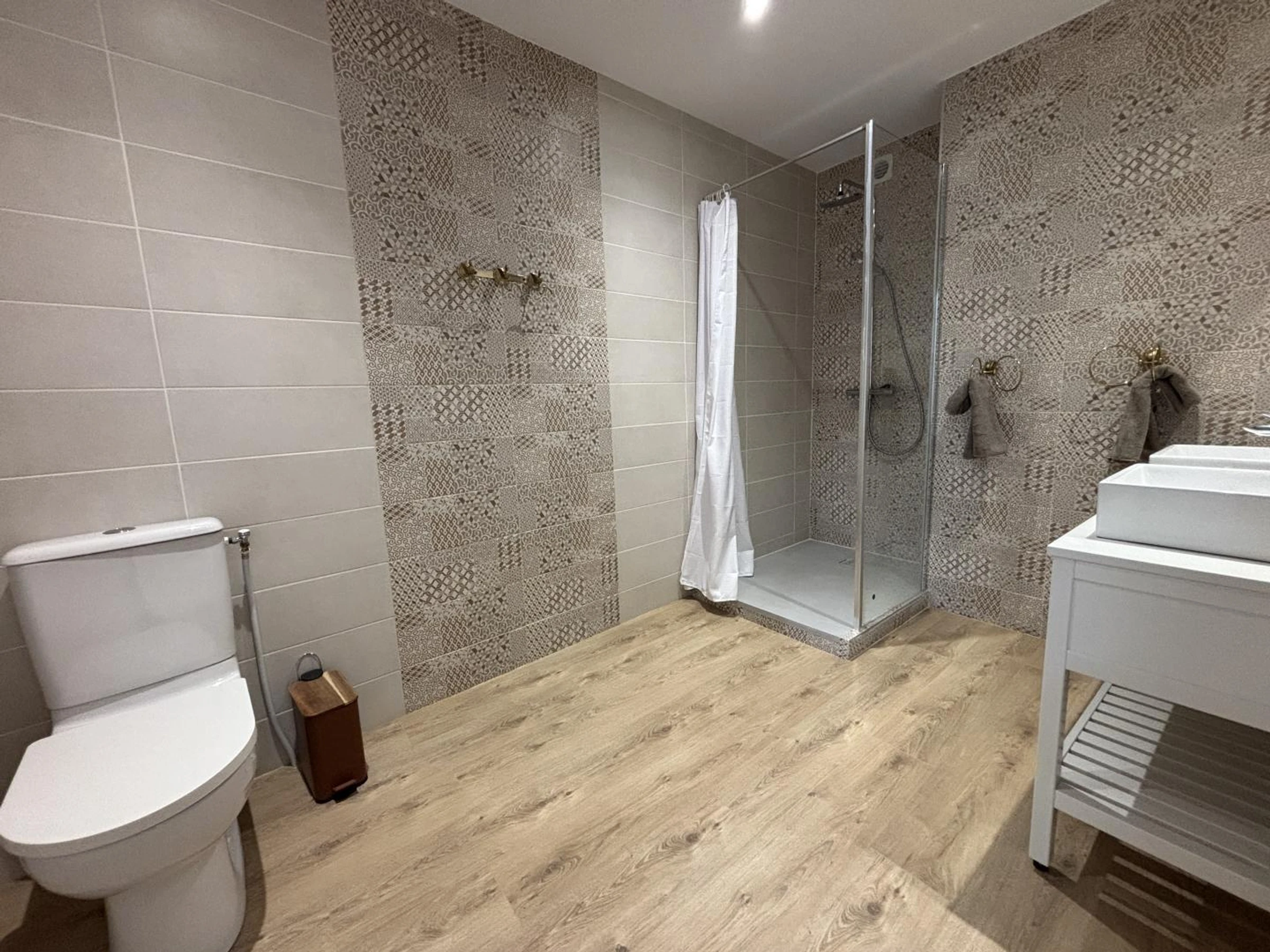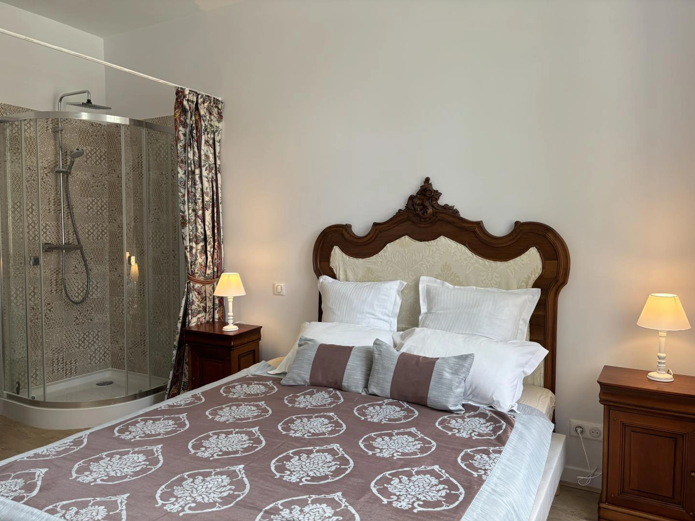 Erster Stock: Klimatisierte Küche und Wohnzimmer, ein Doppelzimmer und ein Einzelzimmer im Turm (beide angrenzend) mit jeweils eigenem Bad (Dusche/WC) sowie ein Doppelzimmer mit eigenem Bad (Dusche) und separatem WC.