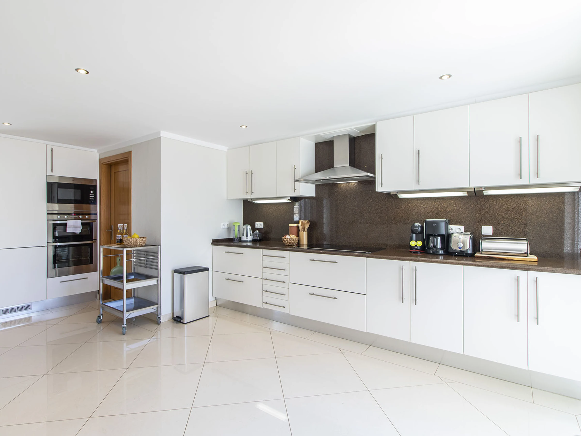 Dieses offene küche, mit ceranfeld, ist ausgestattet in kühlschrank, mikrowelle, backofen, gefrierschrank, spülmaschine, geschirr/besteck, kochutensilien, kaffeemaschine, toaster und wasserkocher.