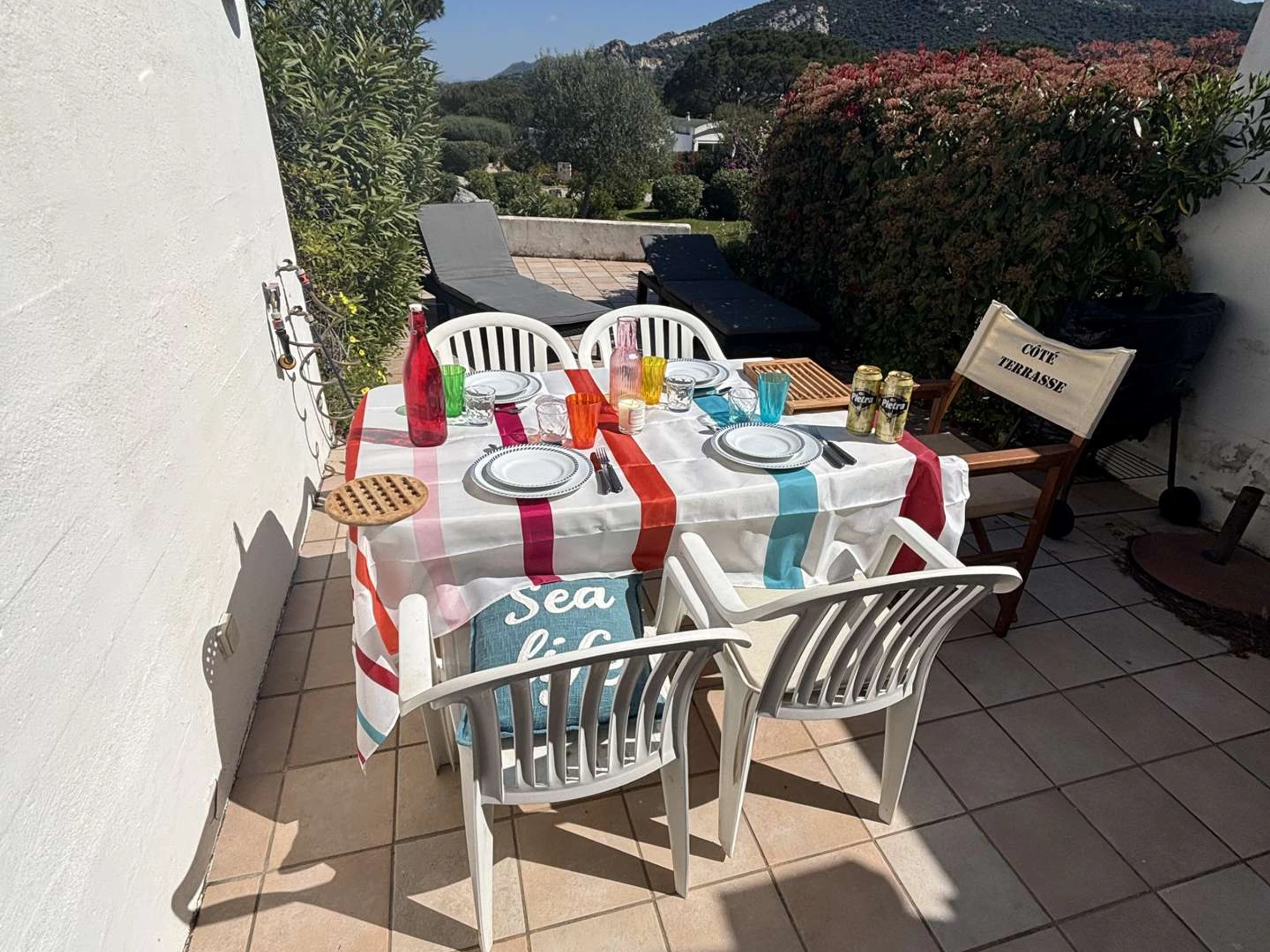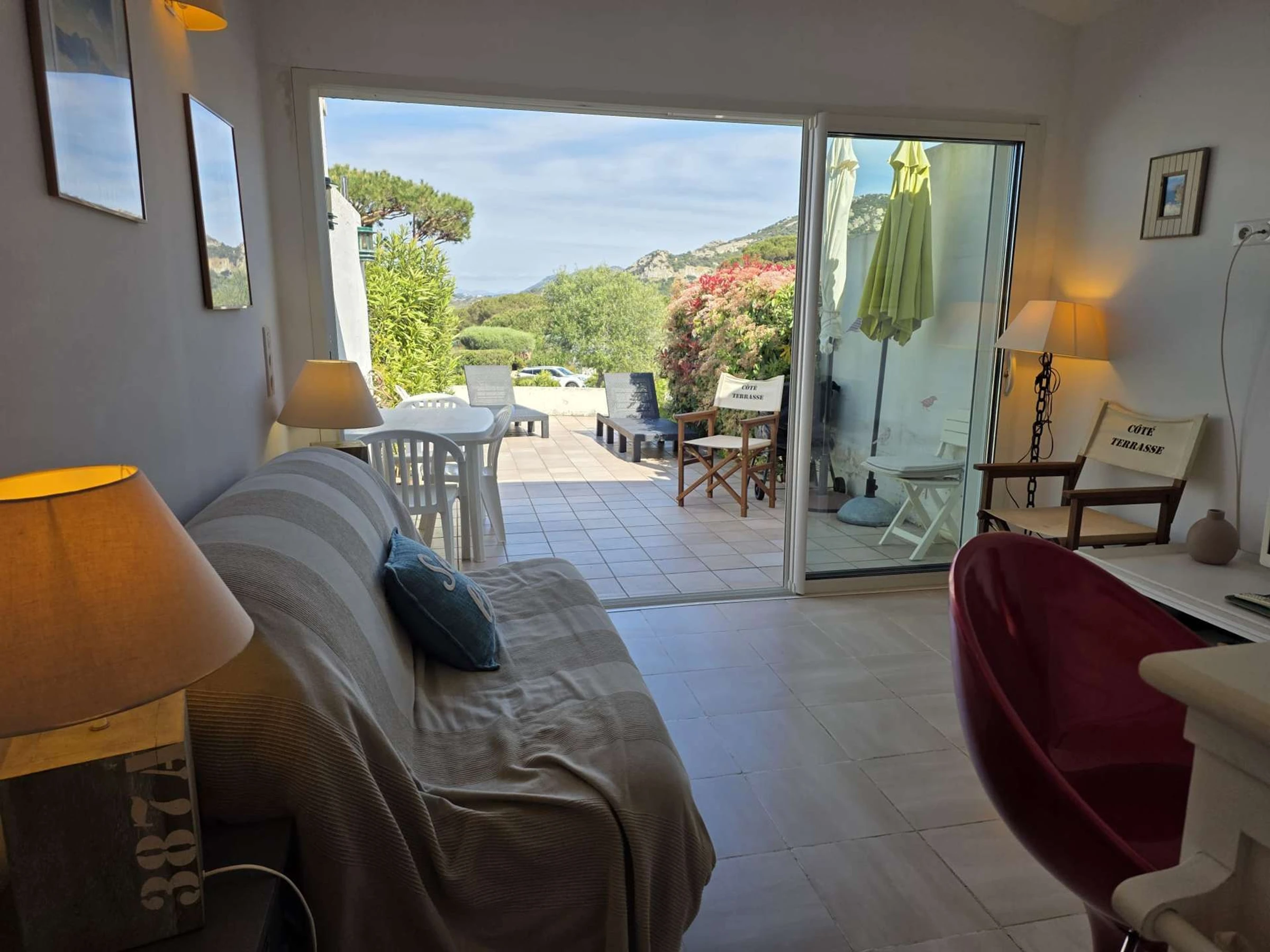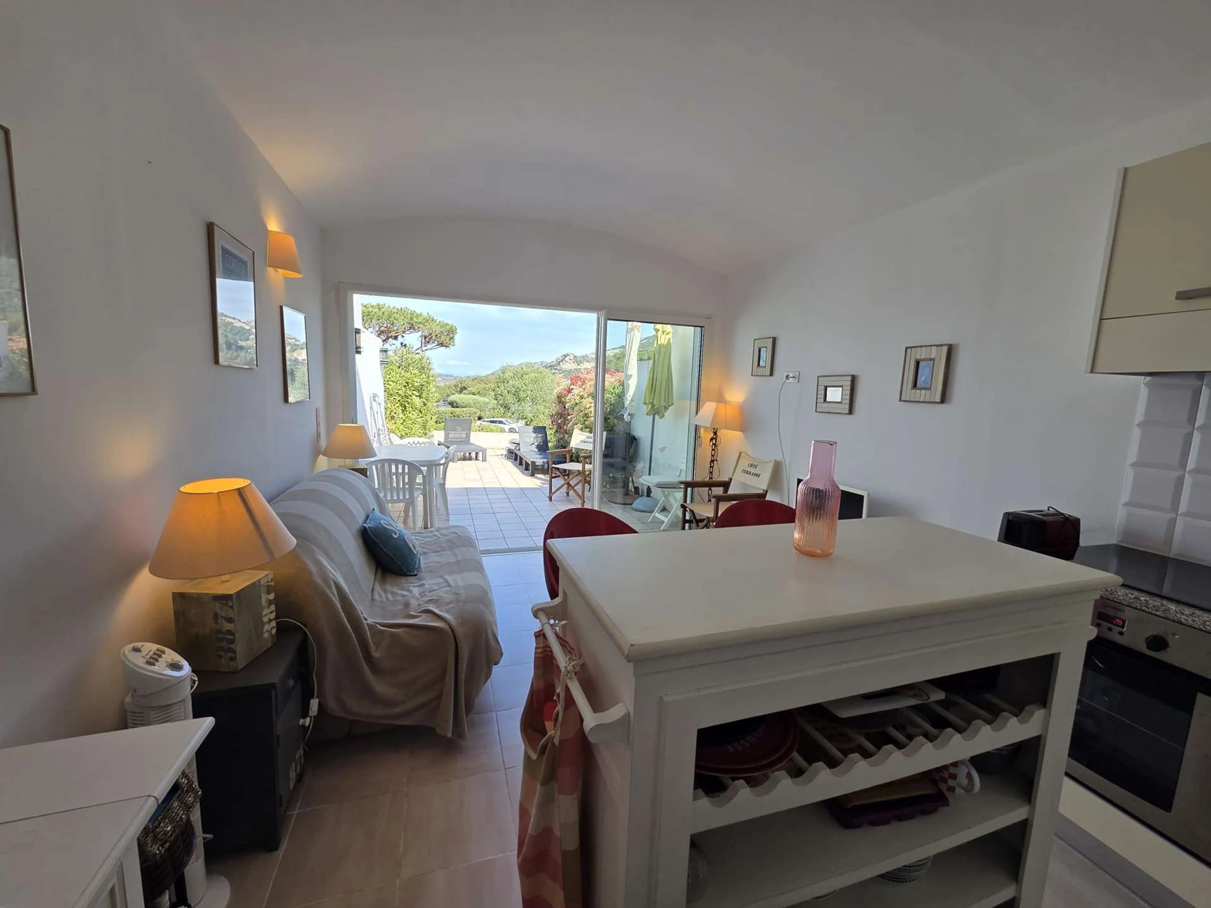 Sie verfügt über eine voll ausgestattete Küche, ein Wohnzimmer mit Schlafcouch und Zugang zu einer schönen Terrasse, zwei Schlafzimmer (eines mit zwei Doppelbetten) sowie ein Badezimmer mit WC.