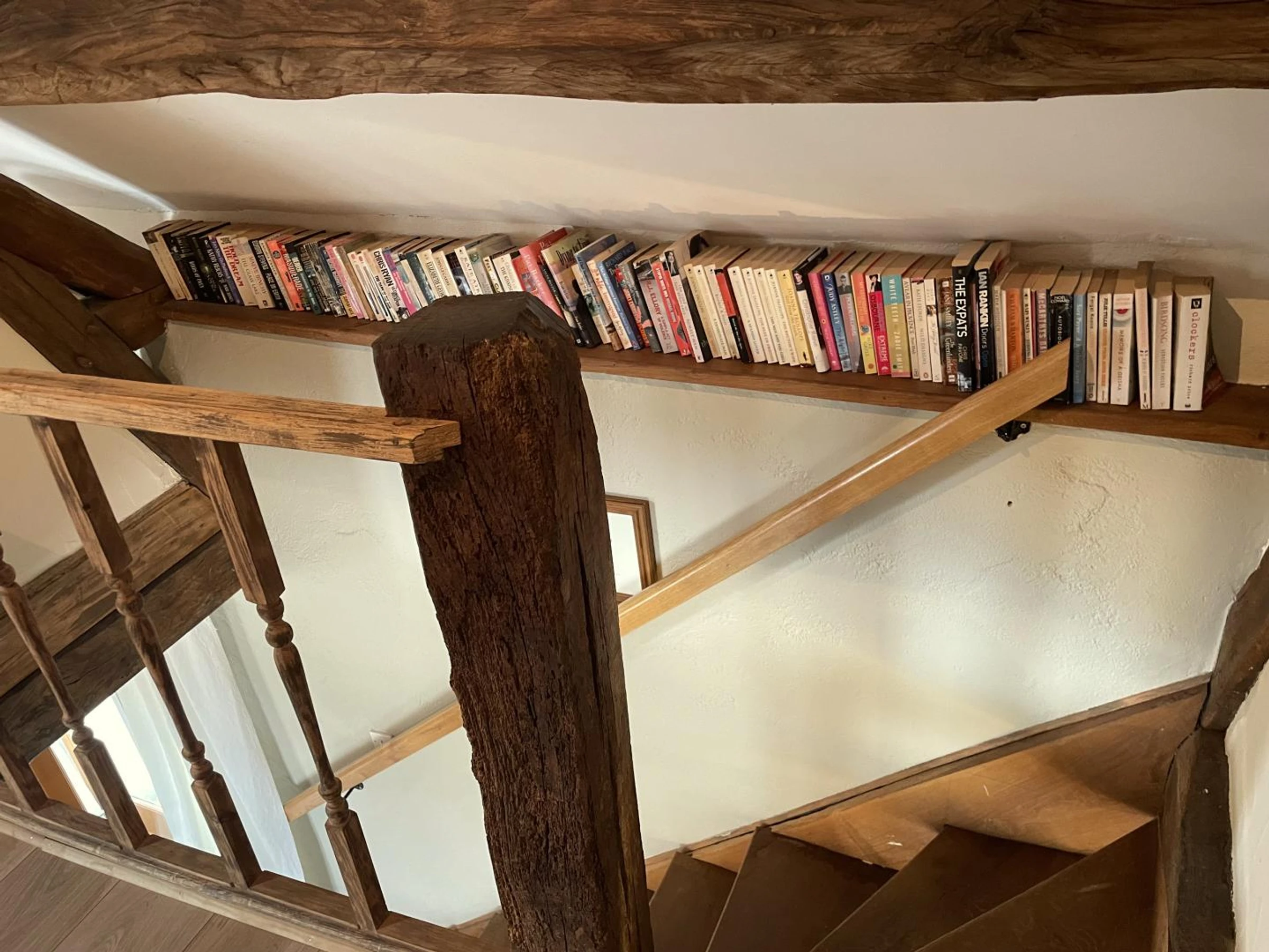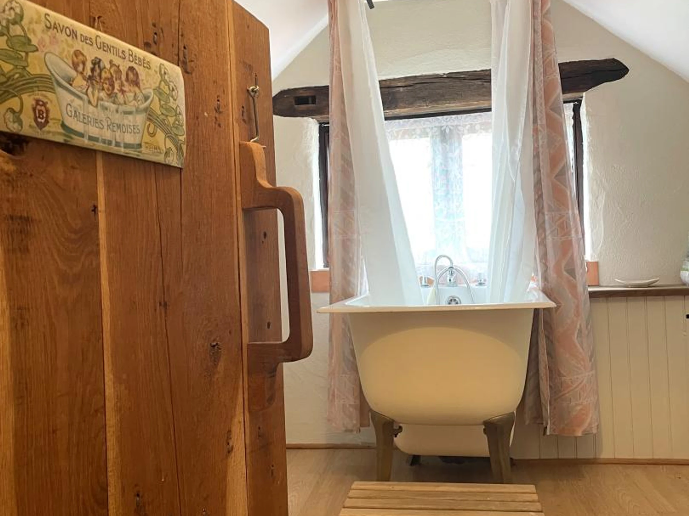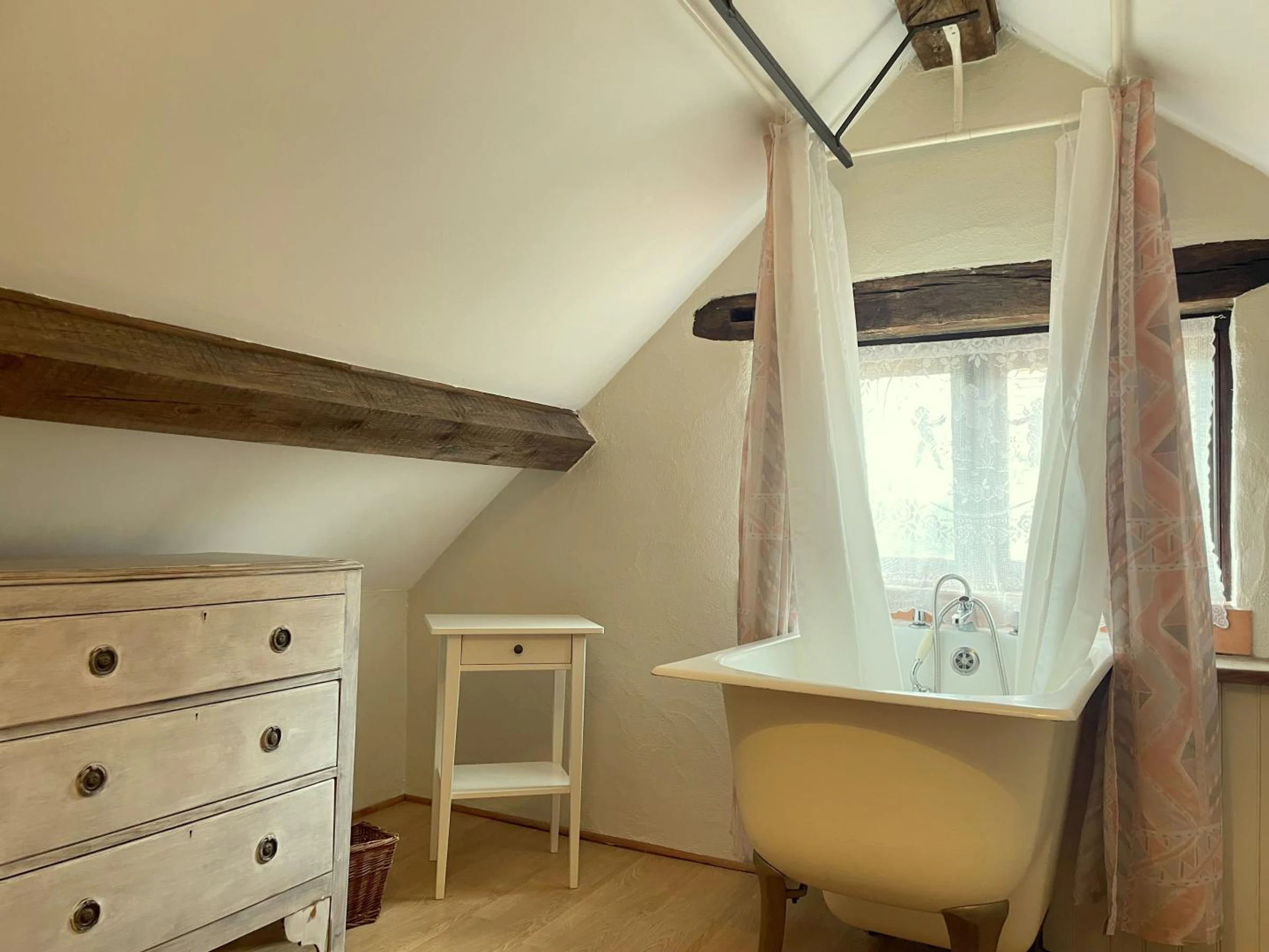 Über die Holztreppe gelangen Sie in das Zwischengeschoss mit Schlafbereich und Badezimmer, das durch eine antike Tür unter den Balken (130 cm hoch) zugänglich ist. Klimaanlage warm/kalt.