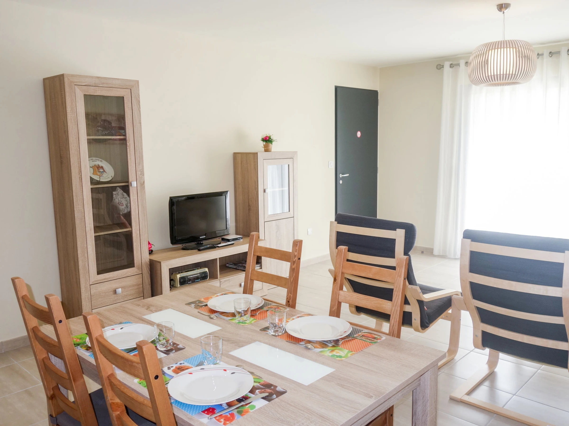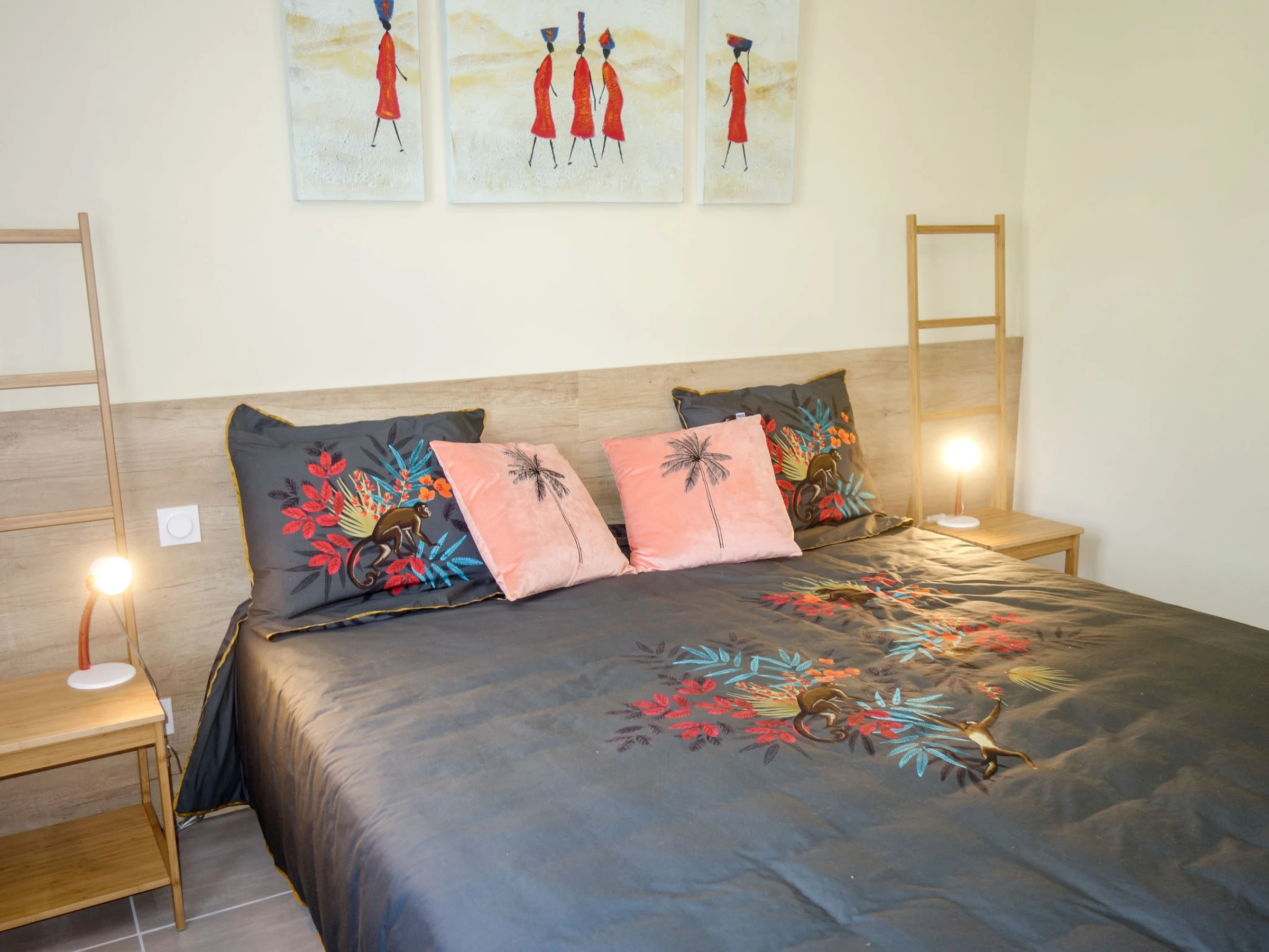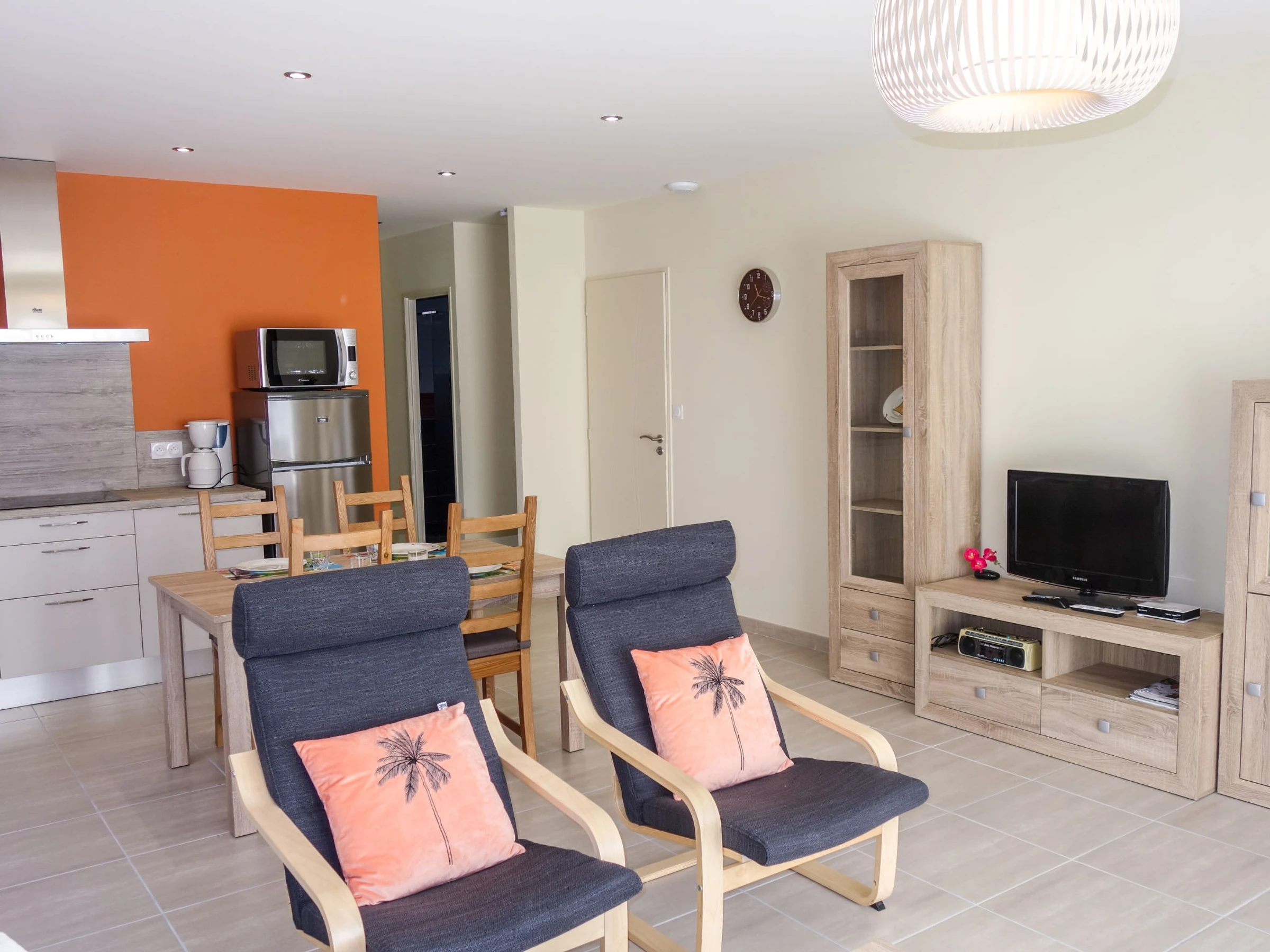 "Le Clos des Aires", 2-Zimmer-Wohnung 58 m2, im Erdgeschoss. Wohn-/Esszimmer 34 m2 mit Panoramafenster mit 1 Doppeldiwanbett (140 cm), Sat-TV und Internationale TV-Sender (Flachbildschirm), Klimaanlage. Ausgang zur Terrasse. 1 Zimmer mit begehbarer Kleiderschrank mit 2 Betten (90 cm, Länge 190 cm). Offene Küche (Geschirrspüler, 3 Glaskeramikherd Platten, Mikrowelle, Tiefkühler). Dusche, sep. WC, Doppelwaschbecken. E-Heizung. Terrasse 15 m2. Terrassenmöbel, Liegestühle. Zur Verfügung: Waschmaschine, Kinderhochstuhl, Babybett. Internet (Wireless LAN, gratis). Parkplatz (2 Autos). Bitte beachten: geeignet für Familien. 1 Haustier/Hund erlaubt. Rauchmelder.