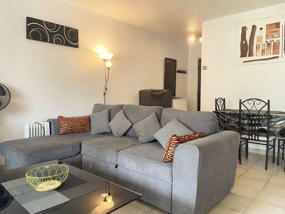 Unterkunft: Diese Wohnung im ersten Stock der Residenz Les 3 Rivières besteht aus einer Eingangshalle, einem Badezimmer mit WC, einem Wohnzimmer mit einem ausziehbaren Ecksofa, das auf eine Terrasse mit Blick auf den Pool führt, einem Essbereich, eine Kochnische, ein Schlafbereich mit Doppelbett.