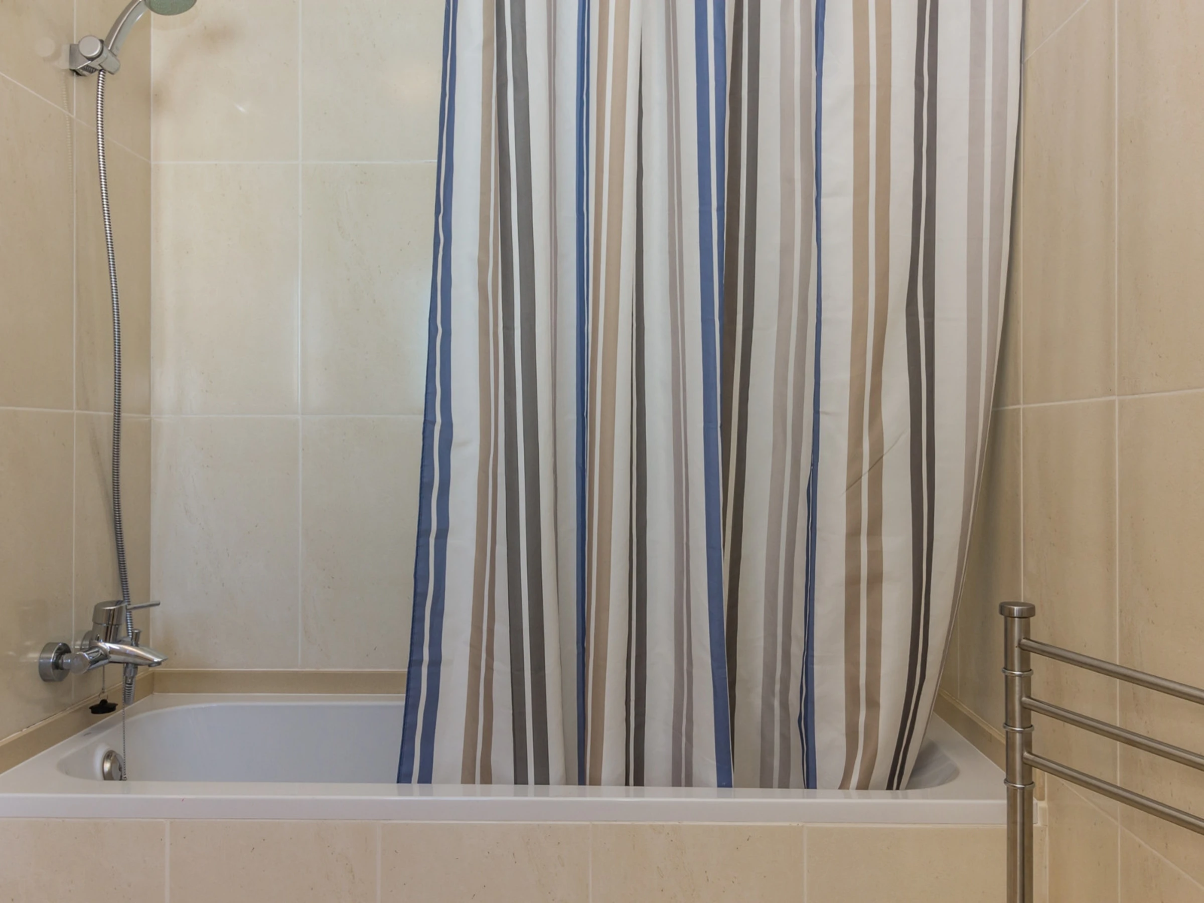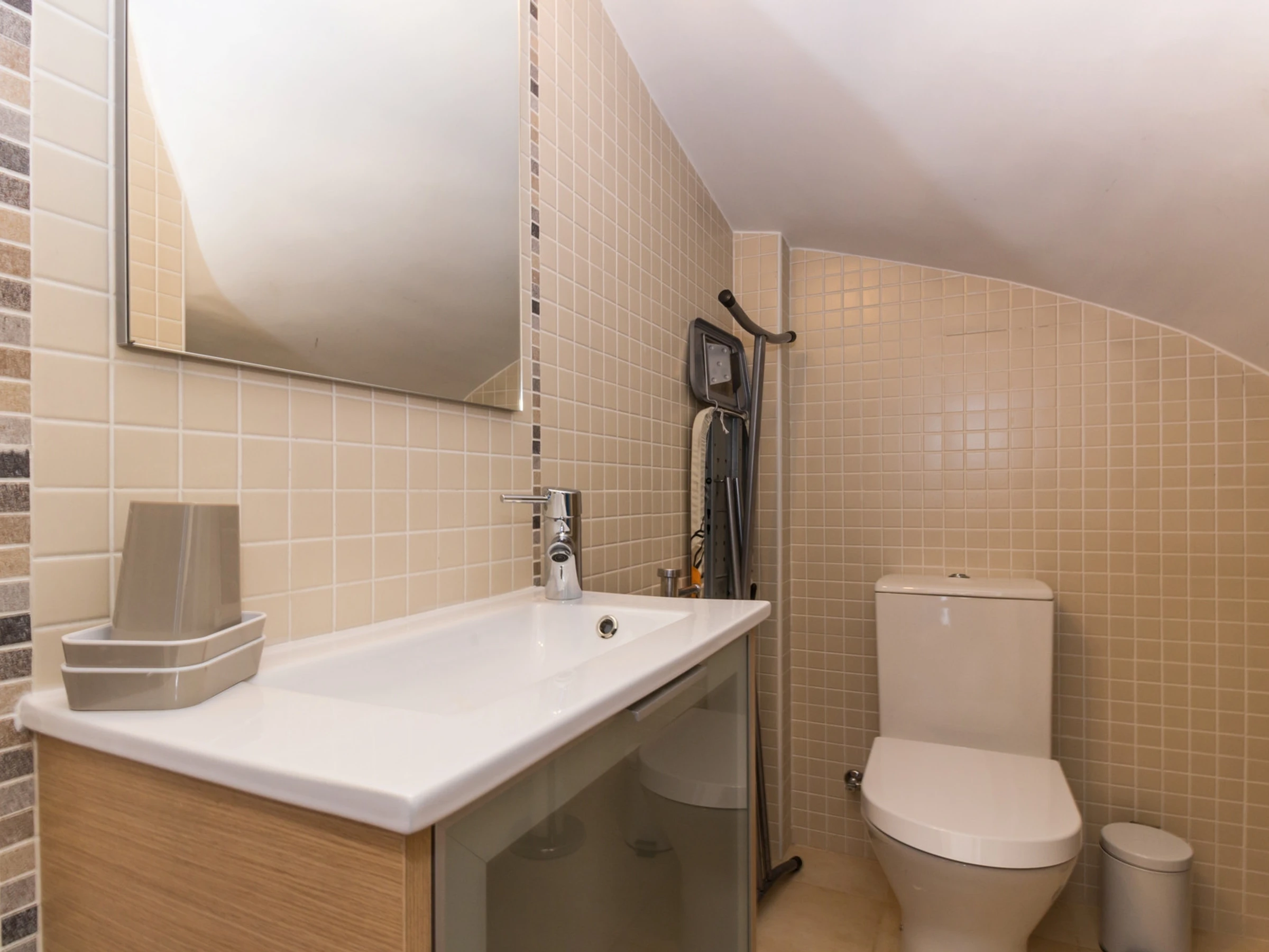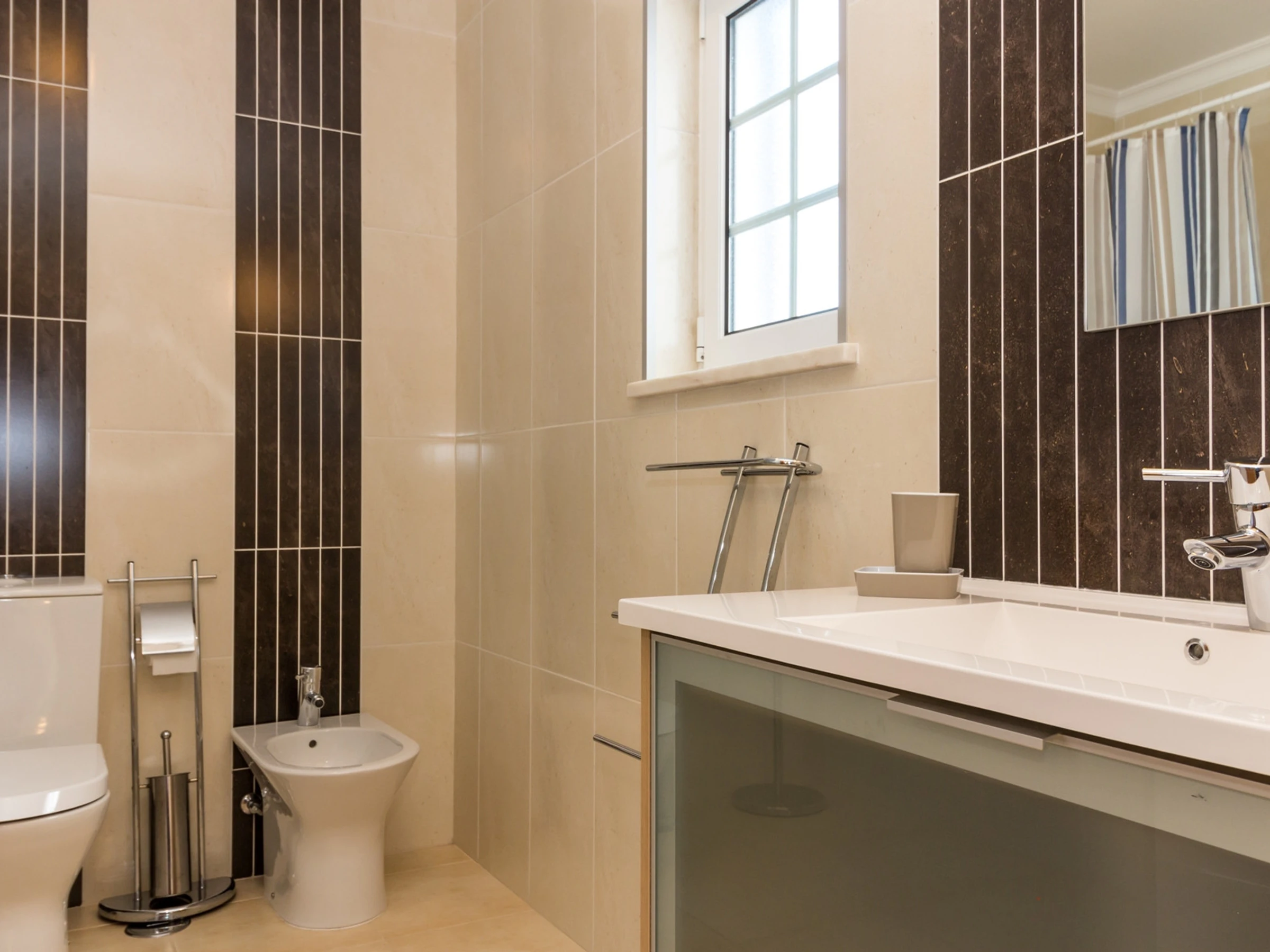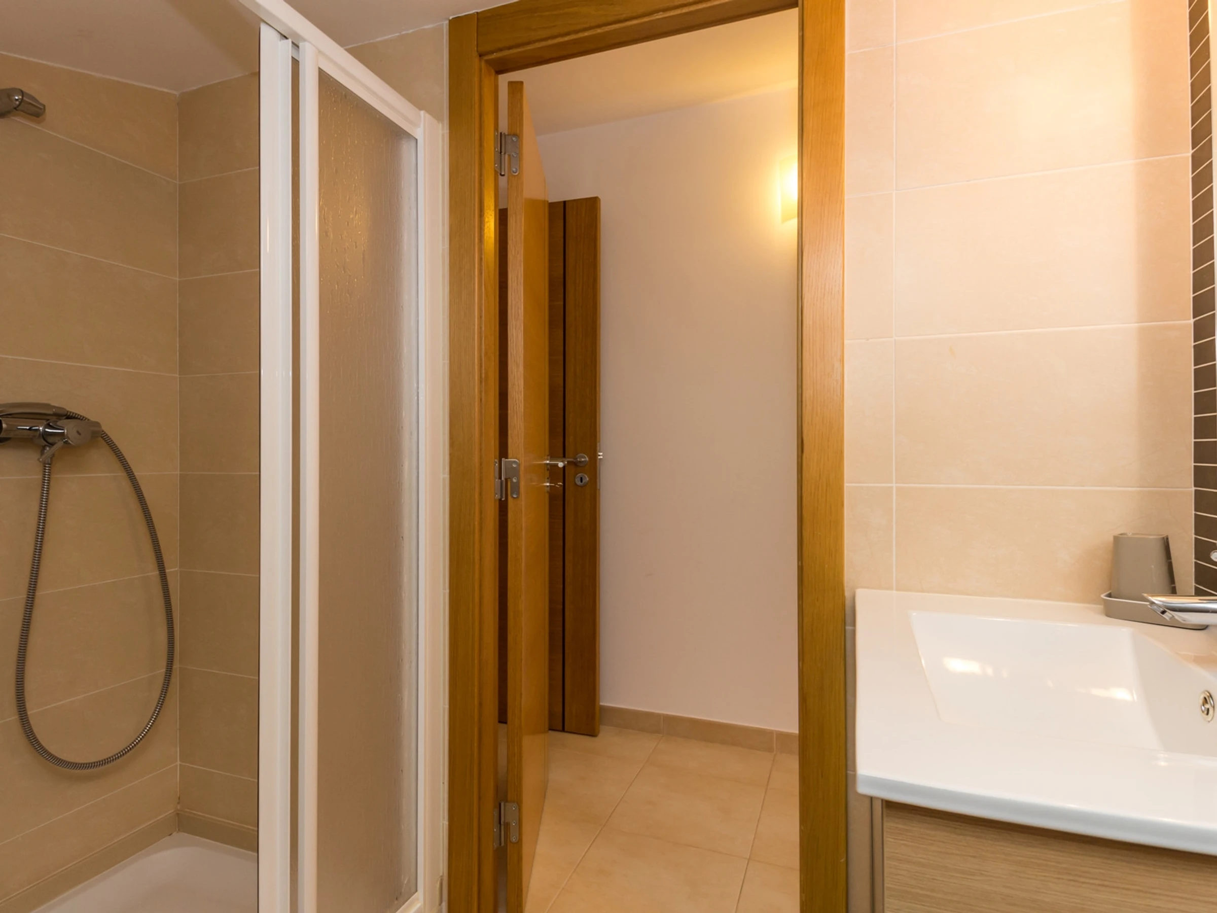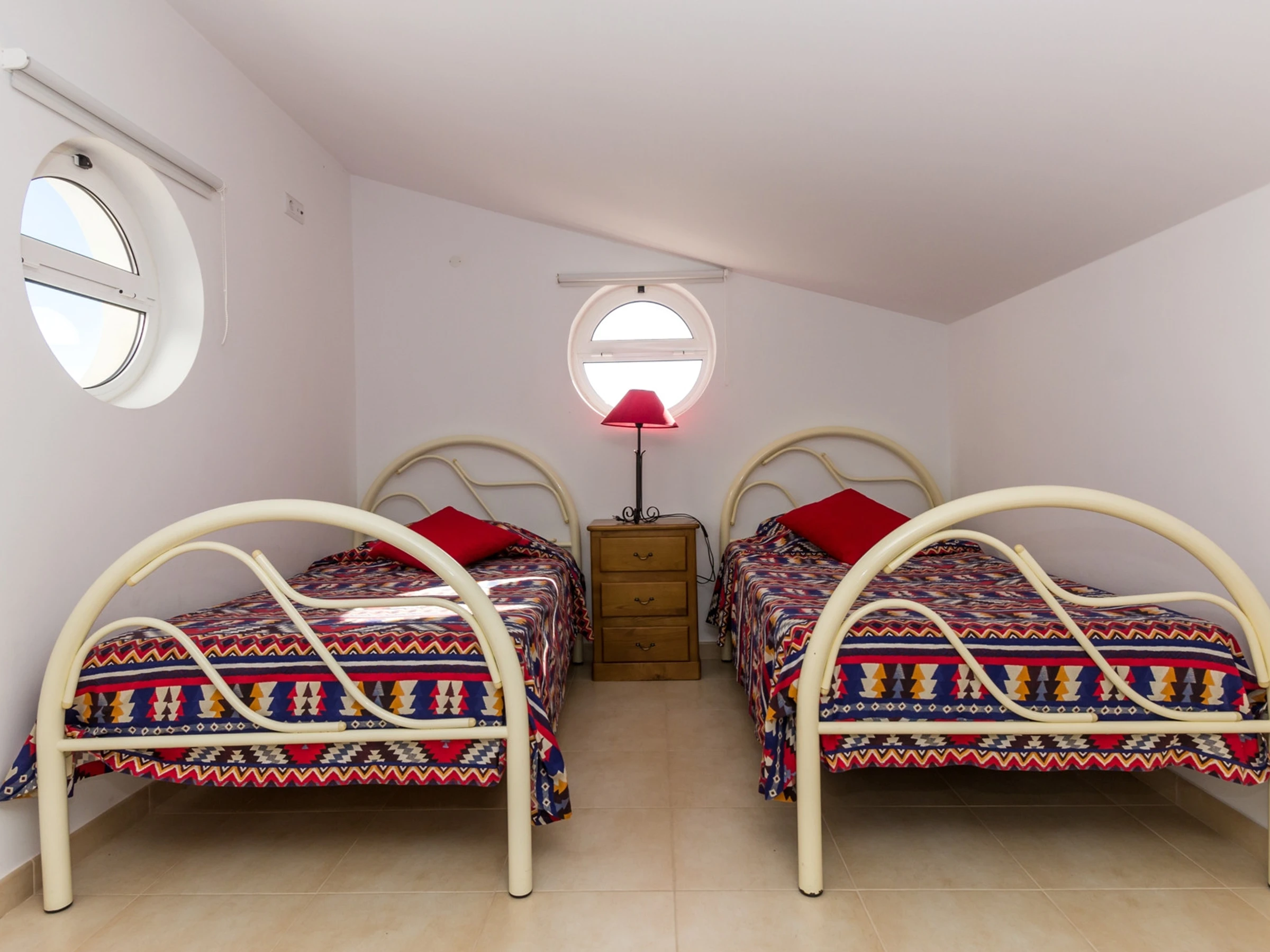 Die erste Etage verfügt über drei Zimmer, davon ein Zimmer mit einem Doppelbett und zwei Zimmer mit Einzelbetten, einschließlich eines Zimmers mit Dusche in der Ecke, sowie ein Familienbadezimmer mit Badewanne. Die gesamte Unterkunft verfügt über Klimaanlage und WLAN, was Komfort und Konnektivität während Ihres Aufenthalts gewährleistet.