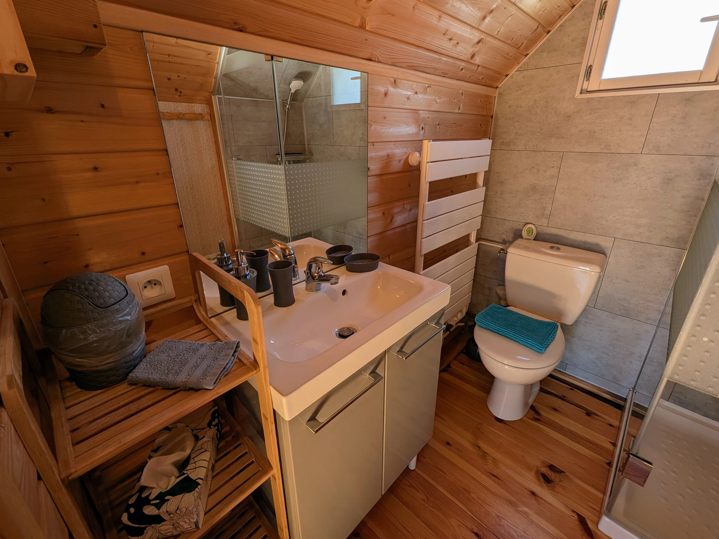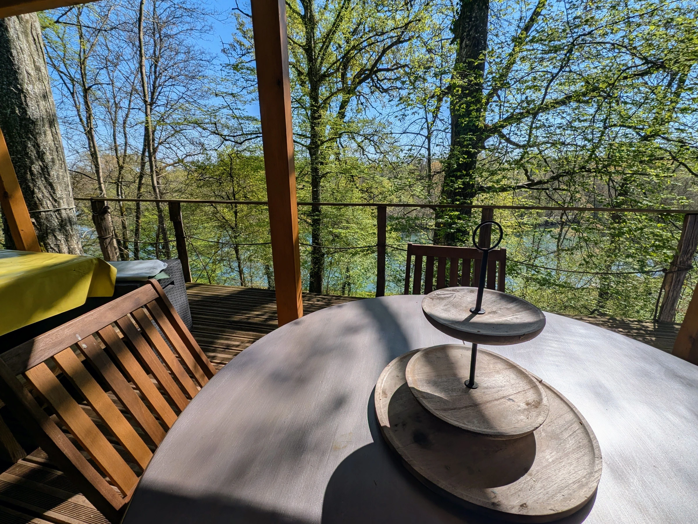 ein Doppelbett (140 x 190), eine Küchenzeile (Herd, Kühlschrank, Spüle), ein Badezimmer mit Dusche, Waschbecken und WC sowie eine große private Terrasse mit Grillplatz, die von hohen Bäumen beschattet wird und Blick auf die Saône bietet.