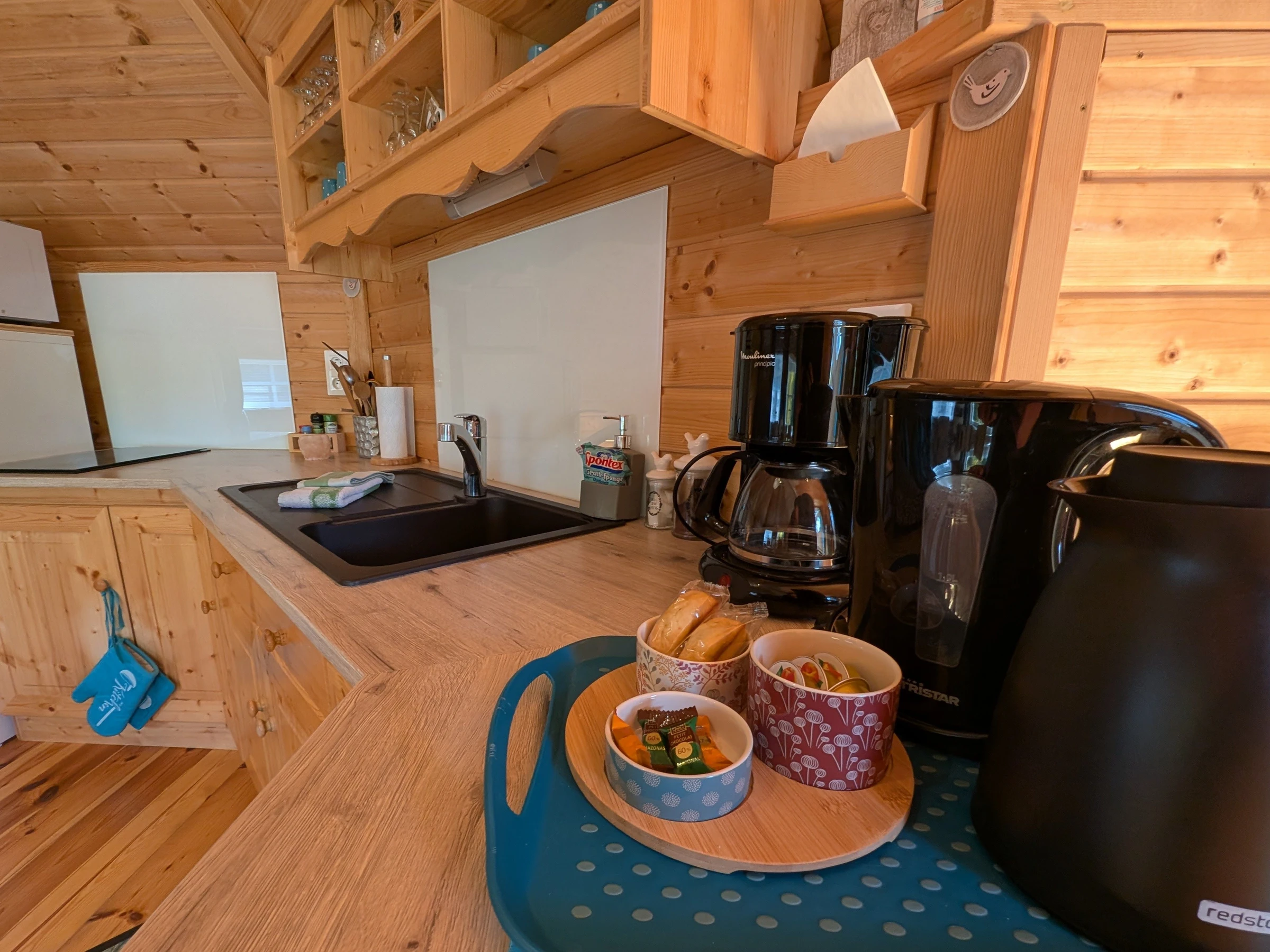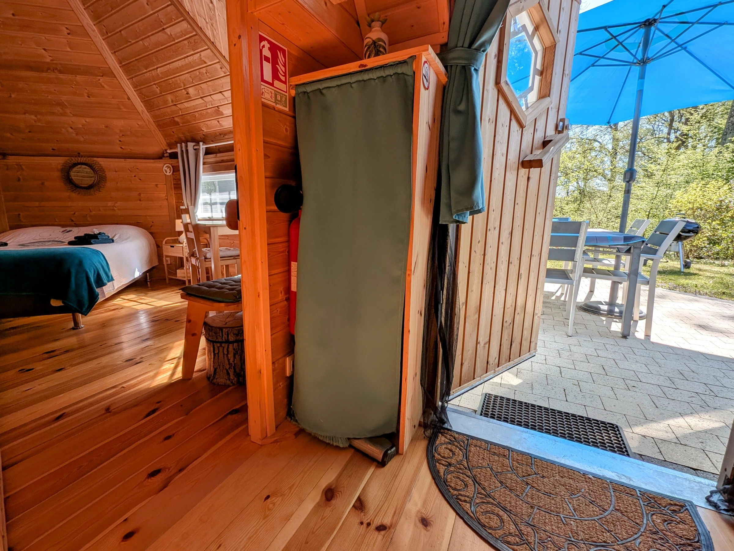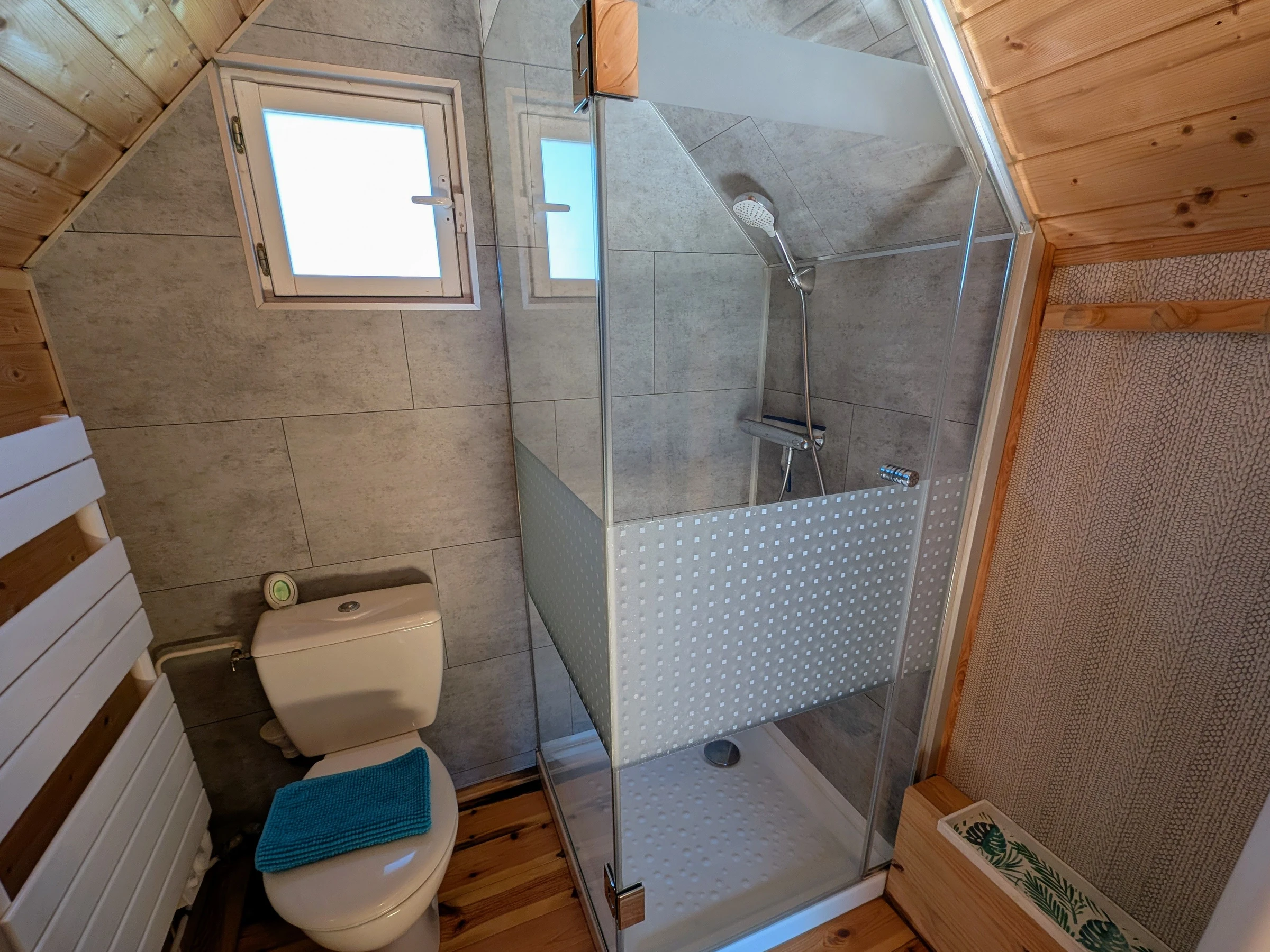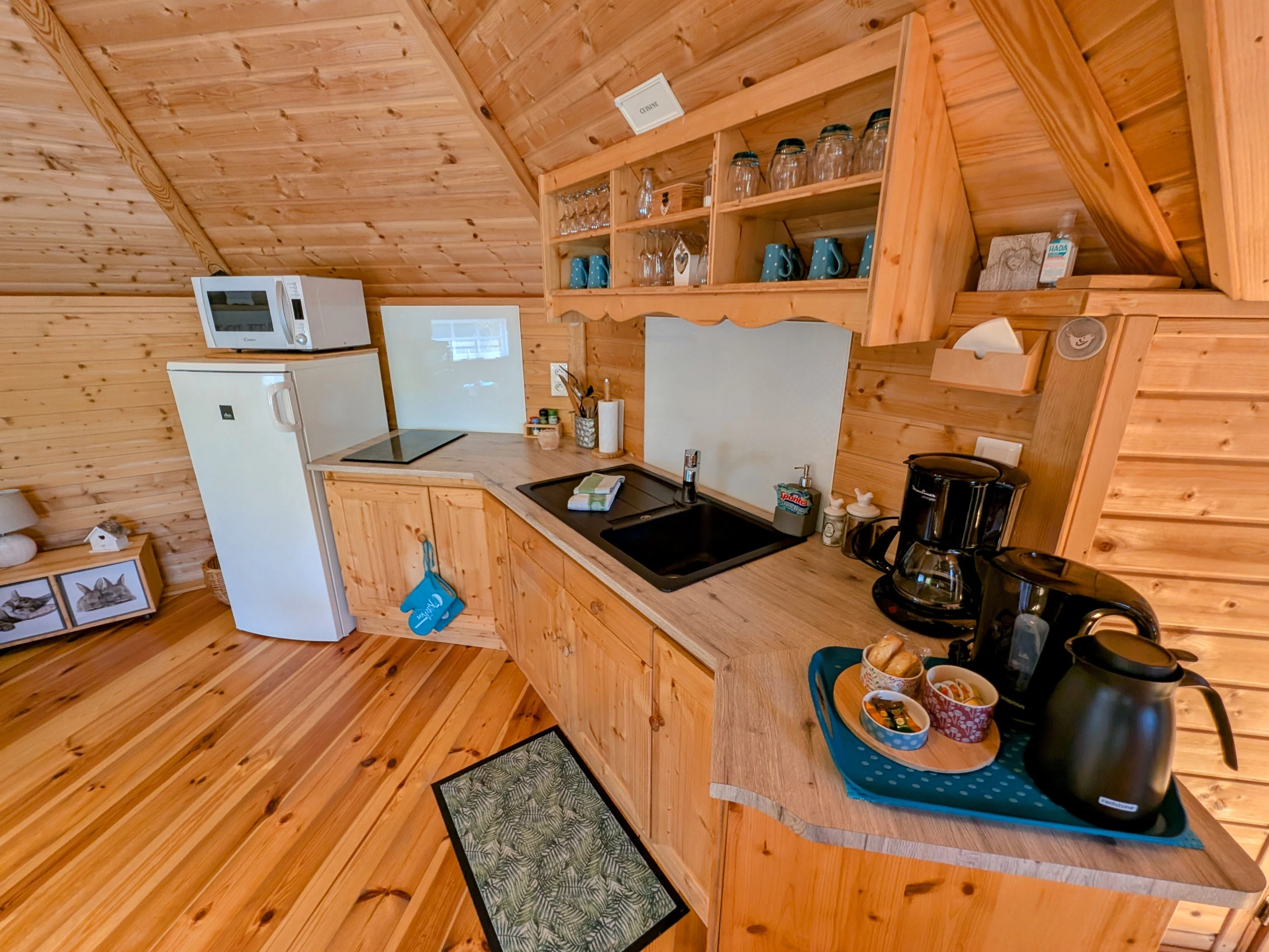 einem Doppelbett (140 x 190), einer funktionalen Küchenzeile (Herd, Kühlschrank, Spüle), einem Badezimmer mit Dusche, Waschbecken und WC sowie einer privaten Terrasse mit Grillplatz, geschützt vor der Vegetation.